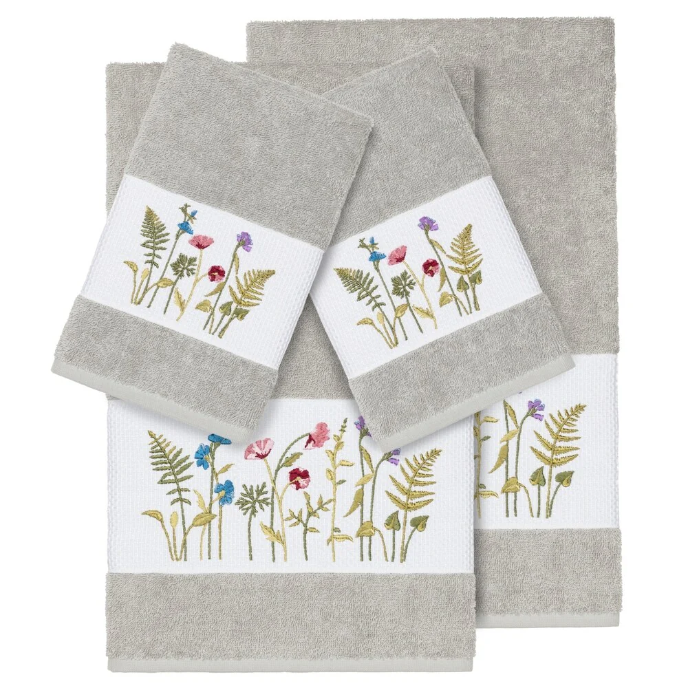This authentic hotel and spa 8-piece towel set is made from plush, high end Turkish cotton for supreme absorbency and durability. The beautiful light grey towels are embellished with a wildflowers applique and embroidery design with a textured woven border to add that special touch to your bathroom.