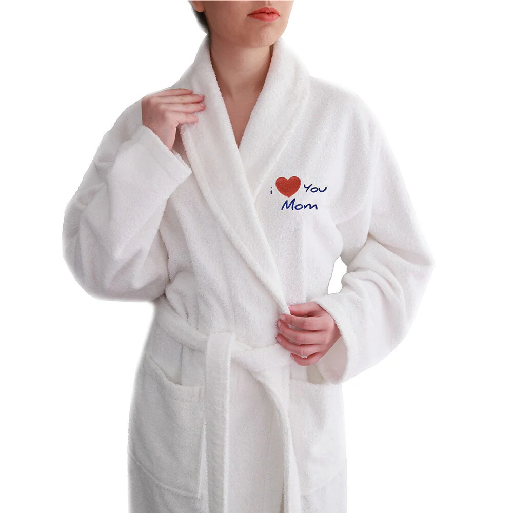 Experience the soft luxury of this authentic hotel and spa terry bathrobe monogrammed just for Mom with an ‘I Heart Mom’ design. Feel pampered and cozy in this below knee length spa style robe that features long sleeves and two patch pockets.