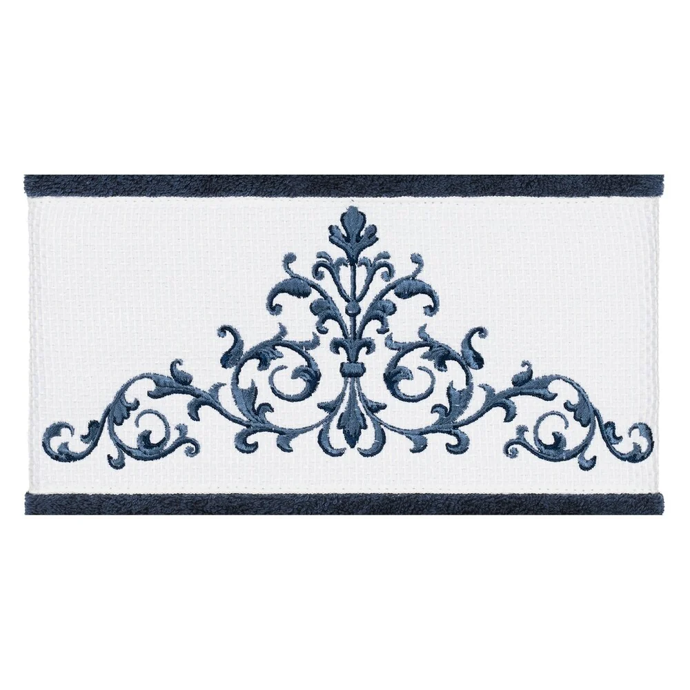These authentic hotel and spa bath towels are made from plush, high end Turkish cotton for supreme absorbency and durability. The beautiful midnight blue towels are embellished with a scrollwork applique and embroidery design with a textured woven border to add that special touch to your bathroom.