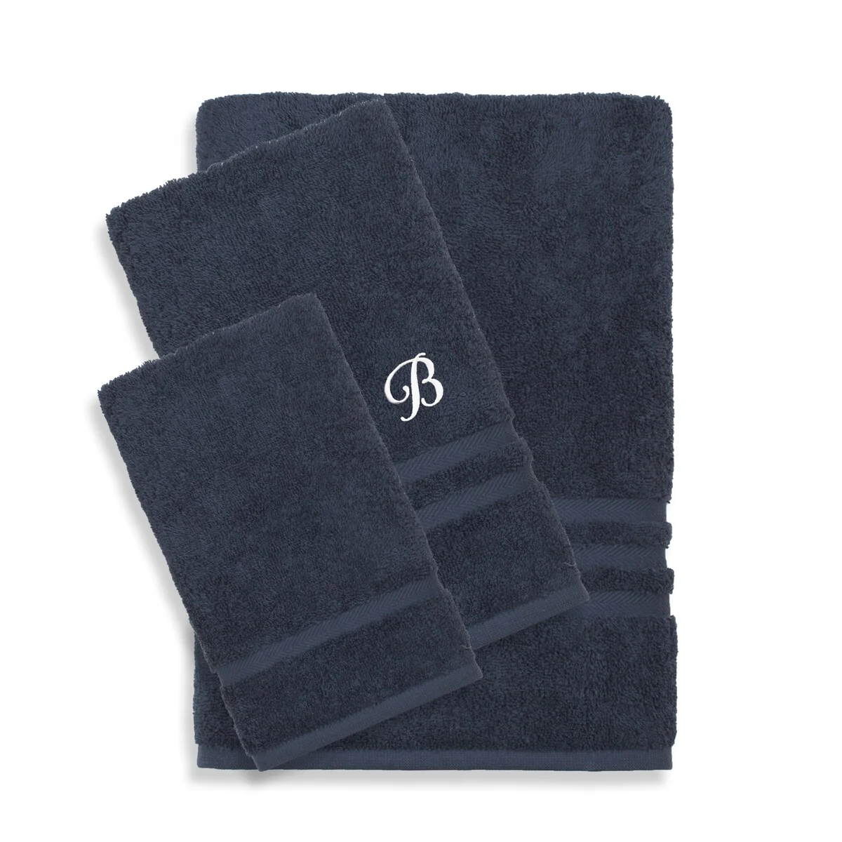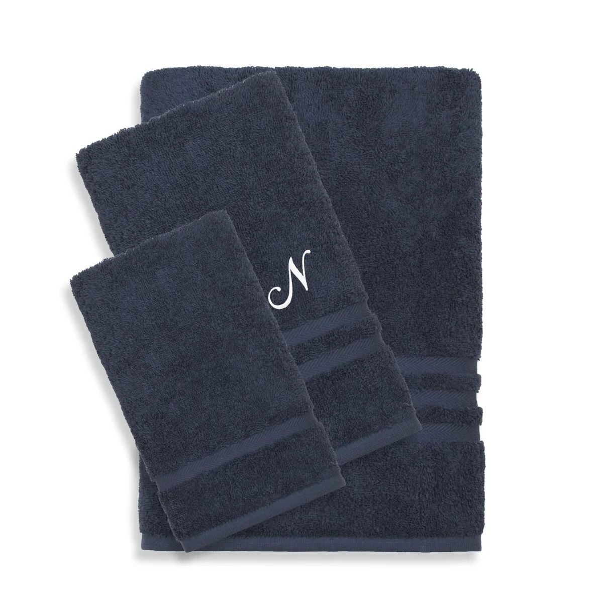 Authentic Hotel and Spa Omni Turkish Cotton Terry 3-piece Navy Blue Bath Towel Set with White Script Monogrammed Initial