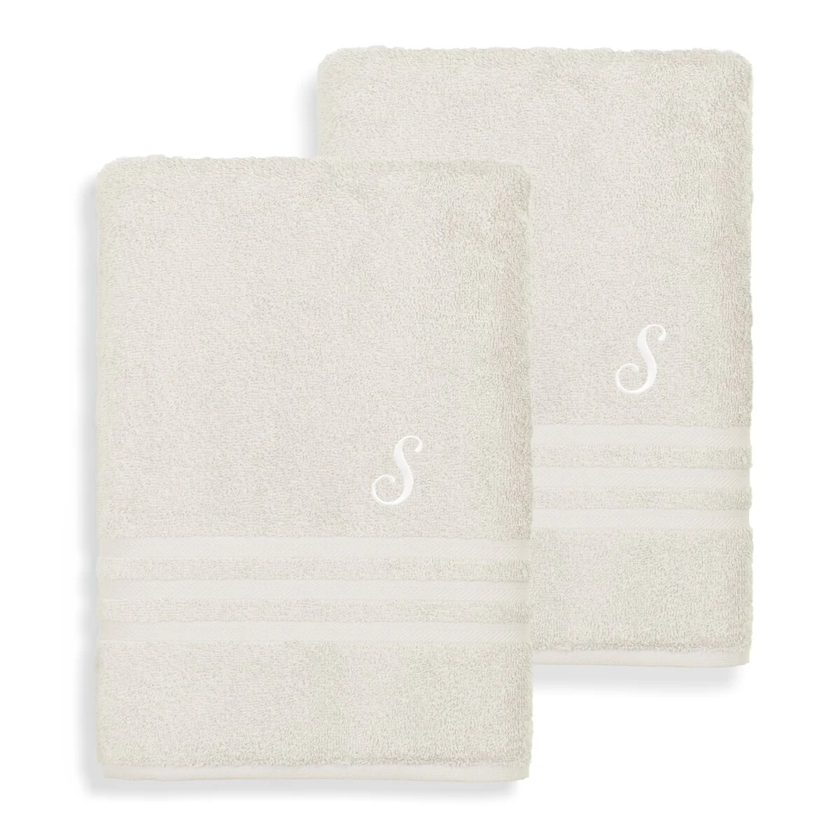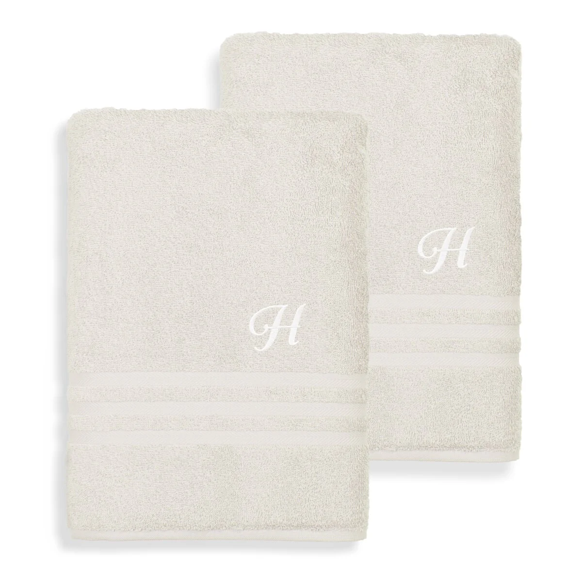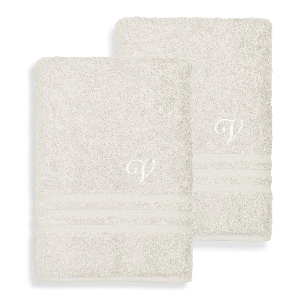 Treat your visitors to hotel-like pampering when you provide your guest room with this set of two luxurious cream bath towels. Made using 100 percent Turkish cotton, these towels are embroidered with a white script initial for a personal touch.