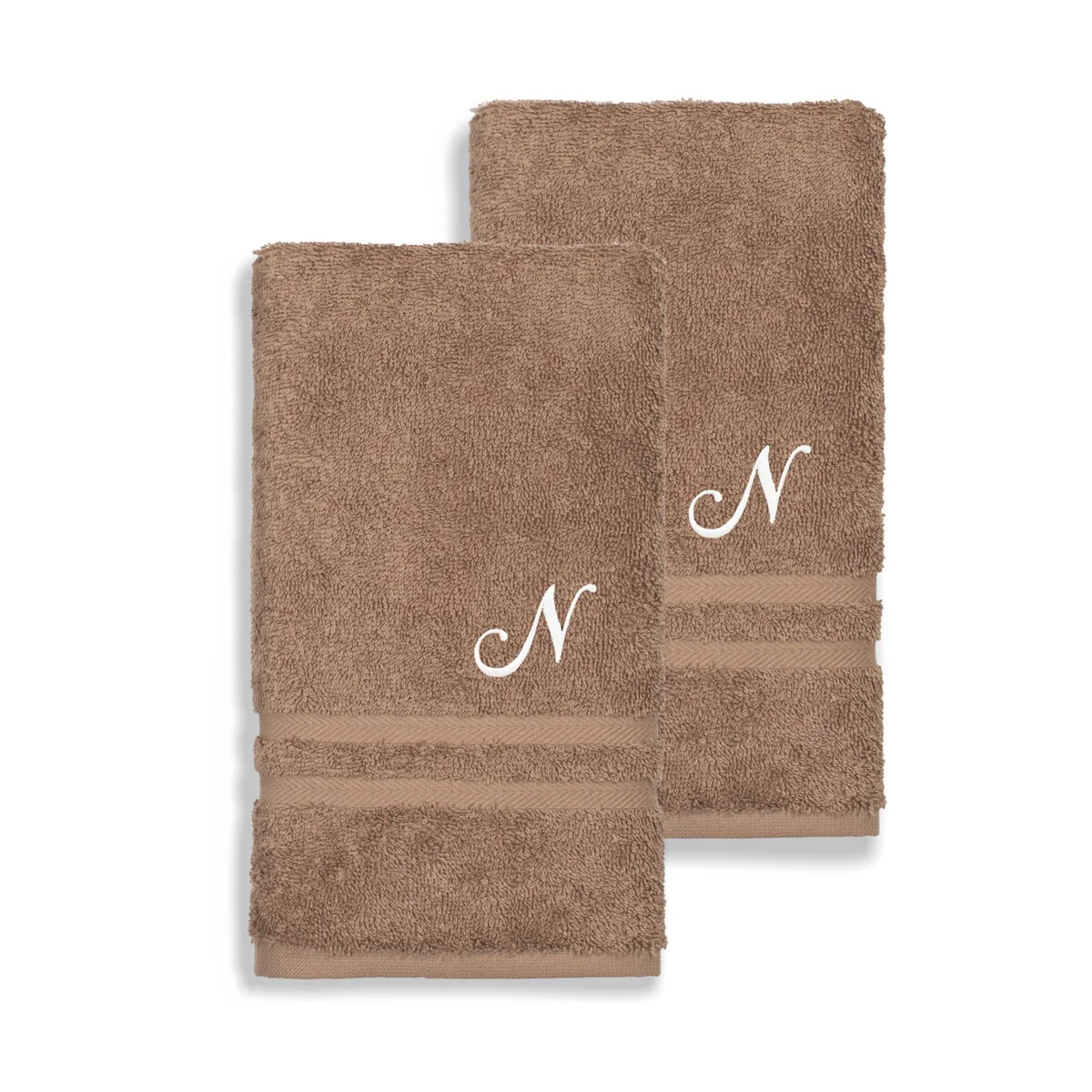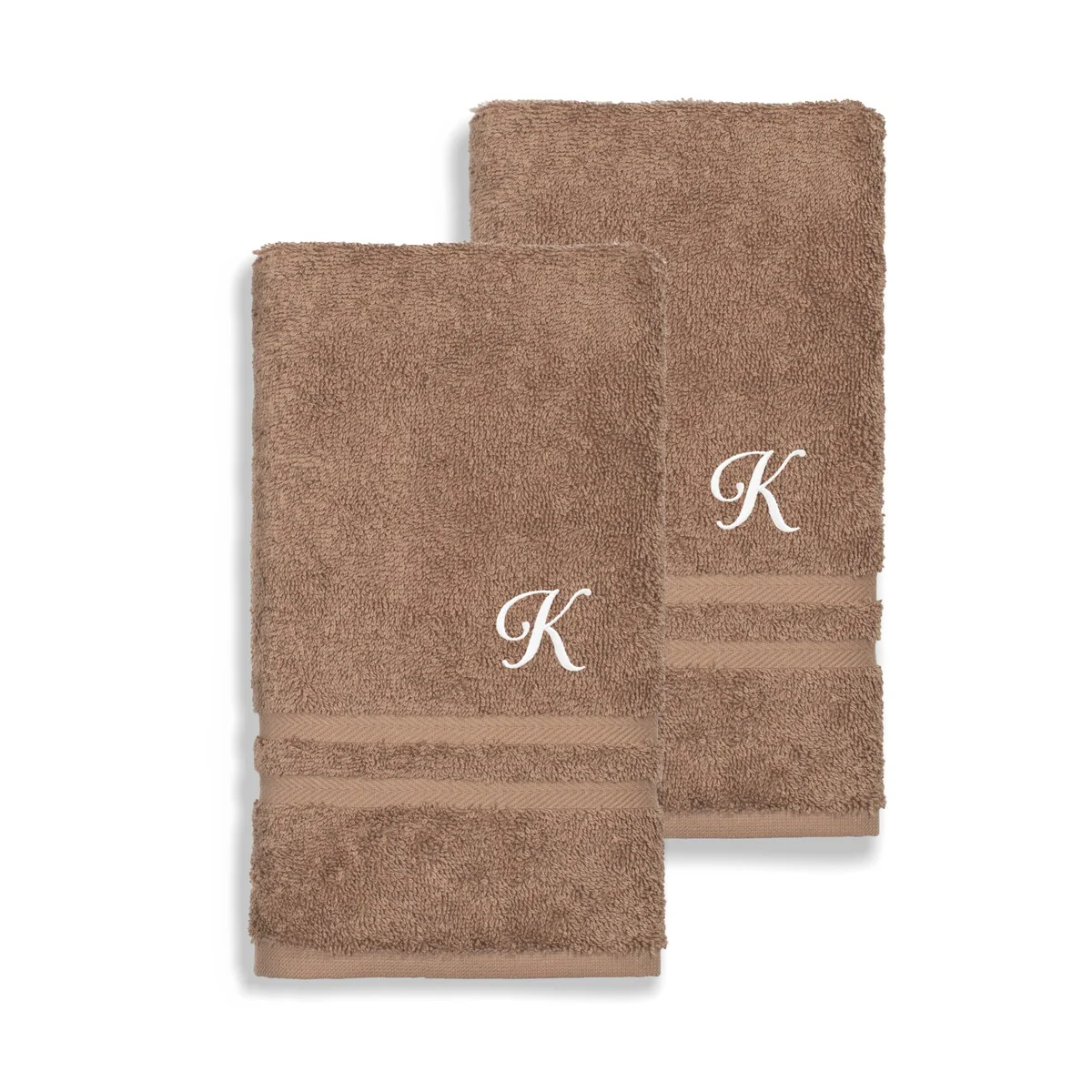 Welcome spa-quality luxury into your bathroom with this pair of Turkish cotton hand towels. These thick towels provide exceptional absorbency due to 100-percent Turkish cotton material, and their softness enhances with repeated use. Personalize these latte brown hand cloths with white monogrammed initials, while enjoying easy care and cleaning with machine washing.