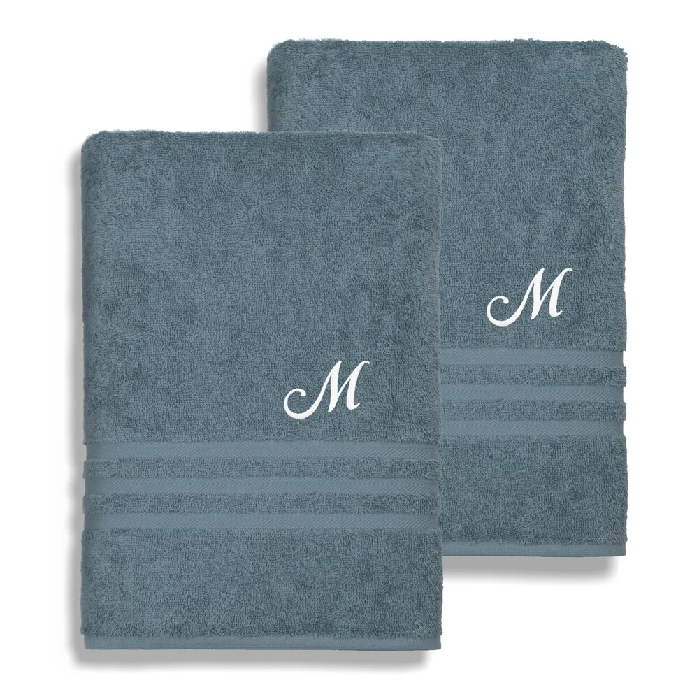 Luxuriate in absorbent bathroom comfort with these hotel and spa hand towels. Crafted from fine Turkish cotton, this two-piece set features elegant navy coloring and a customizable white monogram for a personalized hand-drying experience.