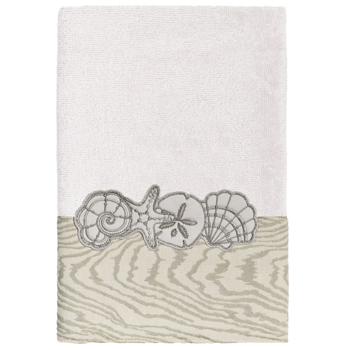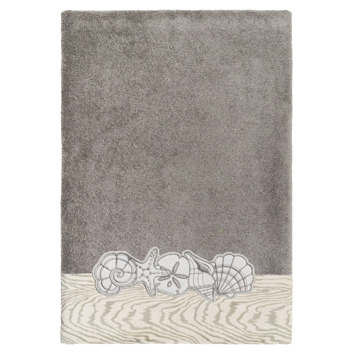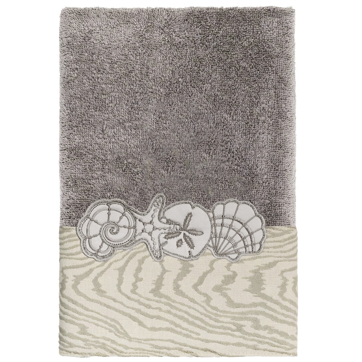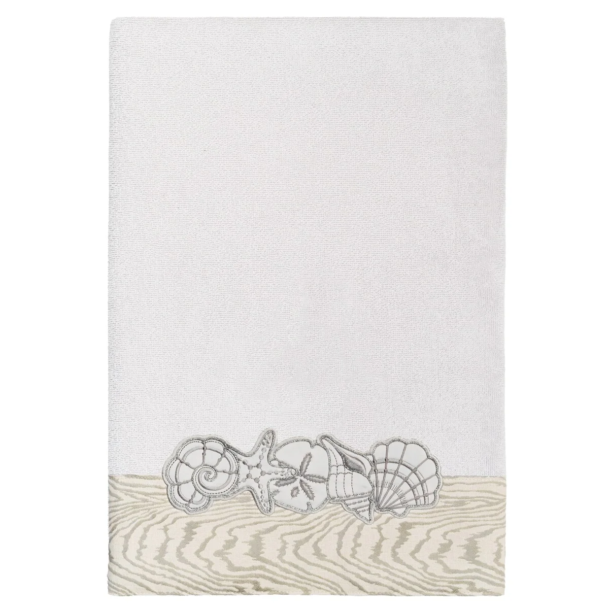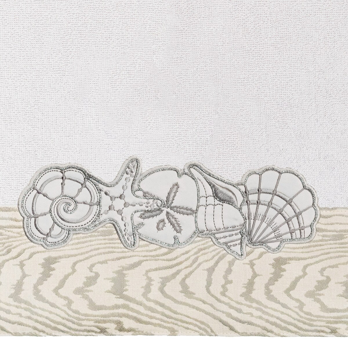 Your bath decor is not complete without a set of beautiful embroidered towels by Authentic Hotel and Spa for the comfort of your family and guests. The Shell Row towels feature sparkling applique seashells on a weathered woodgrain pattern jacquard border. Cloud soft and super absorbent, these luxurious, durable towels keep their plush appearance after washing. This collection is available in 8 elegant colors: White, Beige, Blush, Aqua, Silver, Cocoa, Charcoal and Marine. The Shell Row Towel Collection brings seaside spirit and richness to your home decor and makes a great gift.