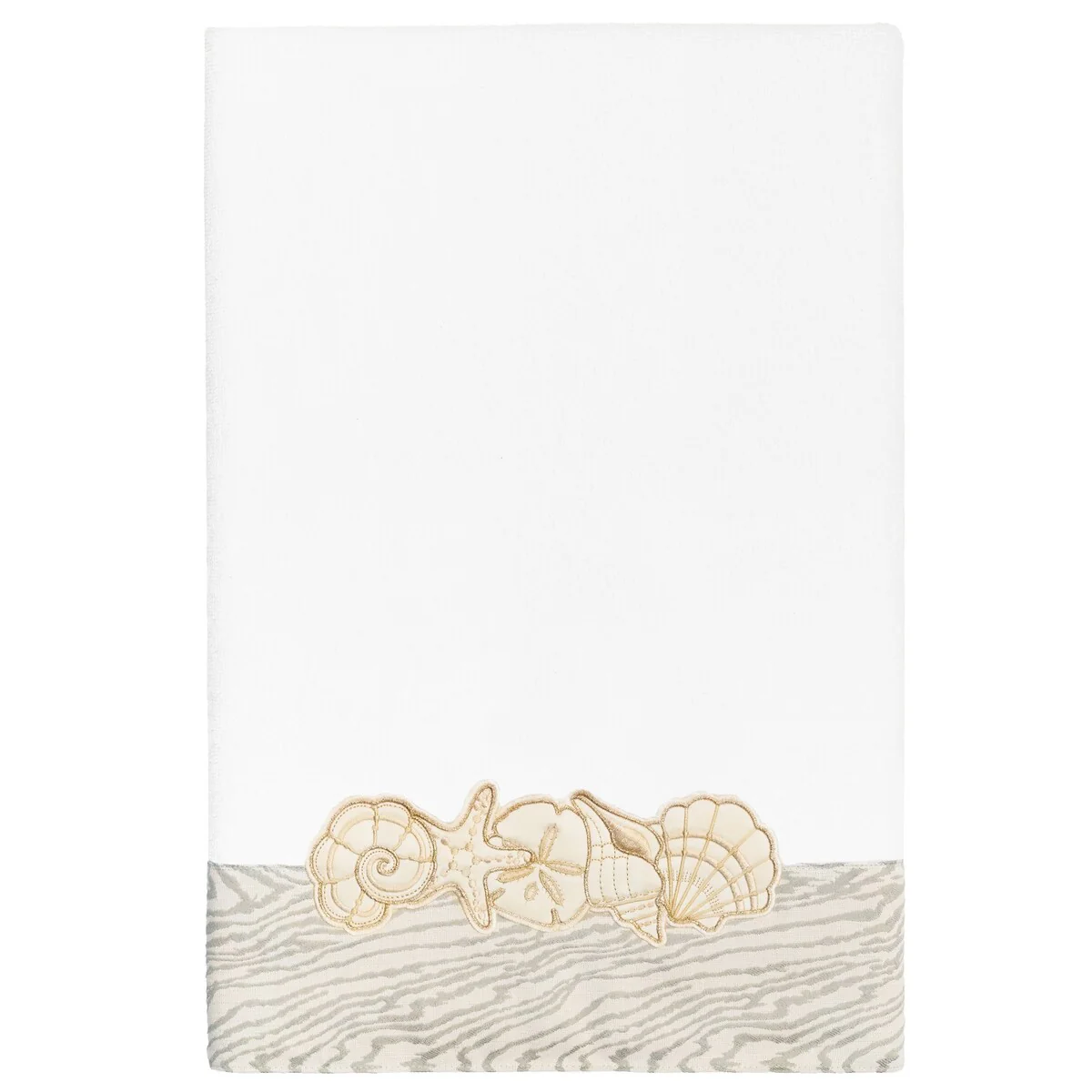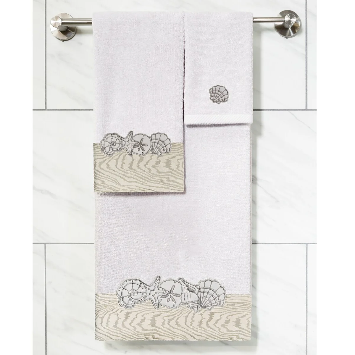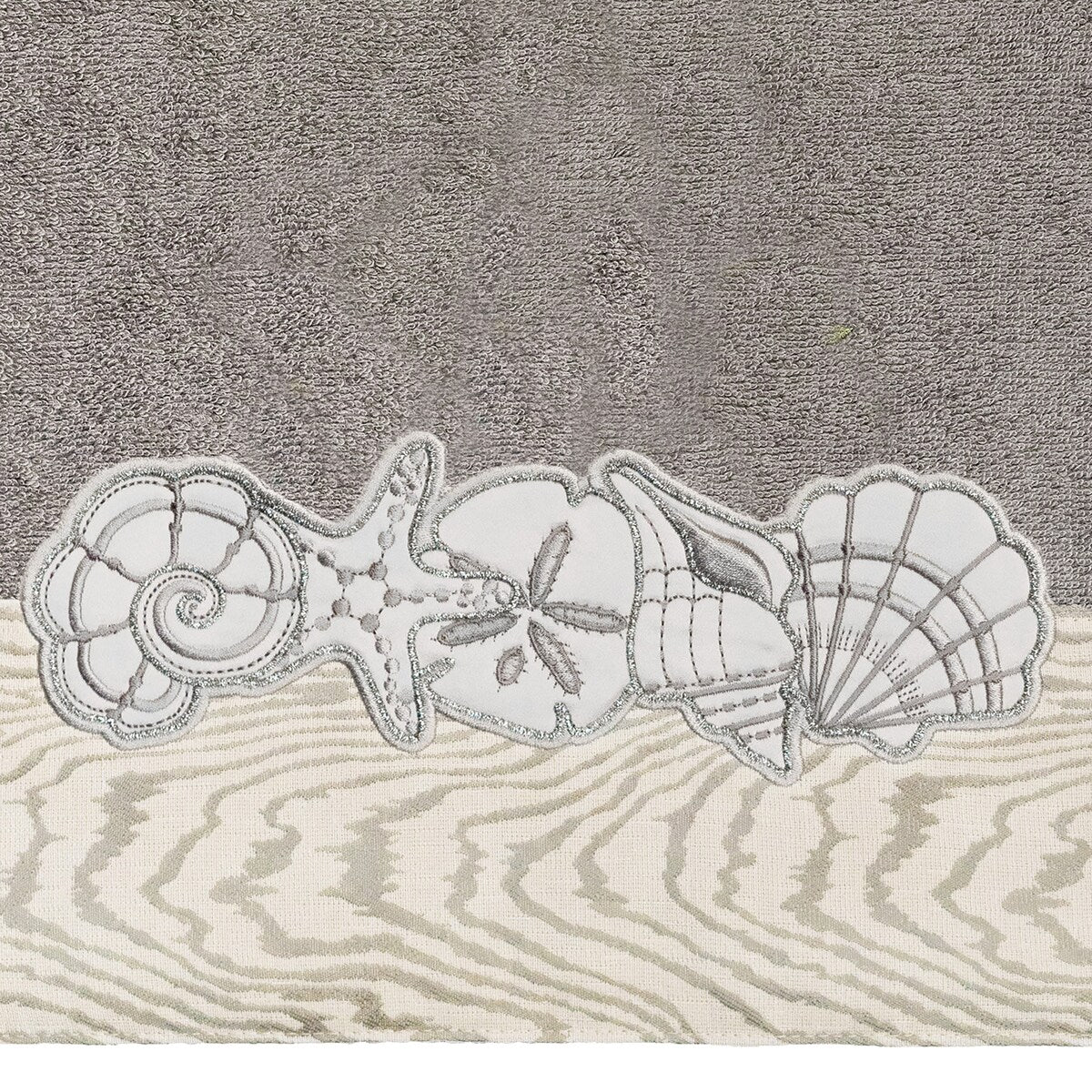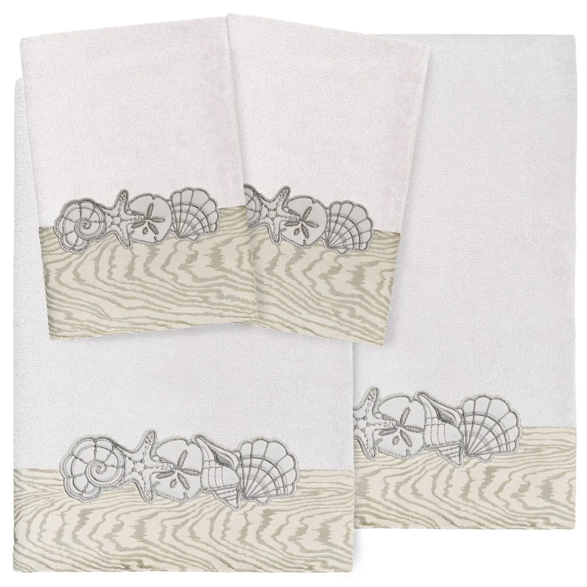Your bath decor is not complete without a set of beautiful embroidered towels by Authentic Hotel and Spa for the comfort of your family and guests. The Shell Row towels feature sparkling applique seashells on a weathered woodgrain pattern jacquard border. Cloud soft and super absorbent, these luxurious, durable towels keep their plush appearance after washing. This collection is available in 8 elegant colors: White, Beige, Blush, Aqua, Silver, Cocoa, Charcoal and Marine. The Shell Row Towel Collection brings seaside spirit and richness to your home decor and makes a great gift.