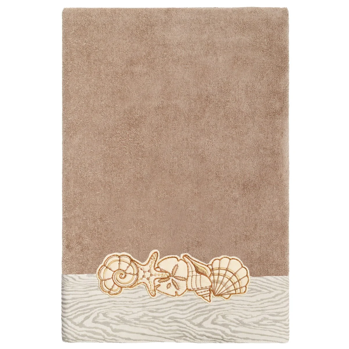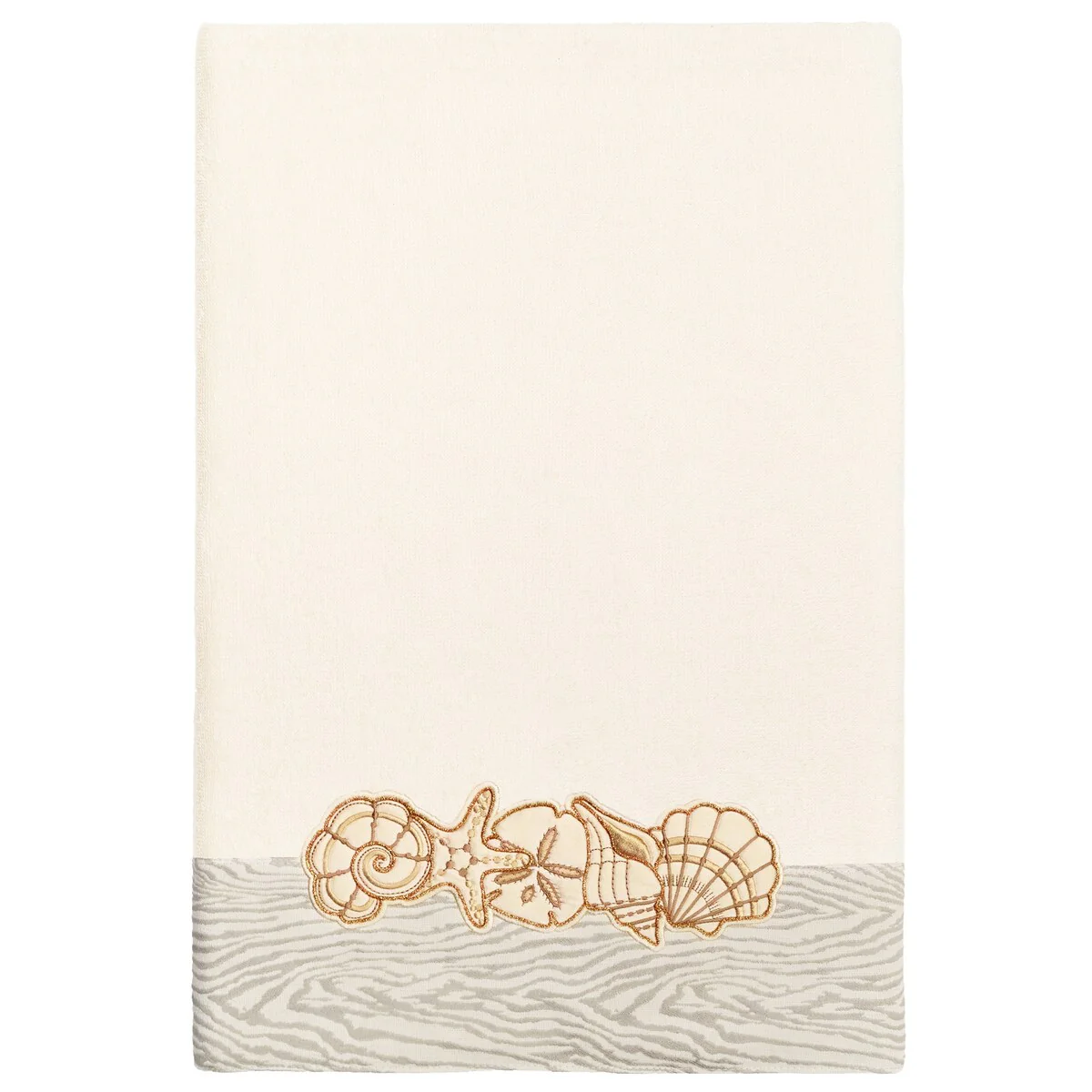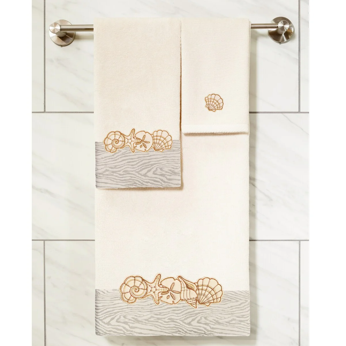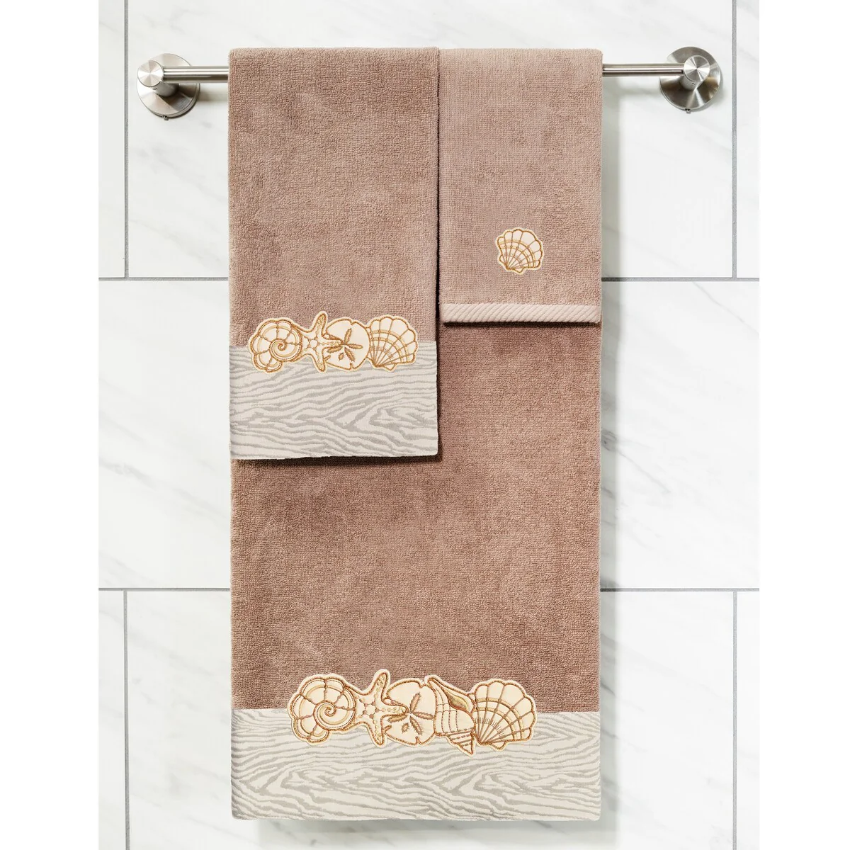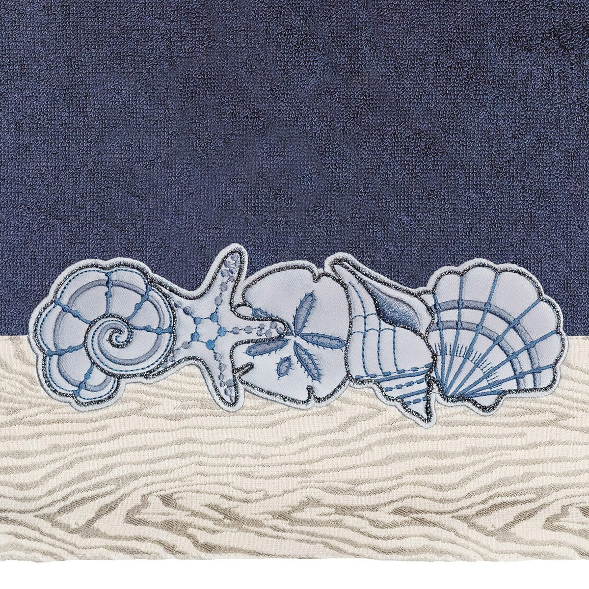 Your bath decor is not complete without a set of beautiful embroidered towels by Authentic Hotel and Spa for the comfort of your family and guests. The Shell Row towels feature sparkling applique seashells on a weathered woodgrain pattern jacquard border. Cloud soft and super absorbent, these luxurious, durable towels keep their plush appearance after washing. This collection is available in 8 elegant colors: White, Beige, Blush, Aqua, Silver, Cocoa, Charcoal and Marine. The Shell Row Towel Collection brings seaside spirit and richness to your home decor and makes a great gift.