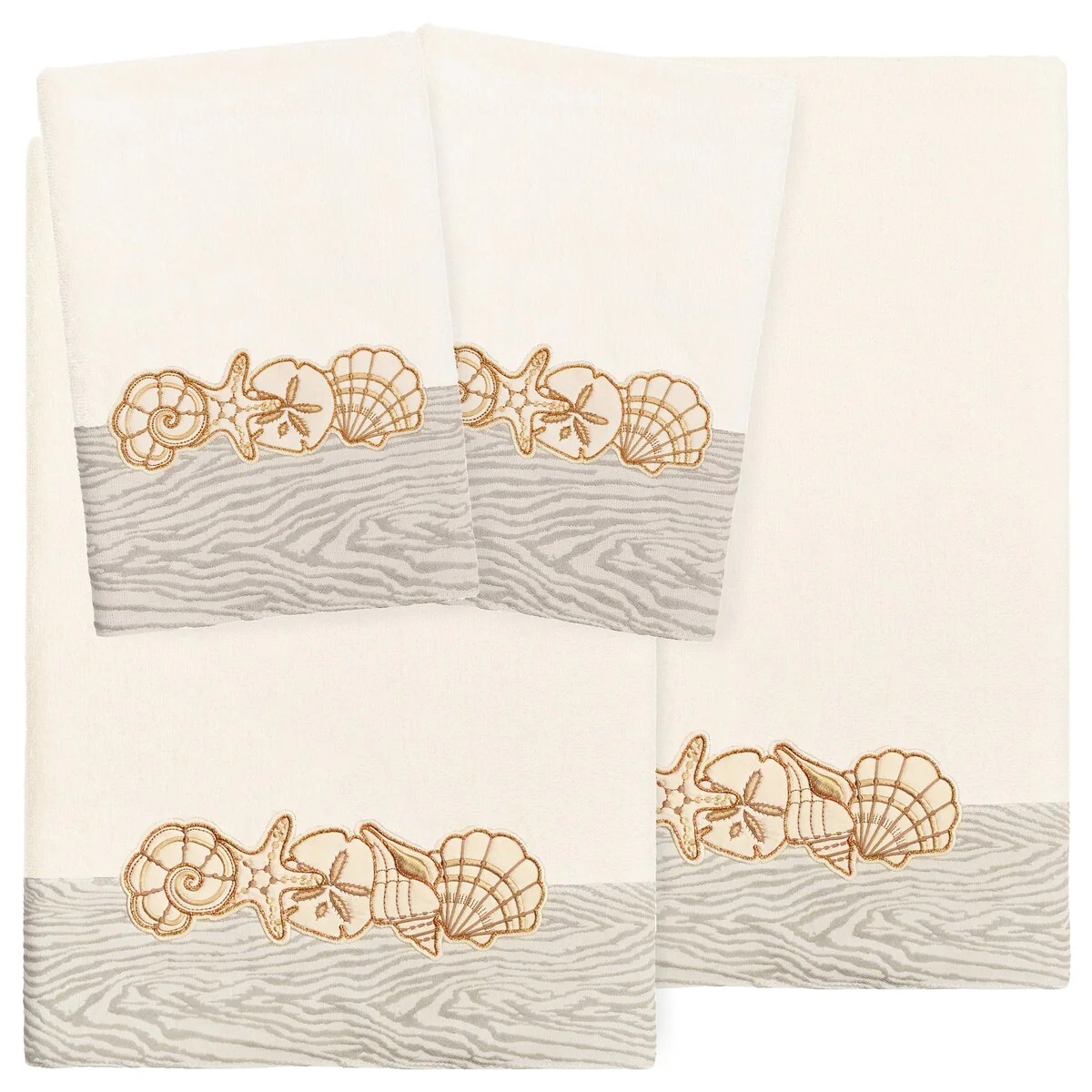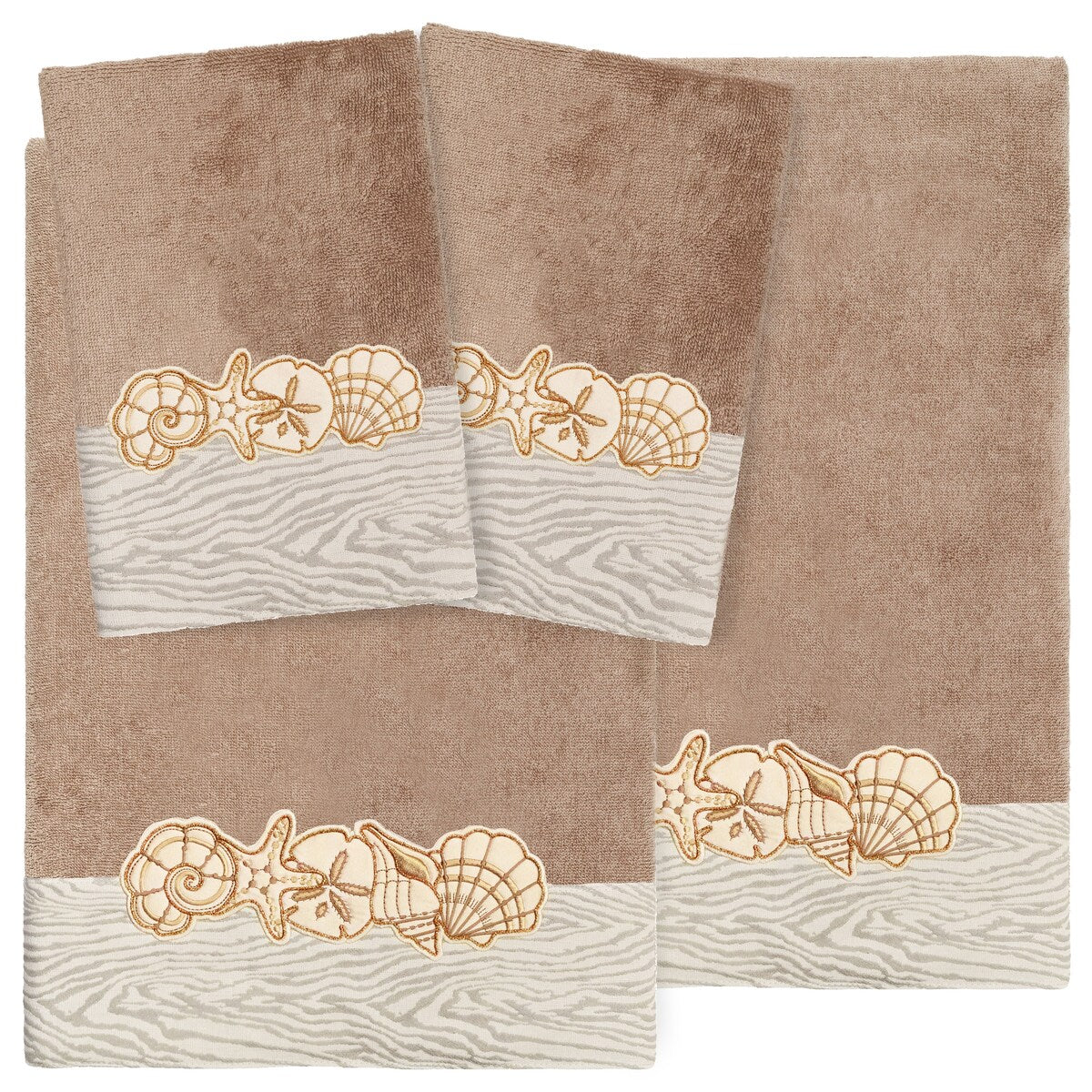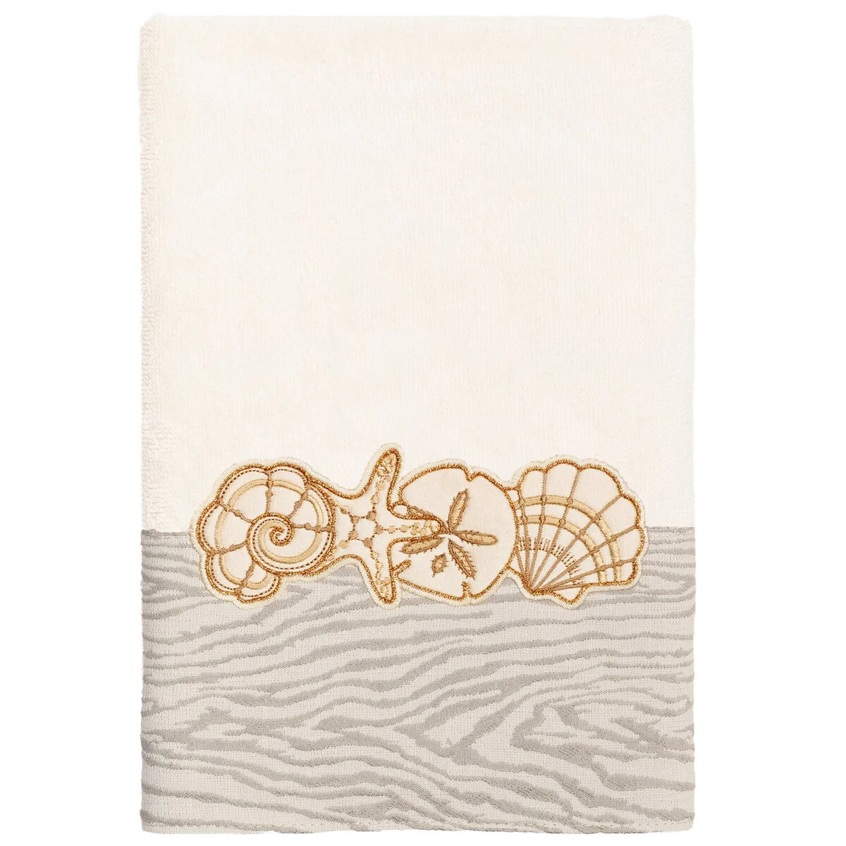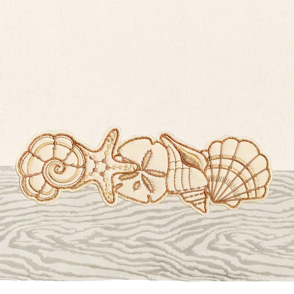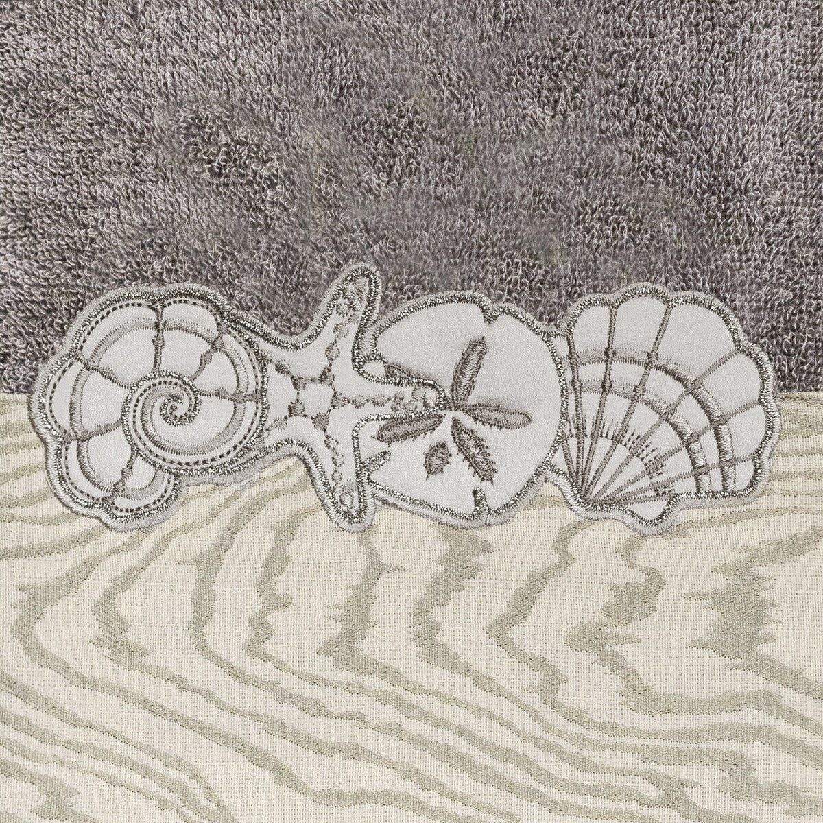 Your bath decor is not complete without a set of beautiful embroidered towels by Authentic Hotel and Spa for the comfort of your family and guests. The Shell Row towels feature sparkling applique seashells on a weathered woodgrain pattern jacquard border. Cloud soft and super absorbent, these luxurious, durable towels keep their plush appearance after washing. This collection is available in 8 elegant colors: White, Beige, Blush, Aqua, Silver, Cocoa, Charcoal and Marine. The Shell Row Towel Collection brings seaside spirit and richness to your home decor and makes a great gift.