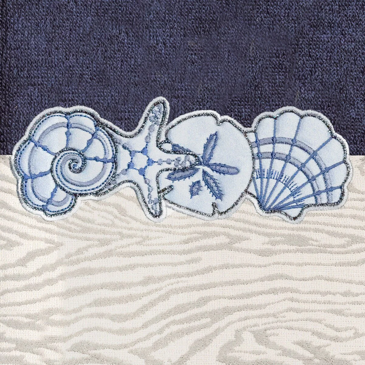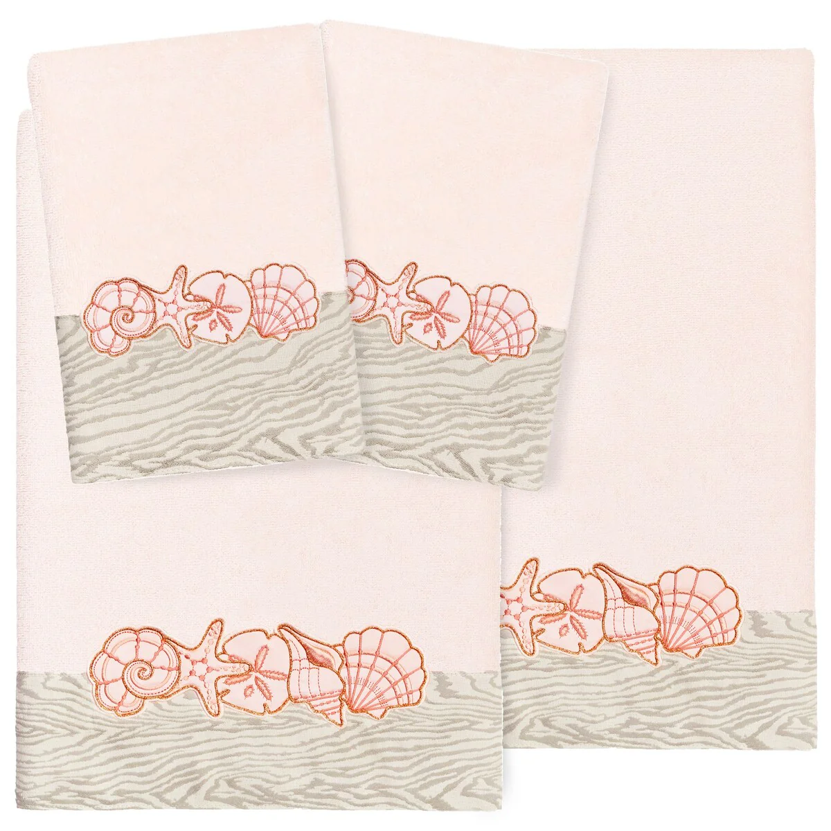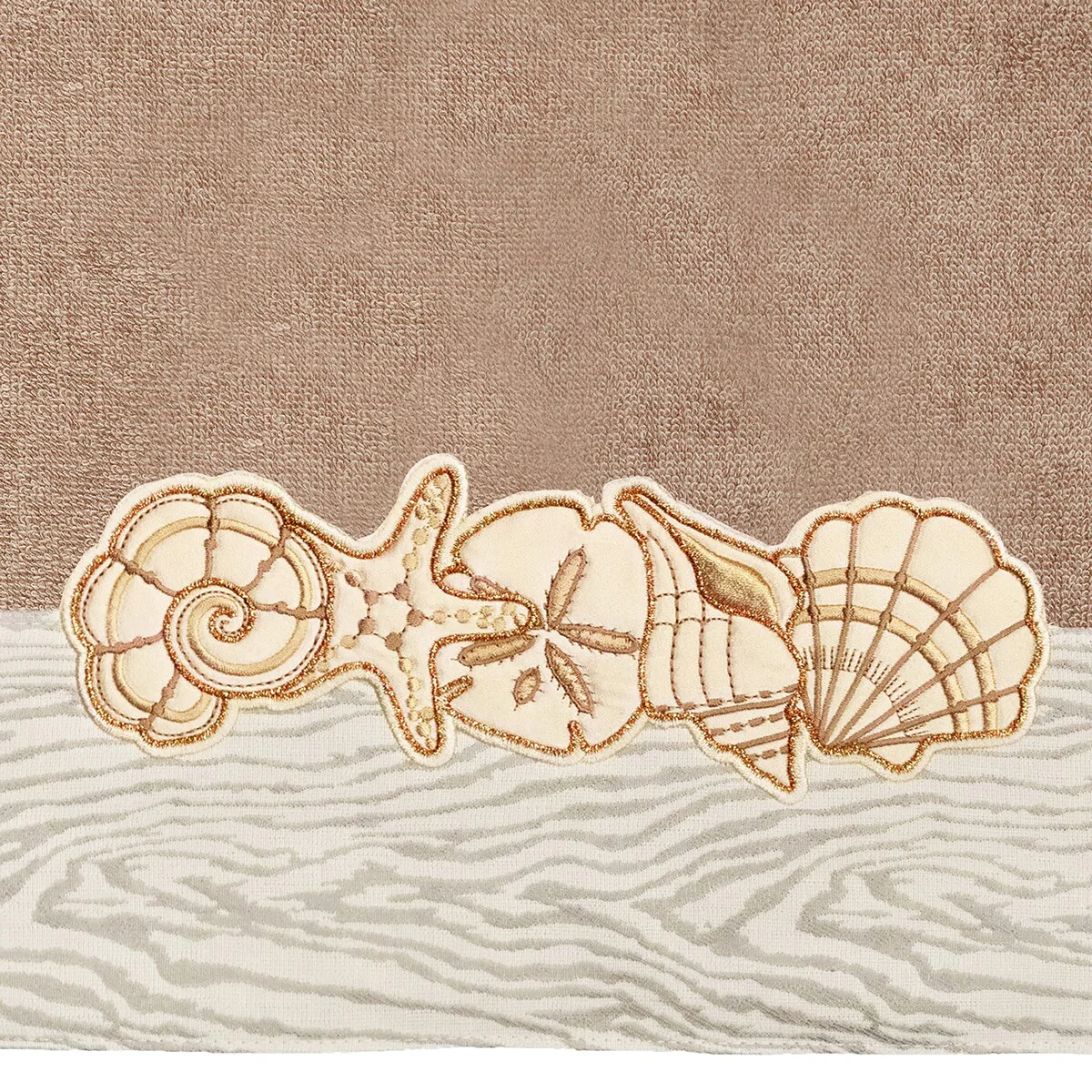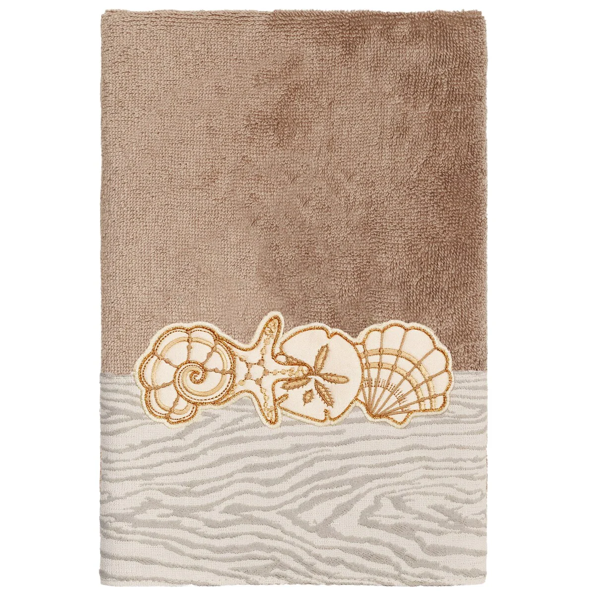 Your bath decor is not complete without a set of beautiful embroidered towels by Authentic Hotel and Spa for the comfort of your family and guests. The Shell Row towels feature sparkling applique seashells on a weathered woodgrain pattern jacquard border. Cloud soft and super absorbent, these luxurious, durable towels keep their plush appearance after washing. This collection is available in 8 elegant colors: White, Beige, Blush, Aqua, Silver, Cocoa, Charcoal and Marine. The Shell Row Towel Collection brings seaside spirit and richness to your home decor and makes a great gift.
