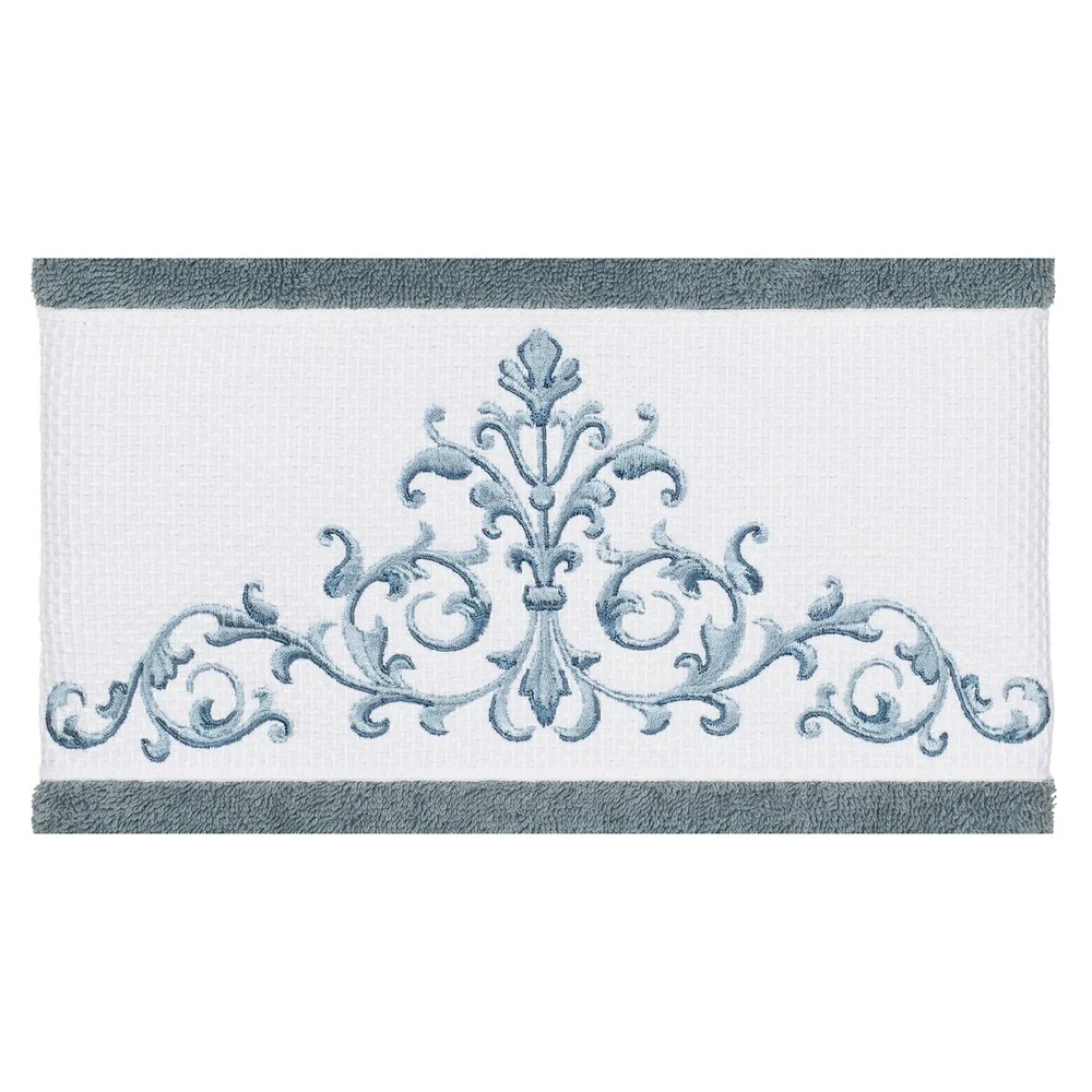 These authentic hotel and spa bath towels are made from plush, high end Turkish cotton for supreme absorbency and durability. The beautiful teal blue towels are embellished with a scrollwork applique and embroidery design with a textured woven border to add that special touch to your bathroom.