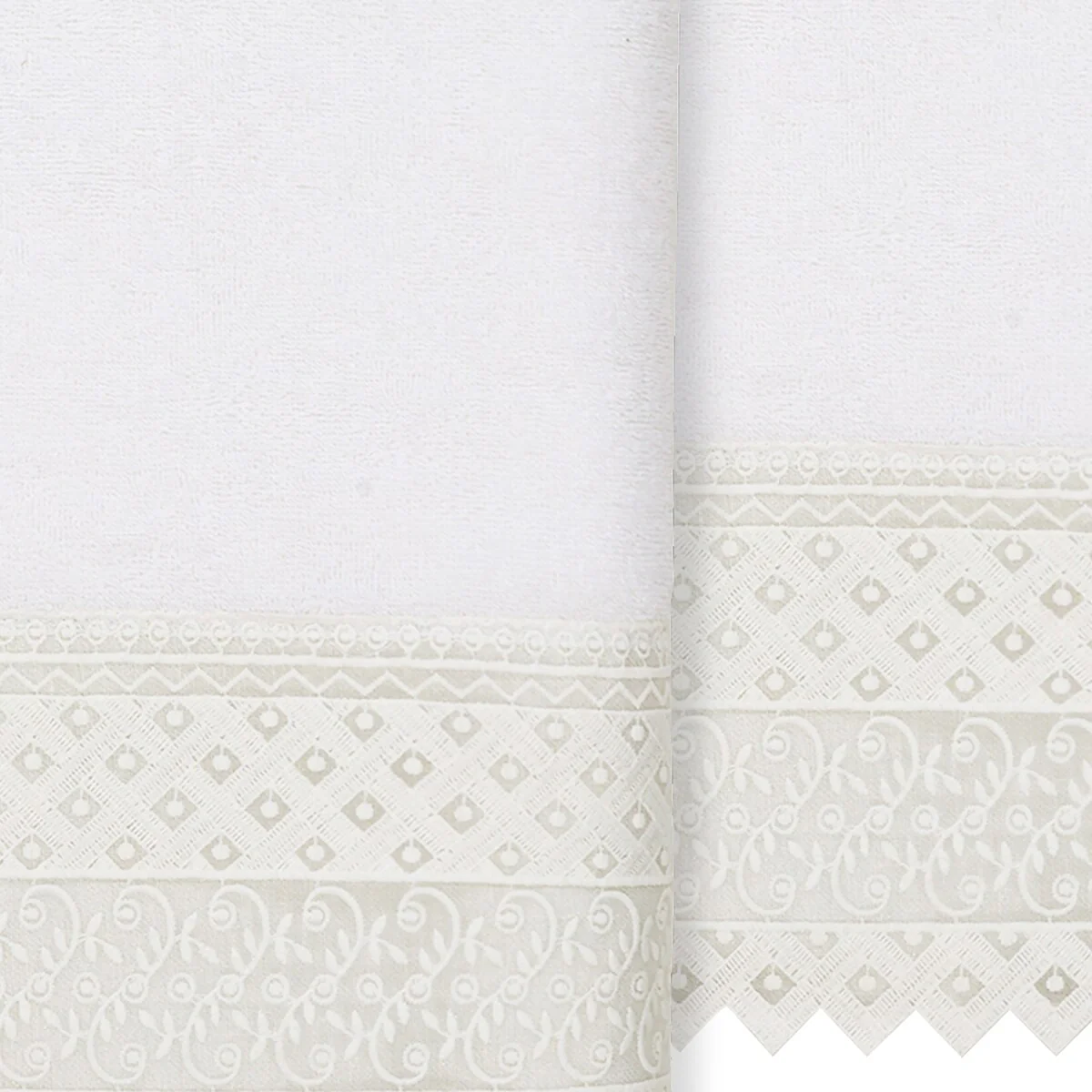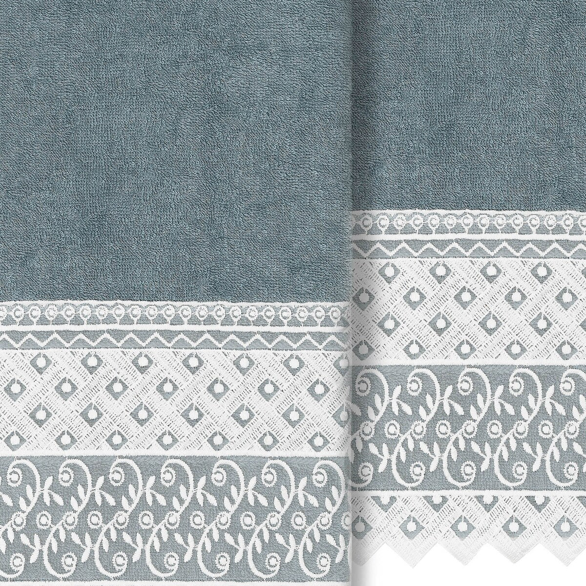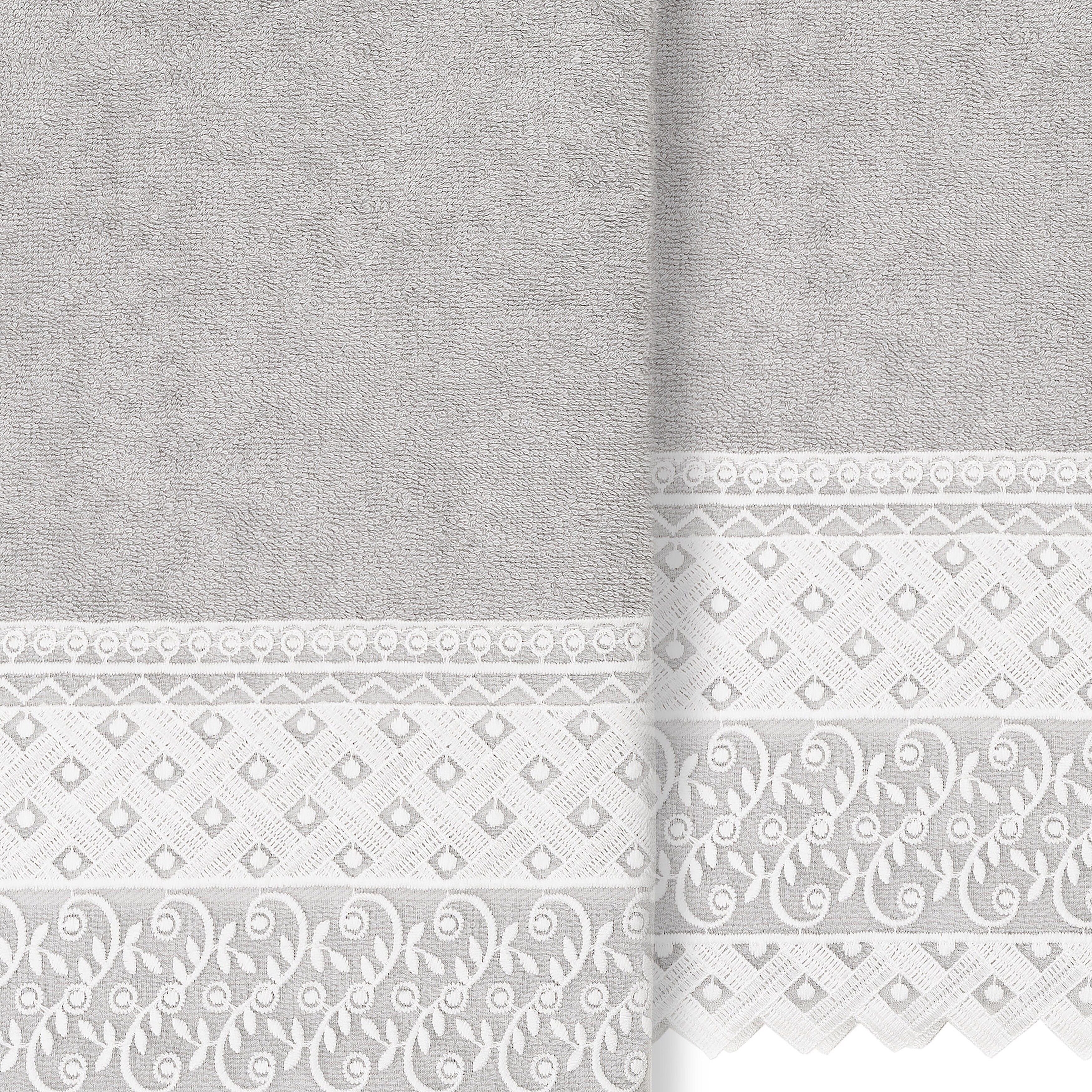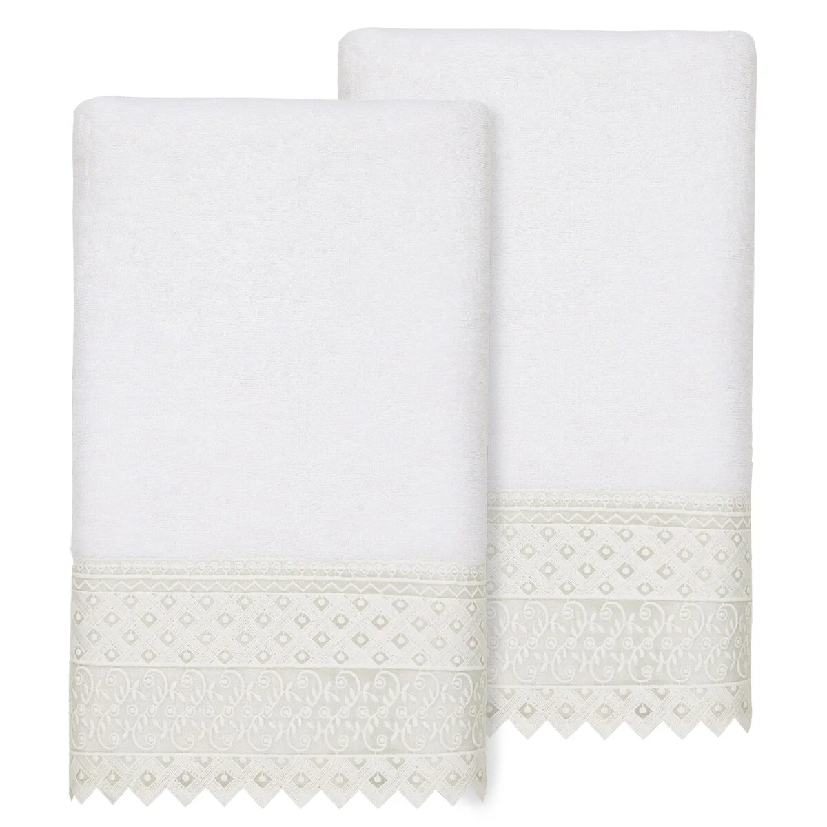 The Aiden Lace Towel Collection by Authentic Hotel and Spa features an intricate floral trellis motif, embroidered on a white organza lace border with scalloped bottom edge. These soft and luxurious towels are made of 100% premium Turkish Cotton and offer lasting absorbency and superior durability. The Aiden Lace Collection will bring a graceful note to your bath decor.