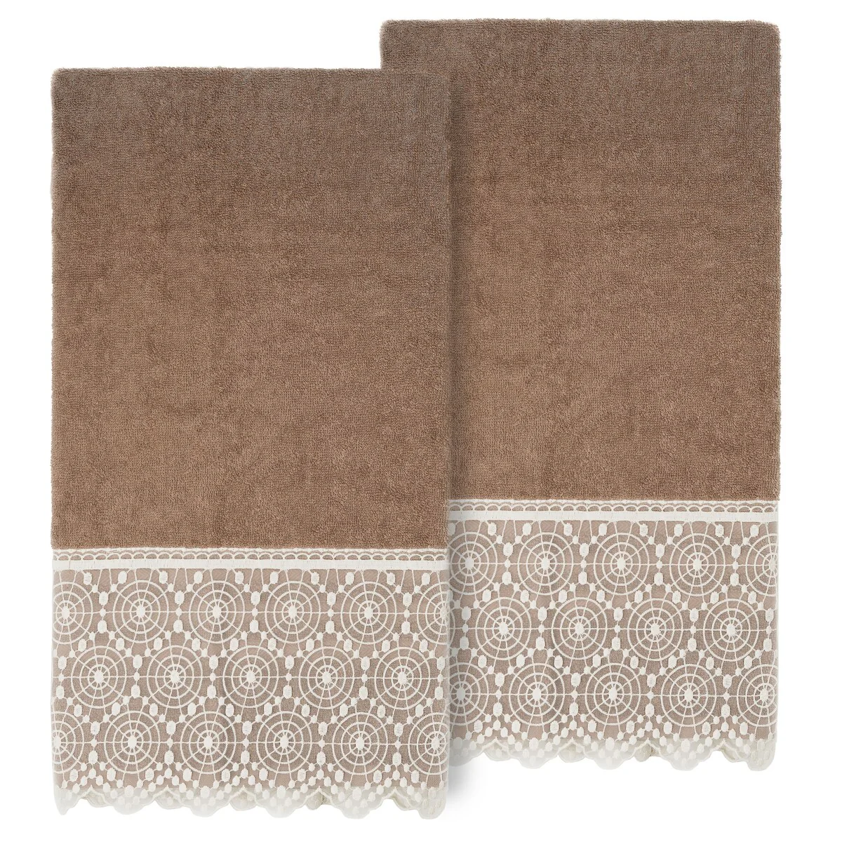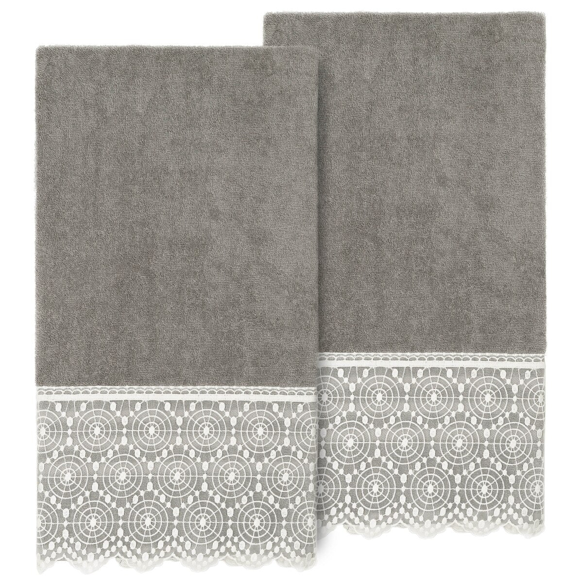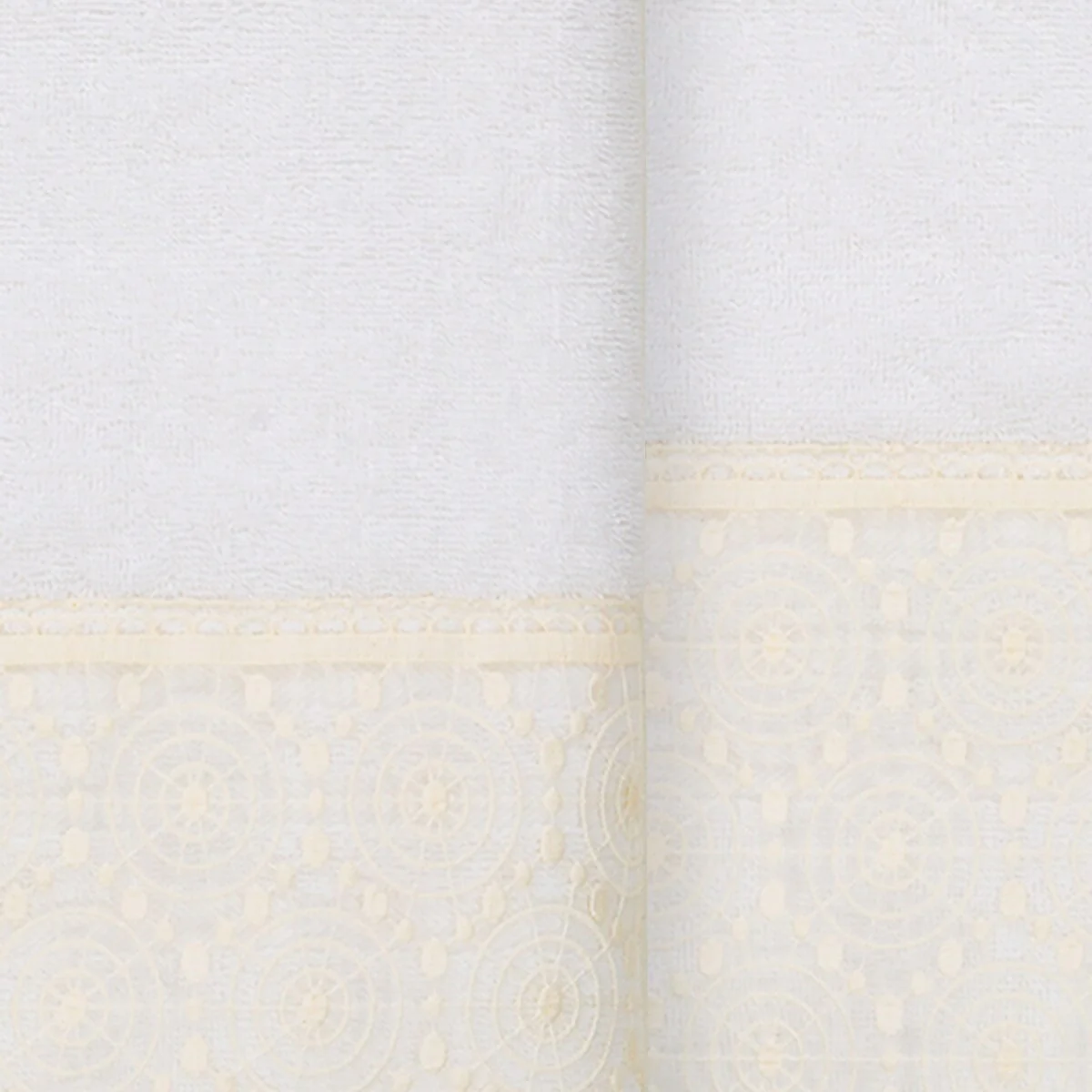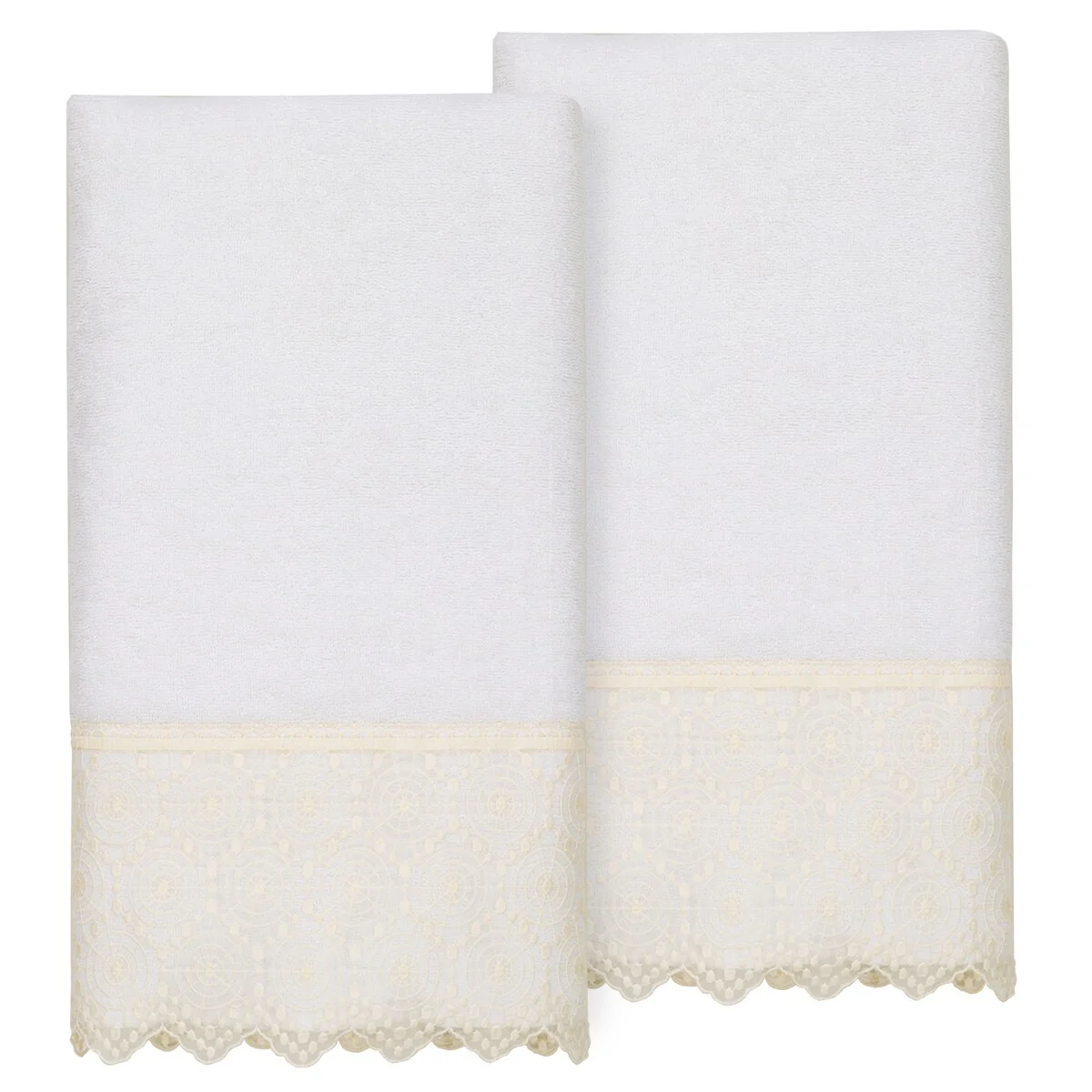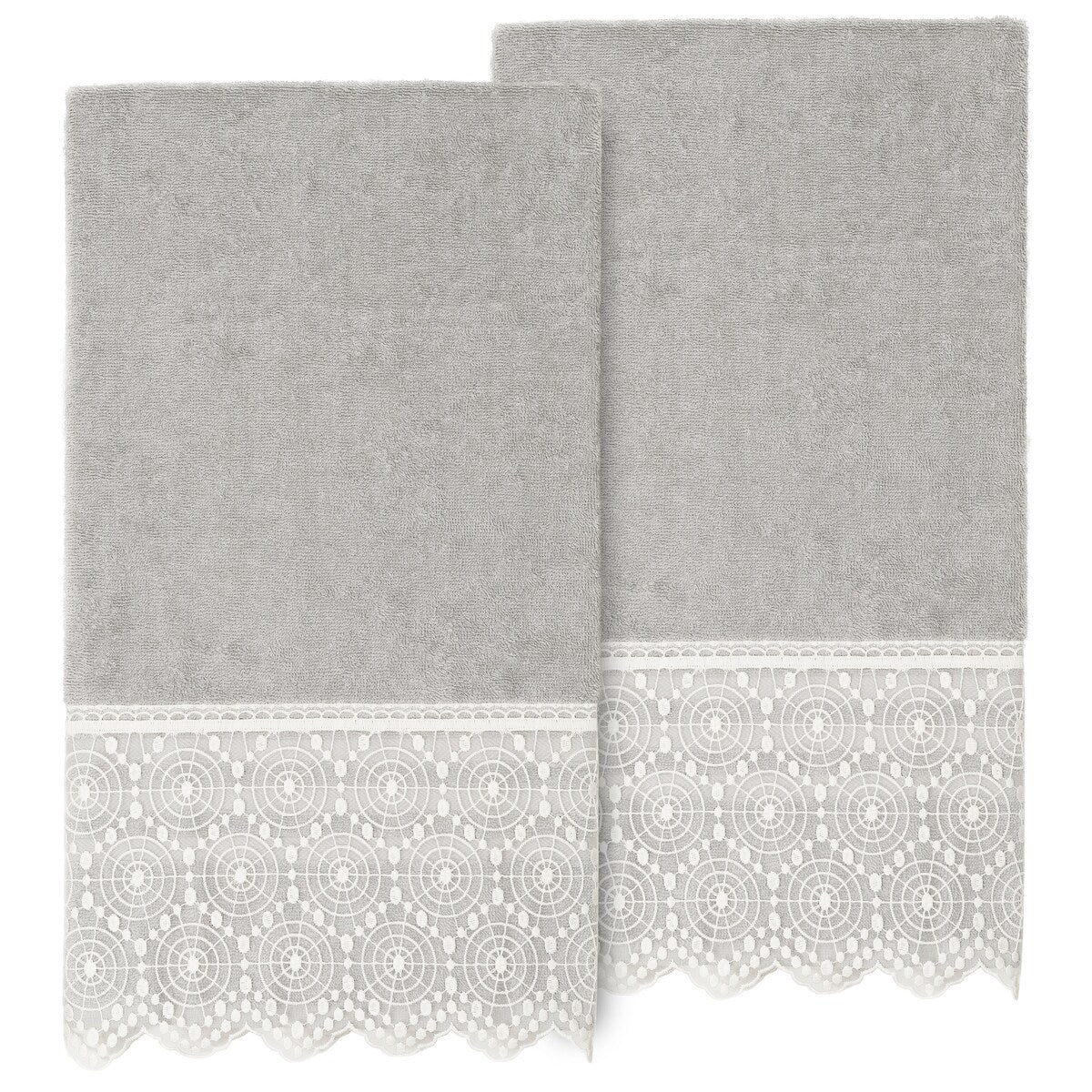 The Arian Lace Towel Collection by Authentic Hotel and Spa features an elegant circles motif, embroidered on a cream organza lace border with scalloped bottom edge. These soft and luxurious towels are made of 100% premium Turkish Cotton and offer lasting absorbency and superior durability. The Arian Lace Collection will bring a sophisticated note to your bath decor.