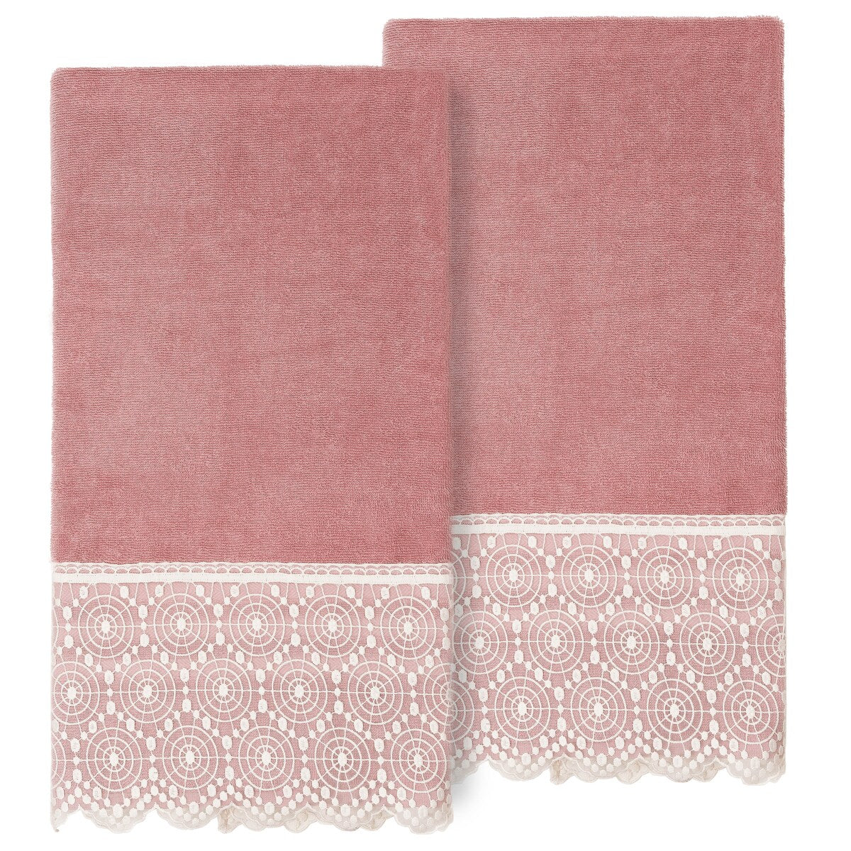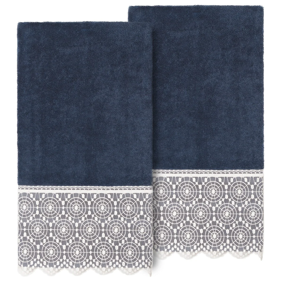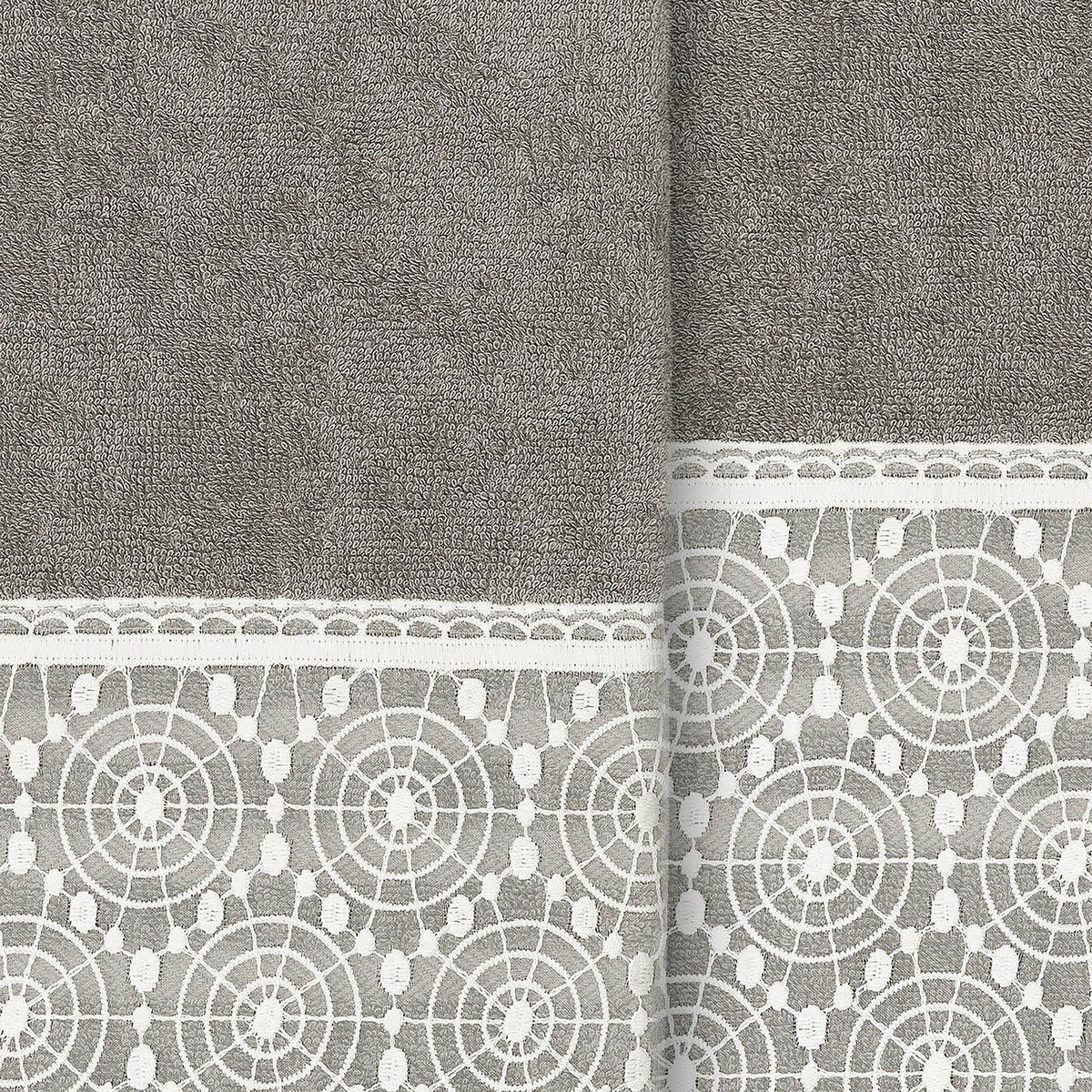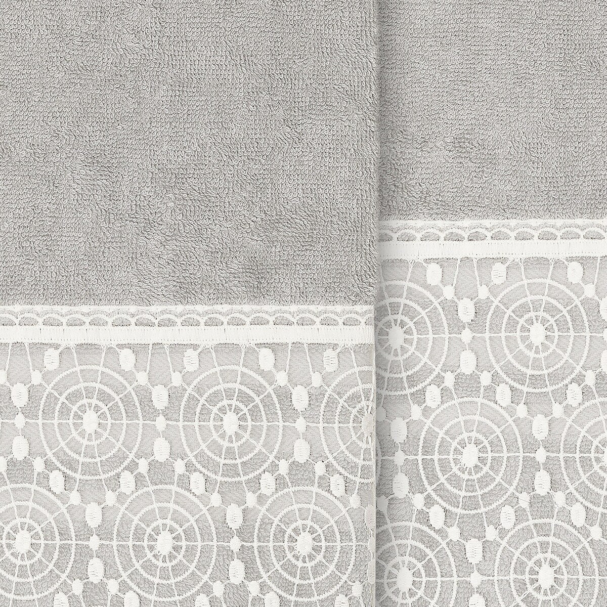 The Arian Lace Towel Collection by Authentic Hotel and Spa features an elegant circles motif, embroidered on a cream organza lace border with scalloped bottom edge. These soft and luxurious towels are made of 100% premium Turkish Cotton and offer lasting absorbency and superior durability. The Arian Lace Collection will bring a sophisticated note to your bath decor.