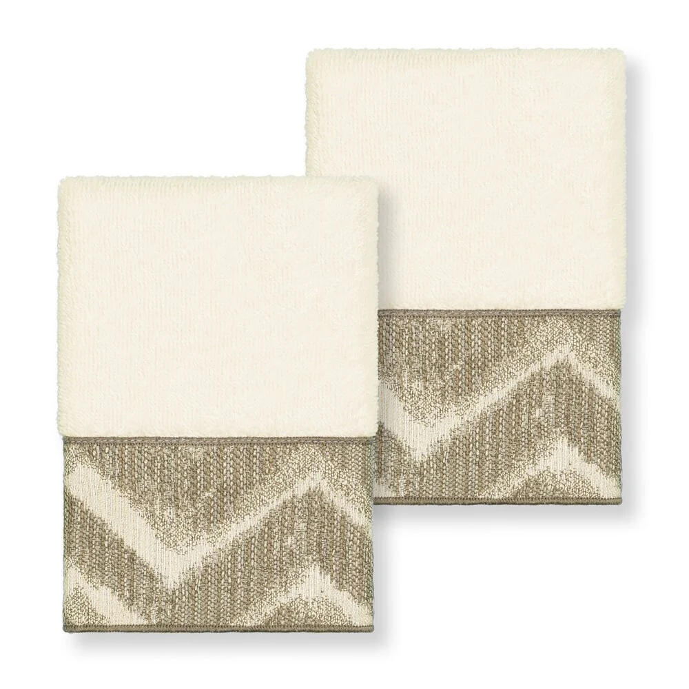 This authentic hotel and spa washcloths are made from plush, high end Turkish cotton for supreme absorbency and durability. These beautiful cream washcloths are embellished with a geometric, casual, and painterly grey and ivory jacquard woven patterned border to add that special touch to your bathroom.