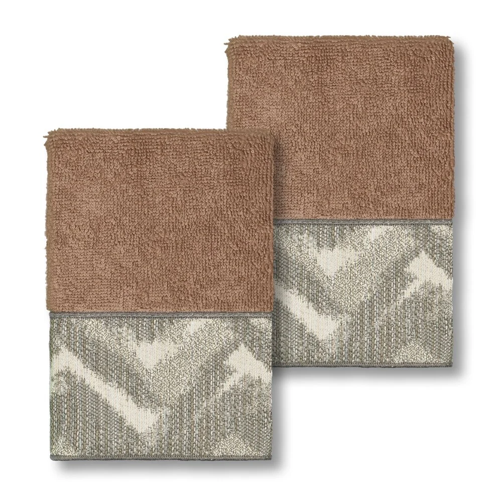 This authentic hotel and spa washcloths are made from plush, high end Turkish cotton for supreme absorbency and durability. These beautiful latte brown washcloths are embellished with a geometric, casual, and painterly grey and ivory jacquard woven patterned border to add that special touch to your bathroom.
