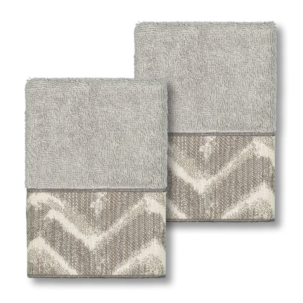 This authentic hotel and spa washcloths are made from plush, high end Turkish cotton for supreme absorbency and durability. These beautiful light grey washcloths are embellished with a geometric, casual, and painterly grey and ivory jacquard woven patterned border to add that special touch to your bathroom.