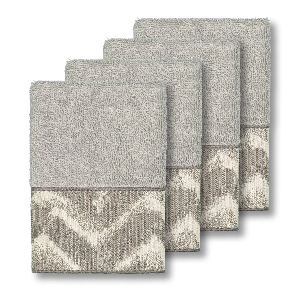 This authentic hotel and spa washcloth is made from plush, high end Turkish cotton for supreme absorbency and durability. This beautiful light grey washcloth is embellished with a geometric, casual, and painterly grey and ivory jacquard woven patterned border to add that special touch to your bathroom.