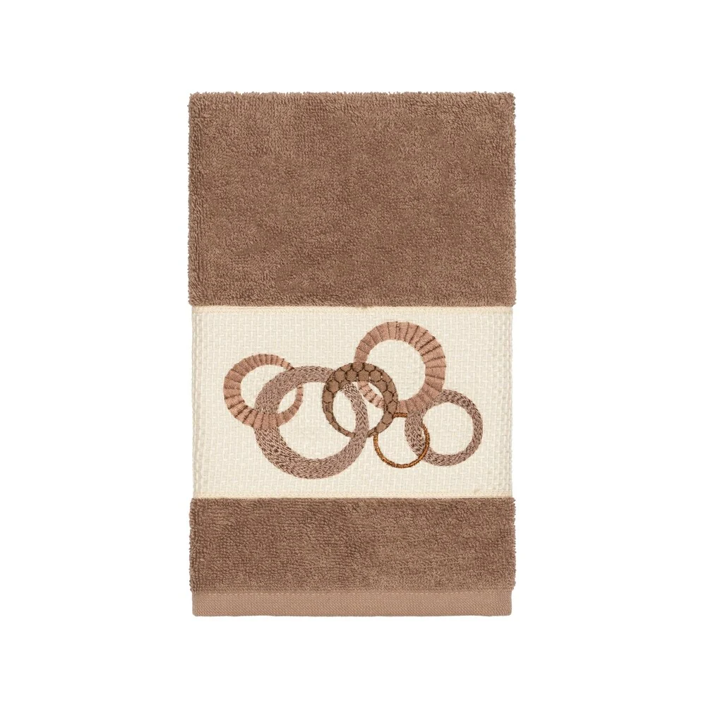 This authentic hotel and spa 3-piece towel set is made from plush, high end Turkish cotton for supreme absorbency and durability. The beautiful latte brown towels are embellished with a circles embroidery design with metallic accents to add that special touch to your bathroom.