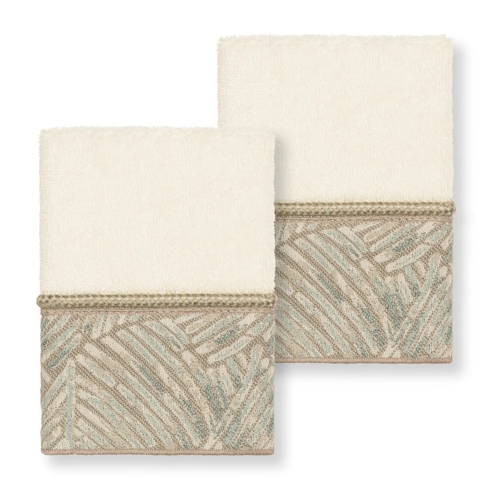 This authentic hotel and spa washcloths are made from plush, high end Turkish cotton for supreme absorbency and durability. These beautiful cream washcloths are embellished with contemporary, earthy and textural ivory and celadon green jacquard woven fern-like patterned border, accented with a tan-multi bolo cord trim to add that special touch to your bathroom.