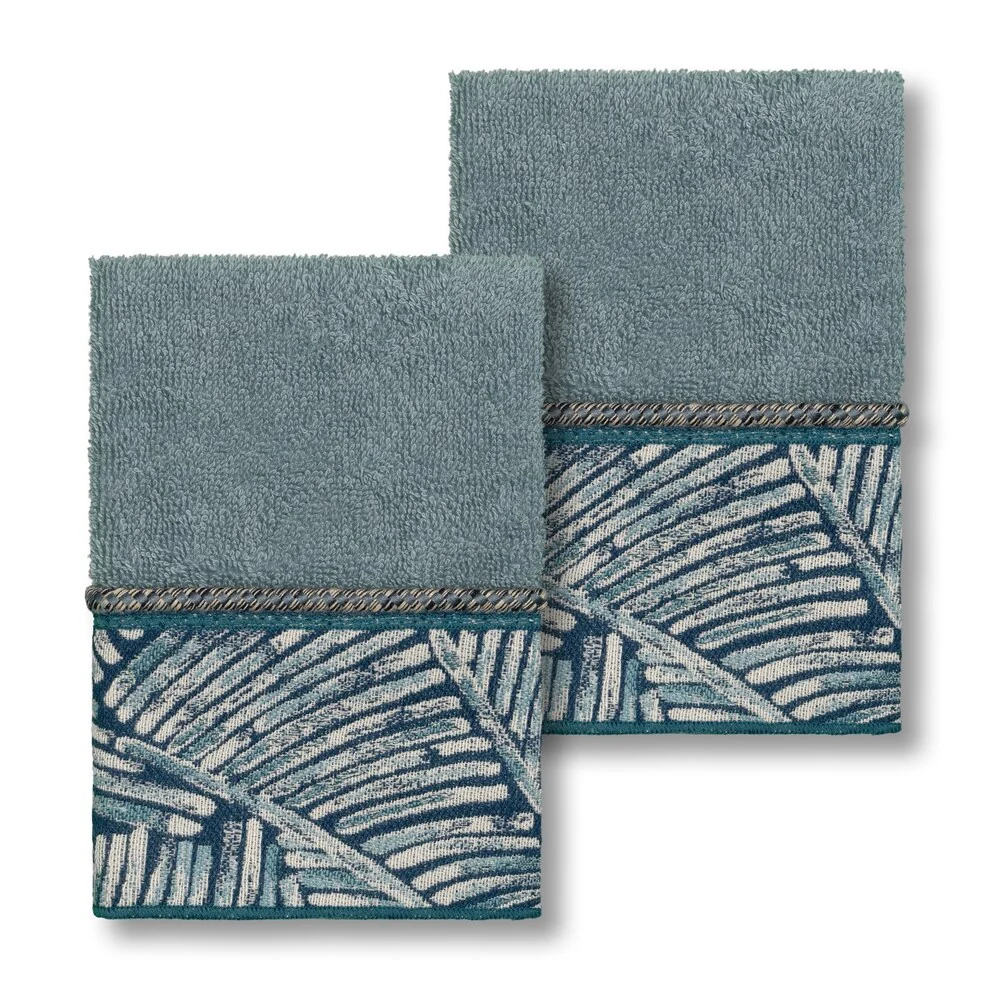 This authentic hotel and spa washcloths are made from plush, high end Turkish cotton for supreme absorbency and durability. These beautiful teal blue washcloths are embellished with contemporary, earthy and textural blue and teal jacquard woven fern-like patterned border, accented with a multi bolo cord trim to add that special touch to your bathroom.