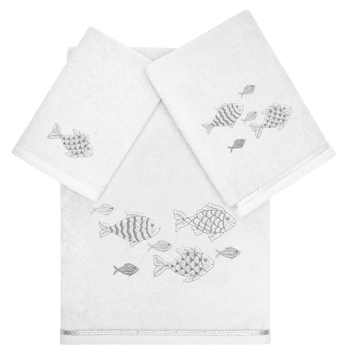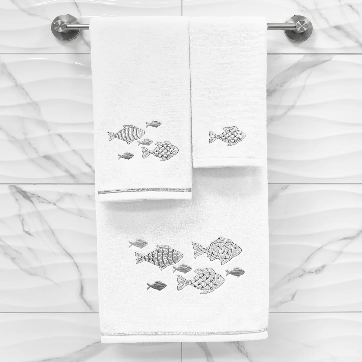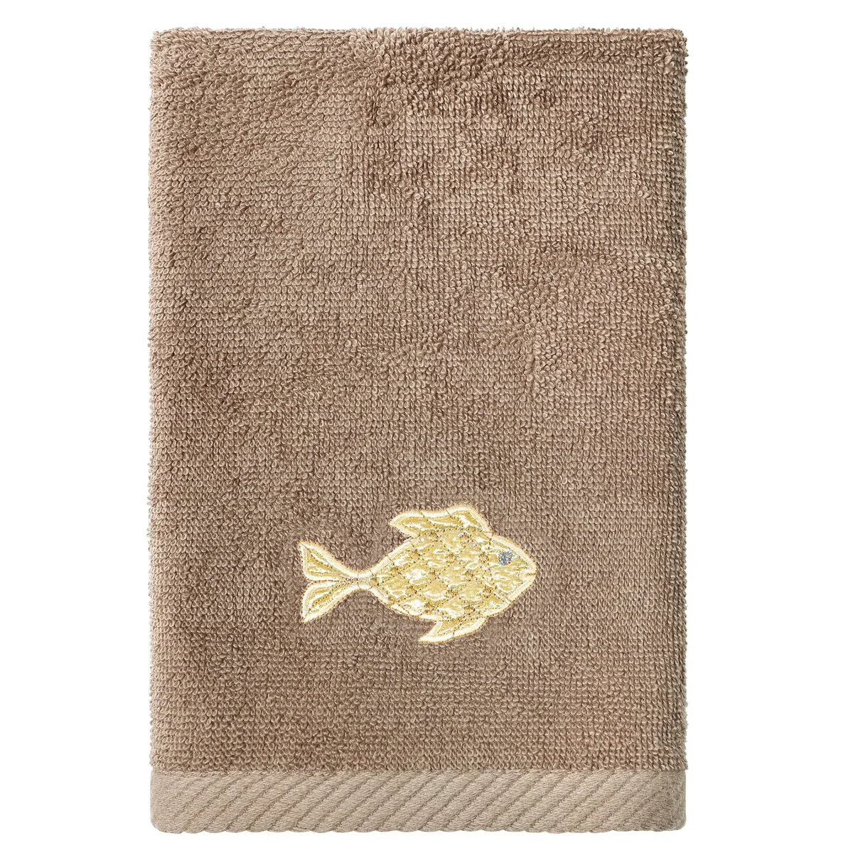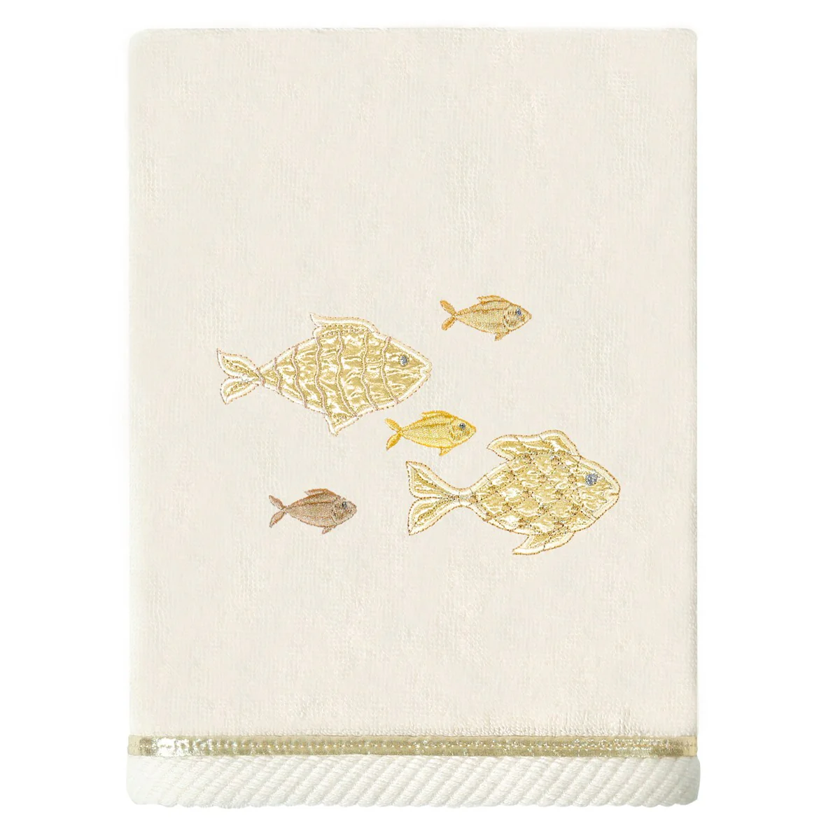 Your decorations are not complete without graceful embroidered towels for the comfort of your family and guests. The Figi towels by Authentic Hotel and Spa feature sparkling applique fish and are trimmed with a matching cord. Cloud soft and super absorbent, these luxurious, durable towels keep their plush appearance after washing. This collection is available in 8 elegant colors: White, Beige, Blush, Aqua, Silver, Cocoa, Charcoal and Marine. The Figi Towel Collection brings a coastal spirit and richness to your home decor and makes a great gift!