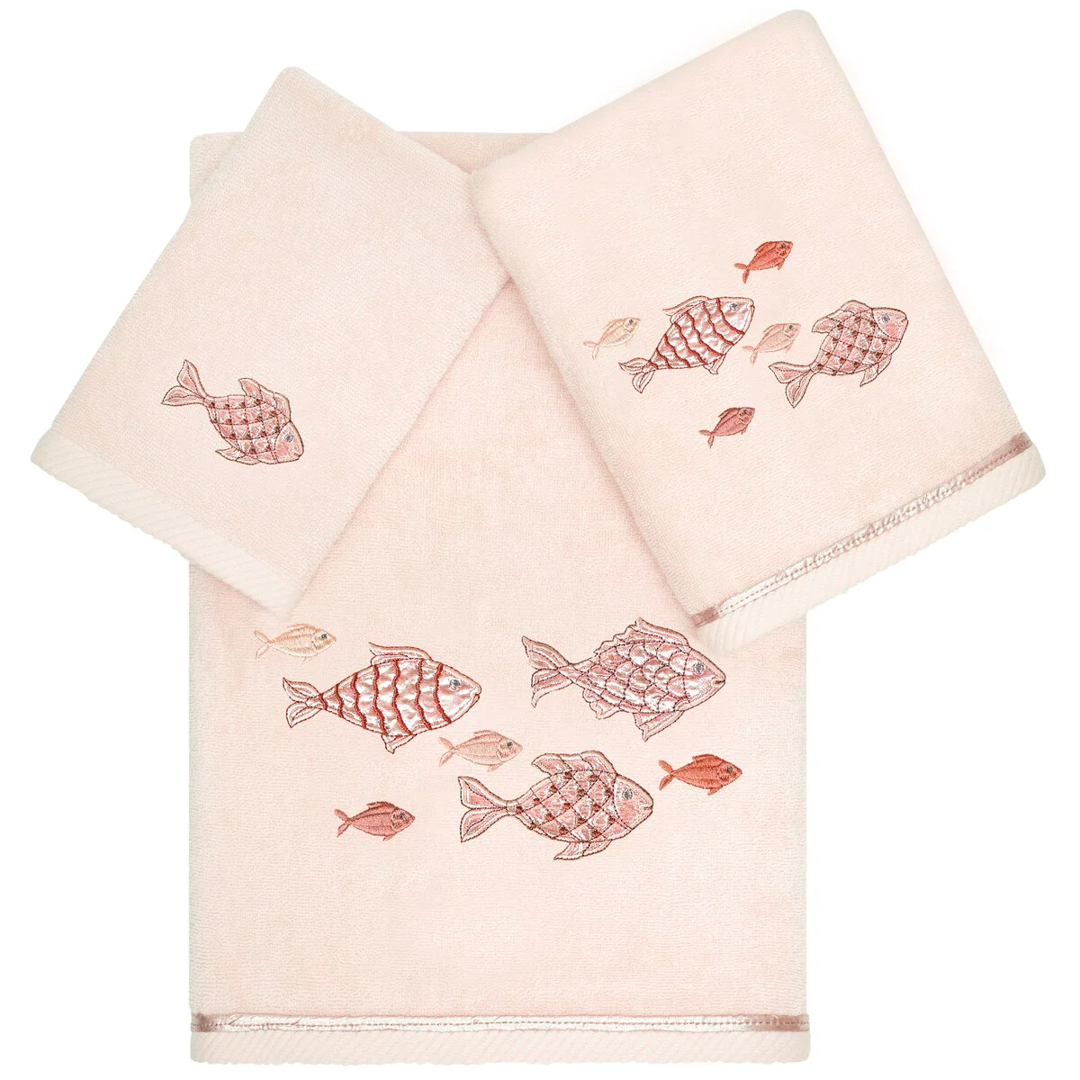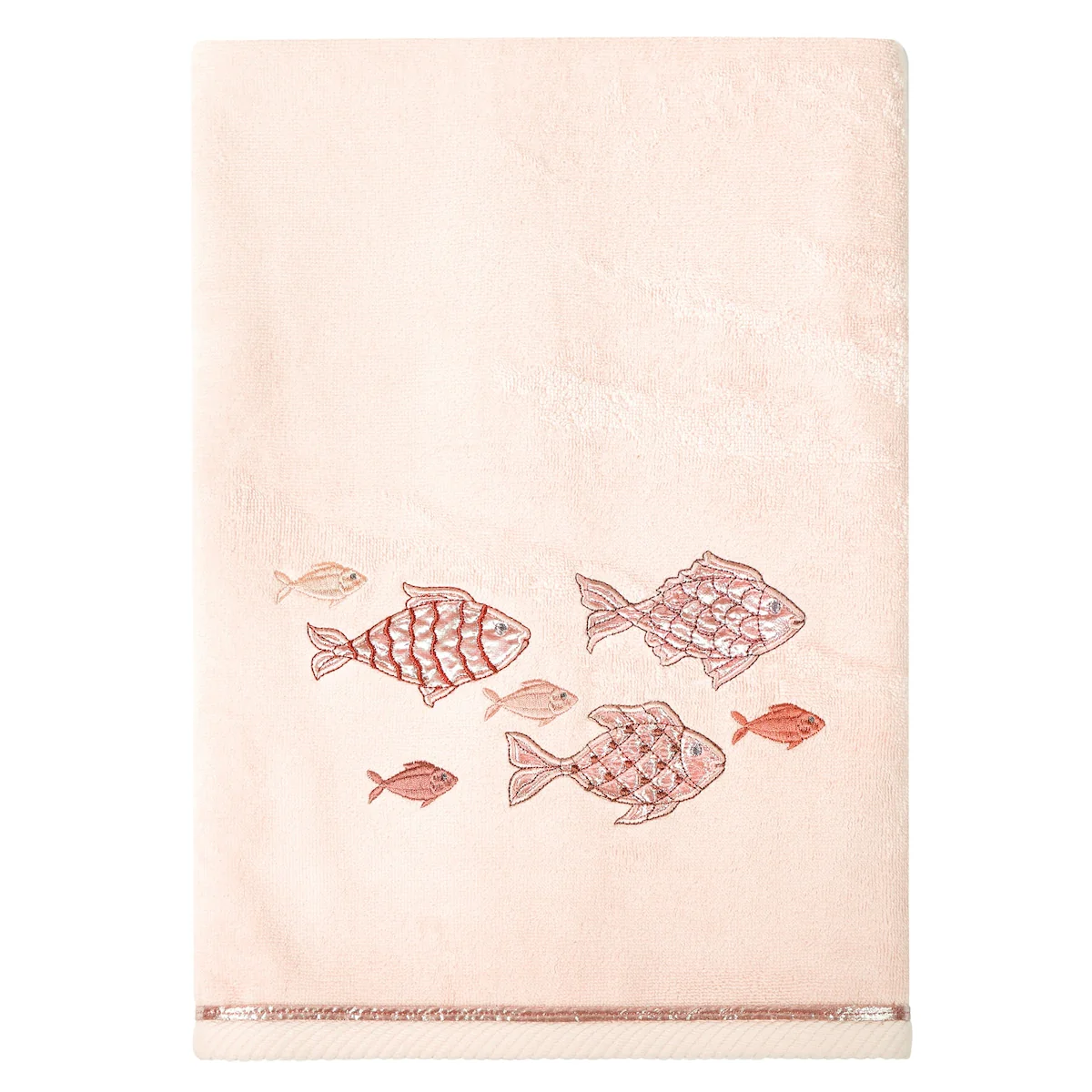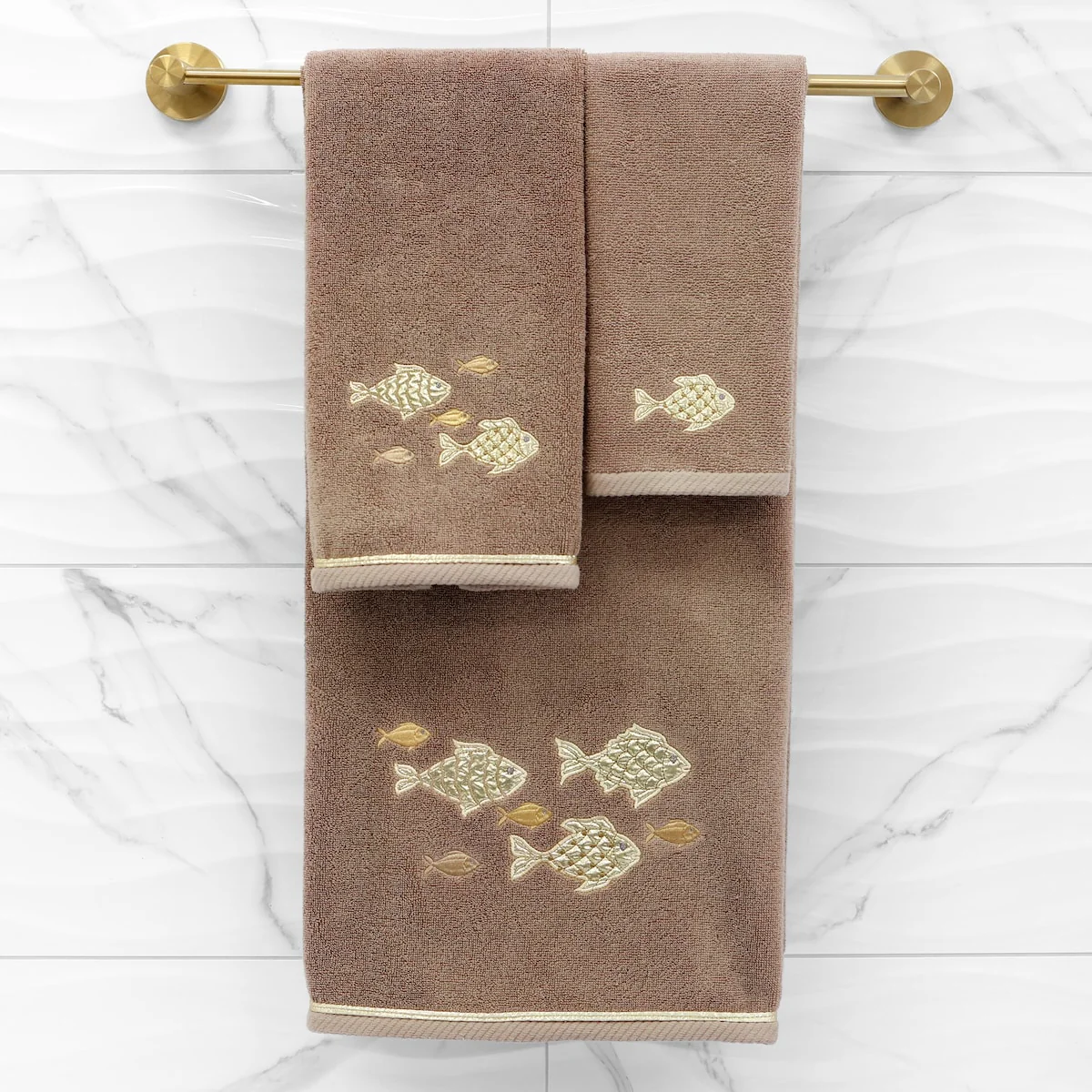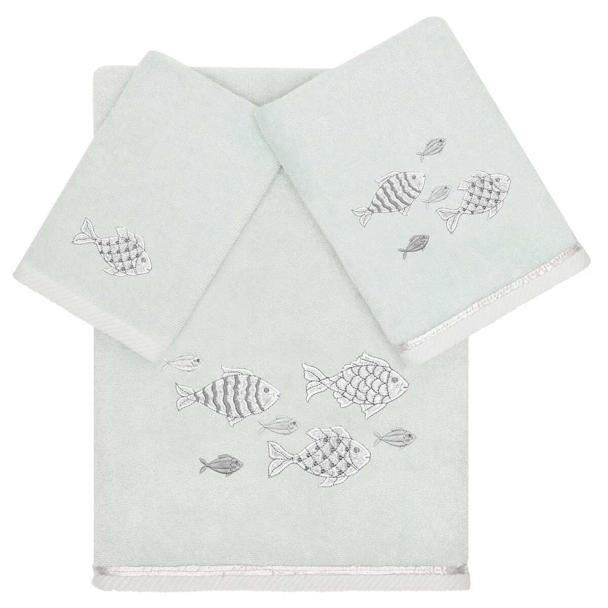 Your decorations are not complete without graceful embroidered towels for the comfort of your family and guests. The Figi towels by Authentic Hotel and Spa feature sparkling applique fish and are trimmed with a matching cord. Cloud soft and super absorbent, these luxurious, durable towels keep their plush appearance after washing. This collection is available in 8 elegant colors: White, Beige, Blush, Aqua, Silver, Cocoa, Charcoal and Marine. The Figi Towel Collection brings a coastal spirit and richness to your home decor and makes a great gift!
