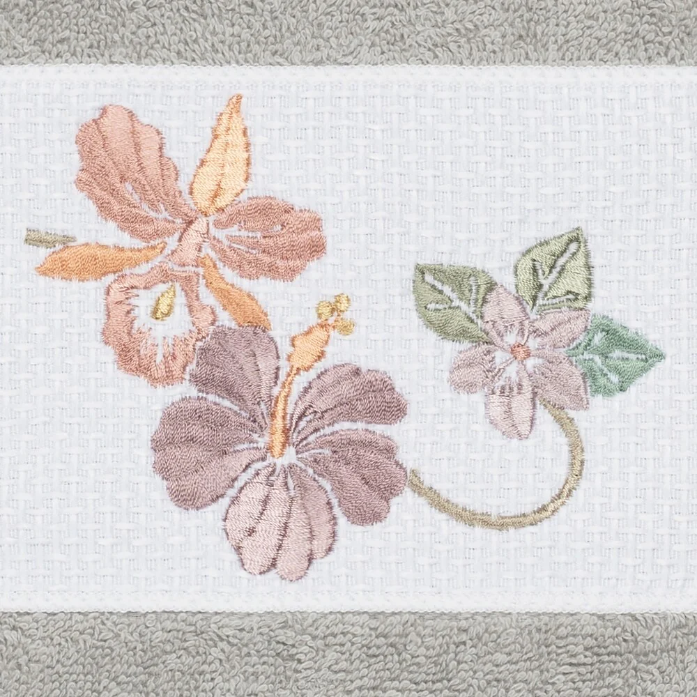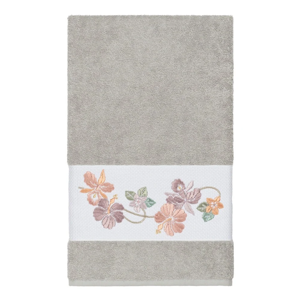This authentic hotel and spa 3-piece towel set is made from plush, high end Turkish cotton for supreme absorbency and durability. The beautiful light grey towels are embellished with a floral and vine embroidery design with a textured woven border to add that special touch to your bathroom.