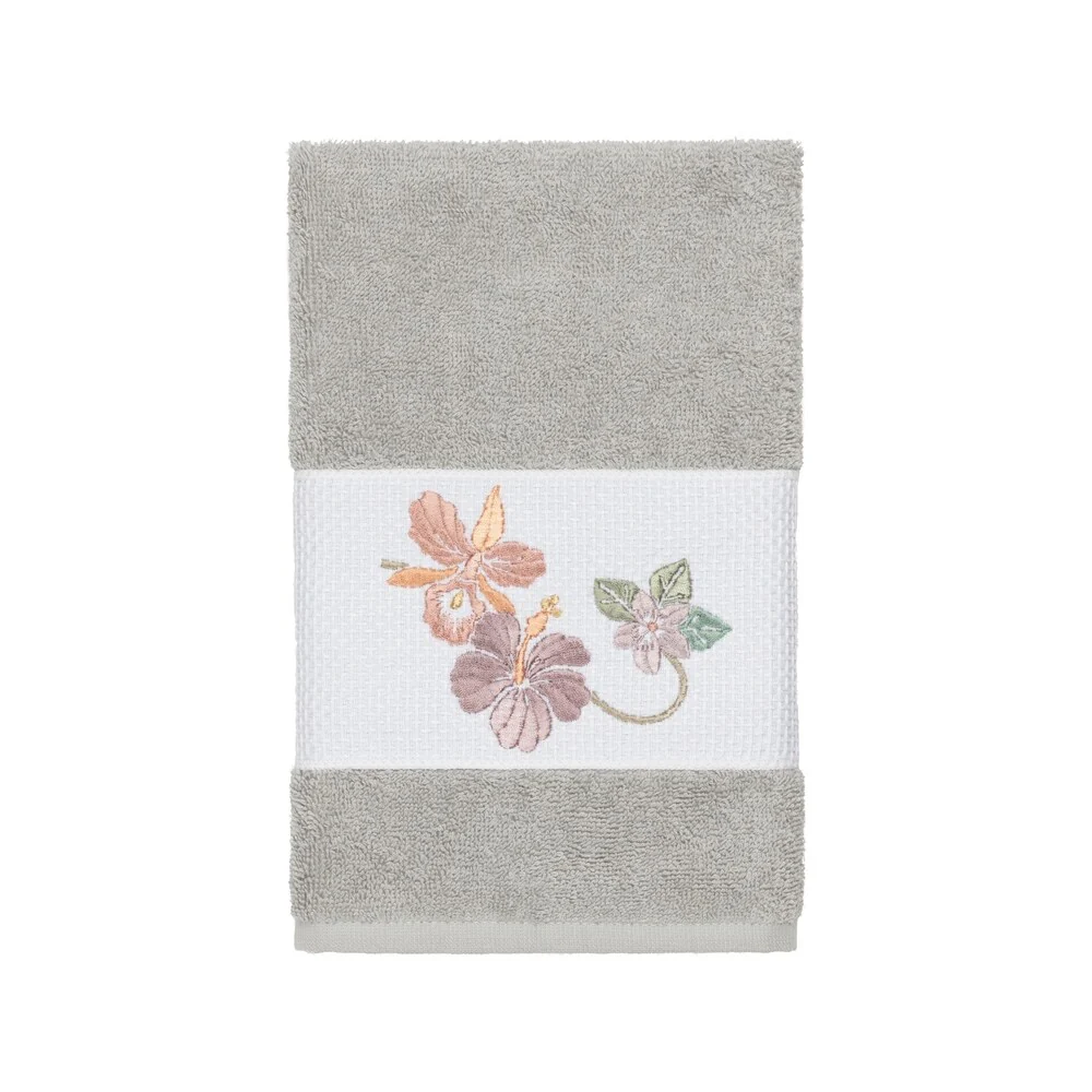 This authentic hotel and spa 3-piece towel set is made from plush, high end Turkish cotton for supreme absorbency and durability. These beautiful light grey towels are embellished with a floral and vine embroidery design with a textured woven border to add that special touch to your bathroom.