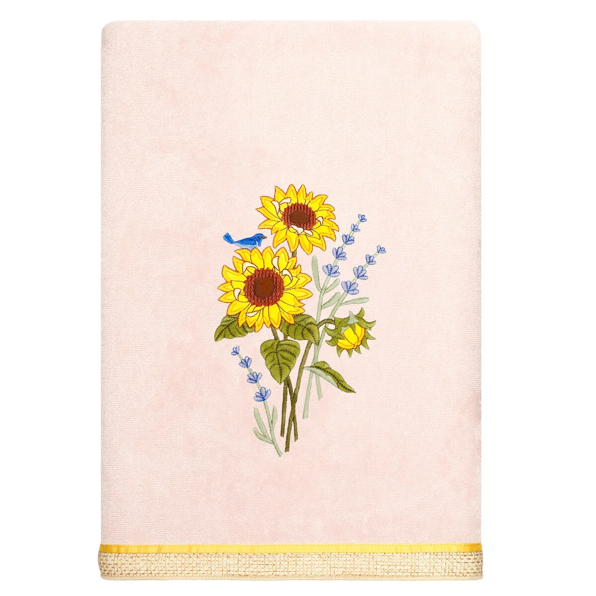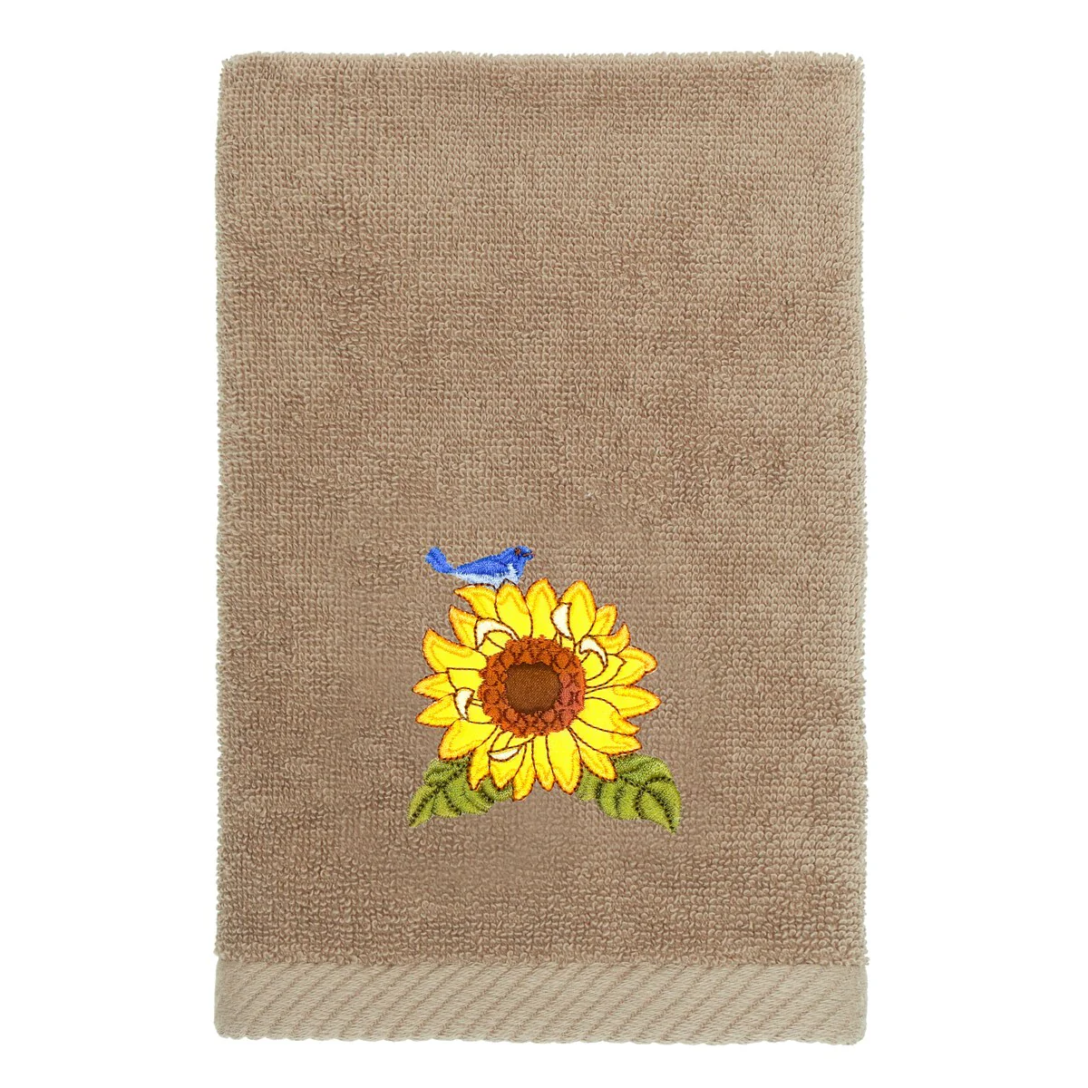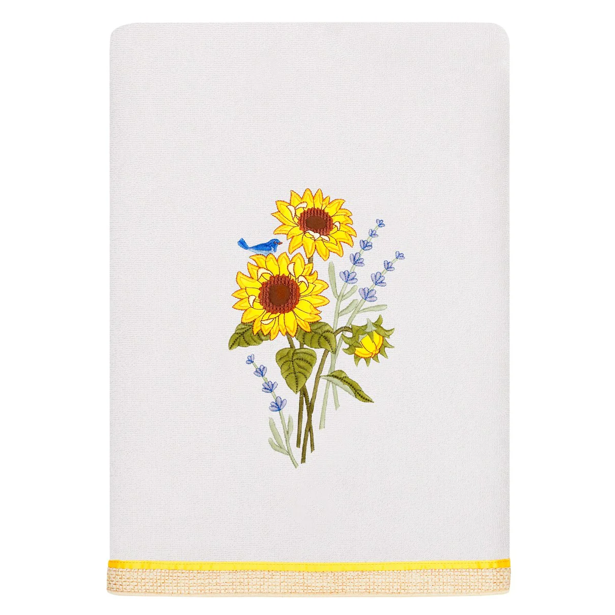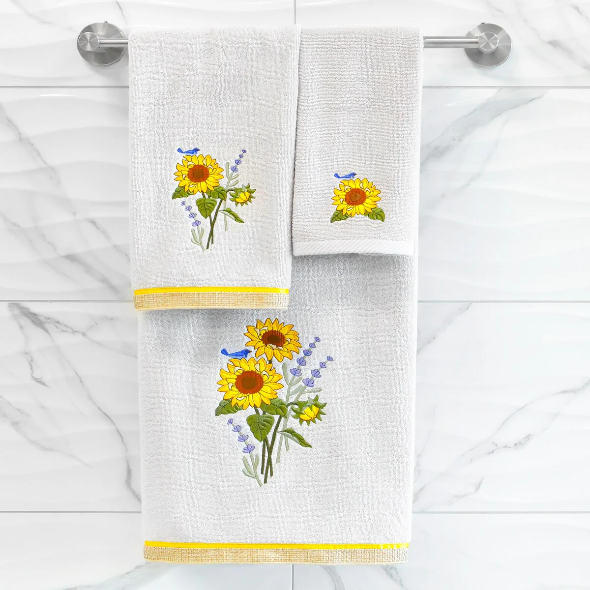 Create a mood of country charm in your bath with the Girasol Embellished Towel Collection by Authentic Hotel and Spa. These towels feature an applique embroidered bouquet of vibrant sunflowers and lavender, highlighted by a bright bird perched on top. Cloud soft and super absorbent, these luxurious, durable towels keep their plush appearance after washing. This collection is available in 8 elegant colors: White, Beige, Blush, Aqua, Silver, Cocoa, Charcoal and Marine. The Girasol Towel Collection brings a natural spirit and richness to your home decor and makes a great gift!