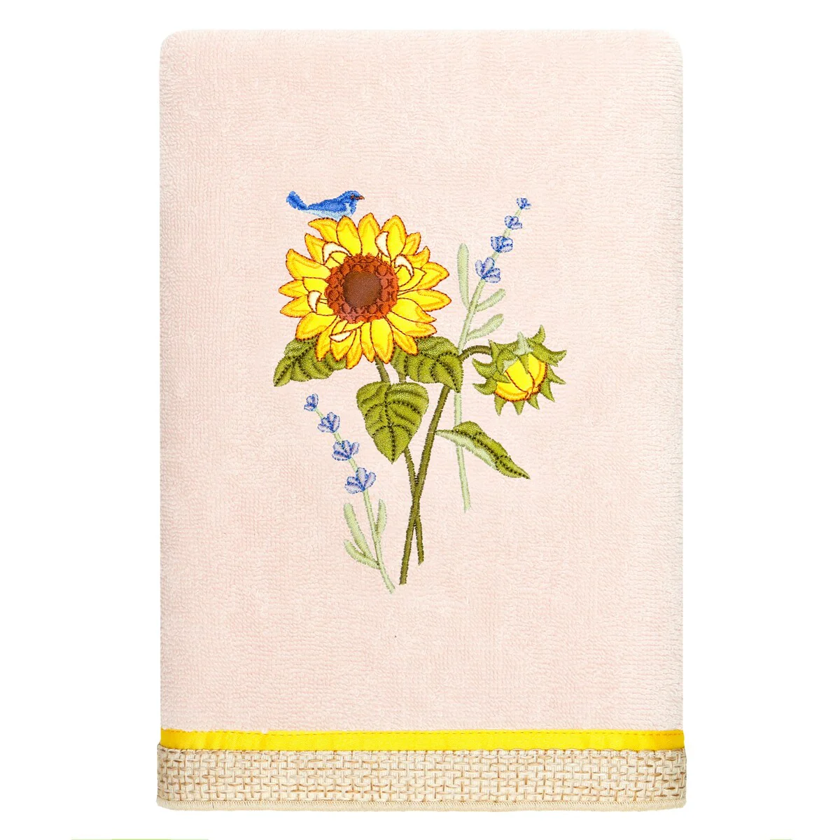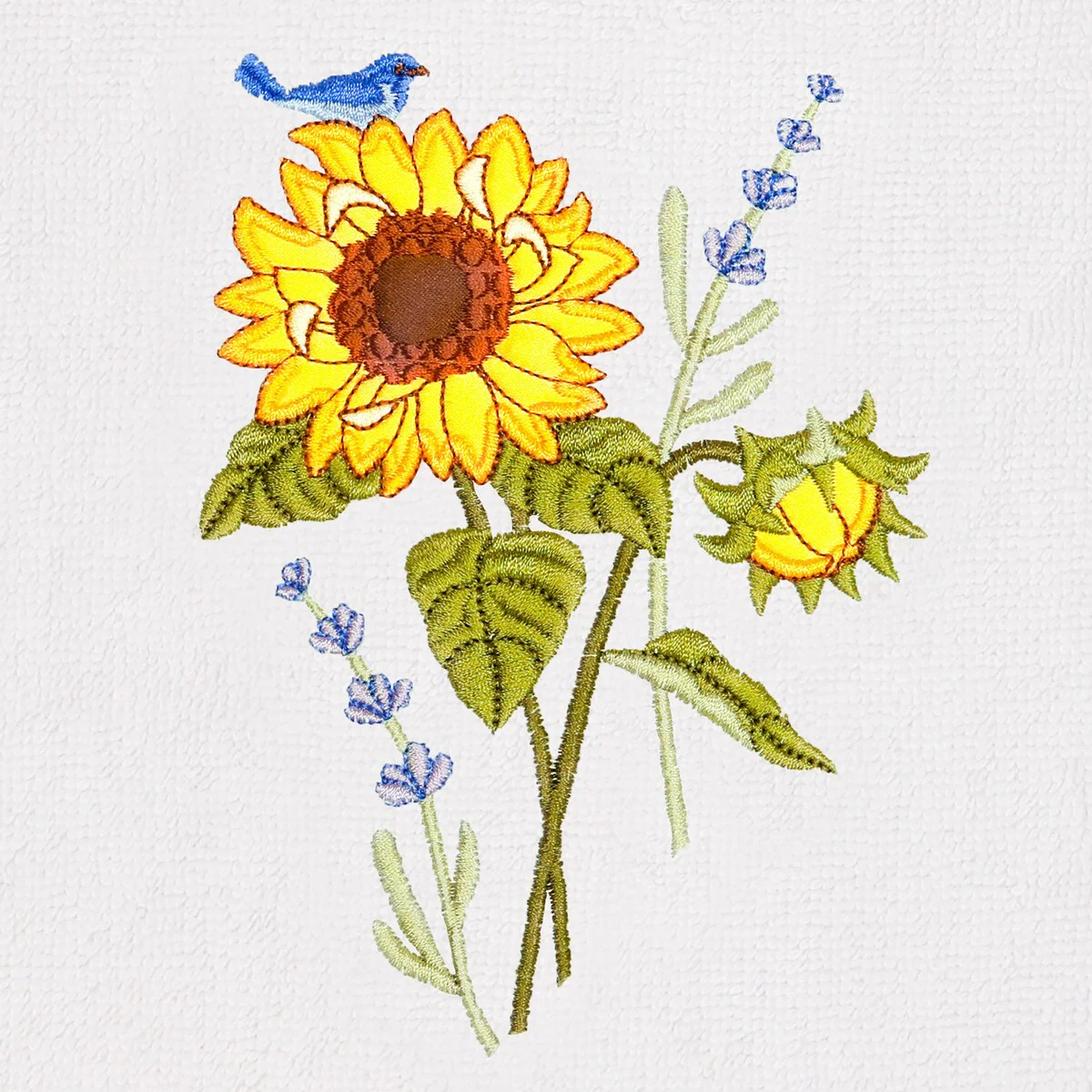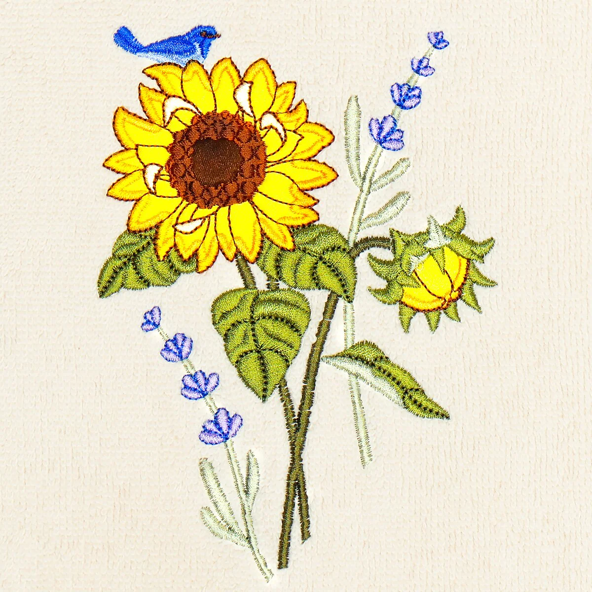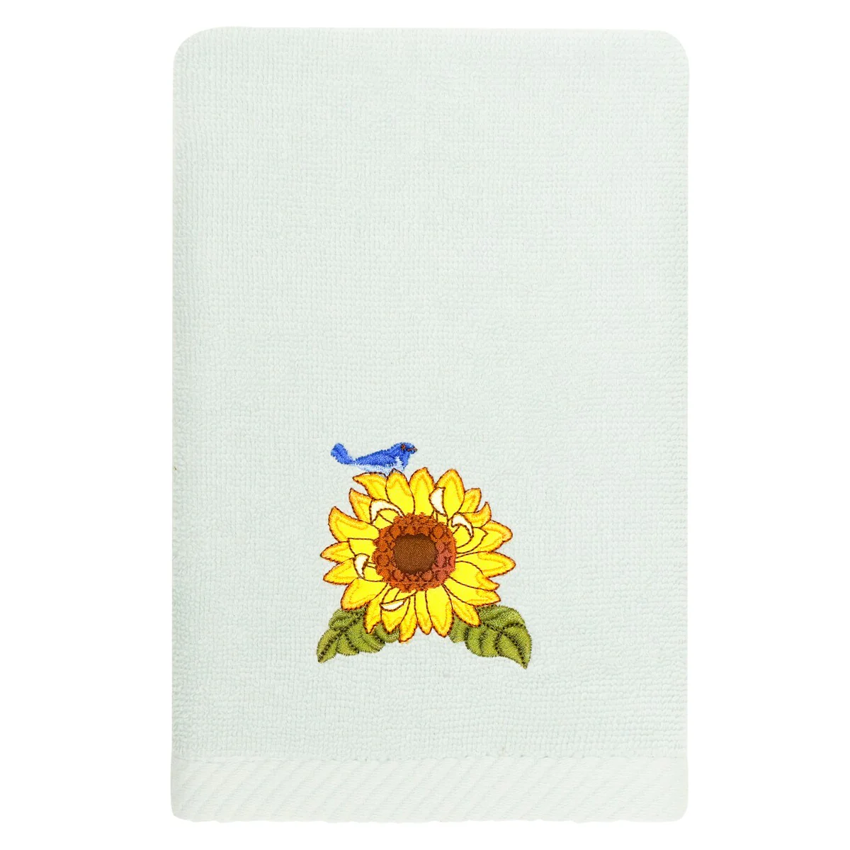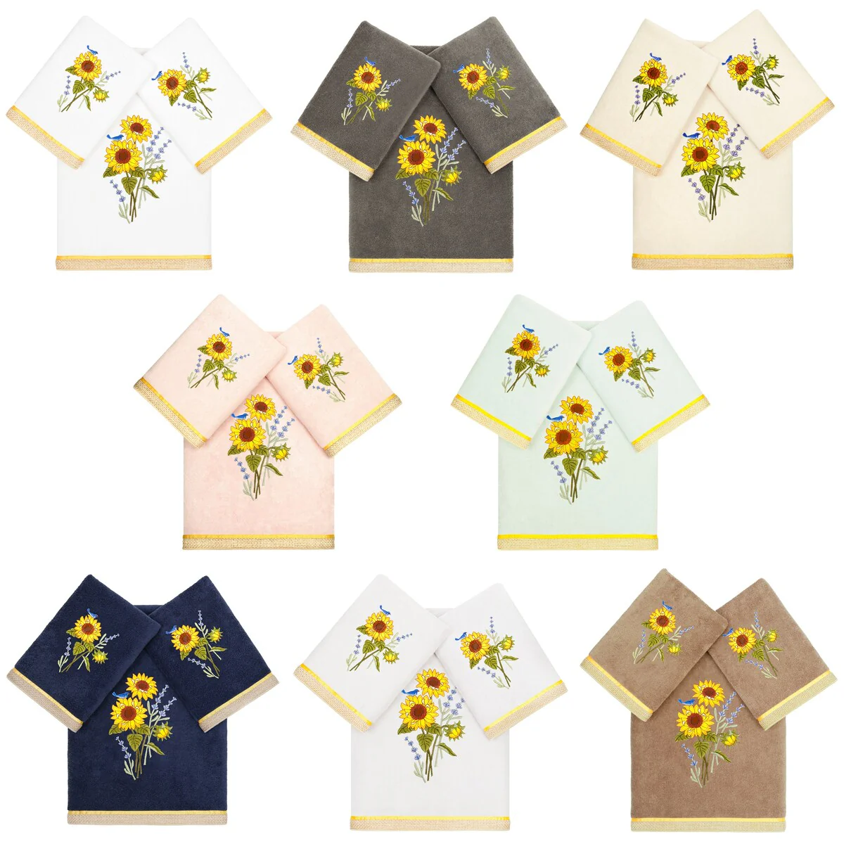 Create a mood of country charm in your bath with the Girasol Embellished Towel Collection by Authentic Hotel and Spa. These towels feature an applique embroidered bouquet of vibrant sunflowers and lavender, highlighted by a bright bird perched on top. Cloud soft and super absorbent, these luxurious, durable towels keep their plush appearance after washing. This collection is available in 8 elegant colors: White, Beige, Blush, Aqua, Silver, Cocoa, Charcoal and Marine. The Girasol Towel Collection brings a natural spirit and richness to your home decor and makes a great gift!