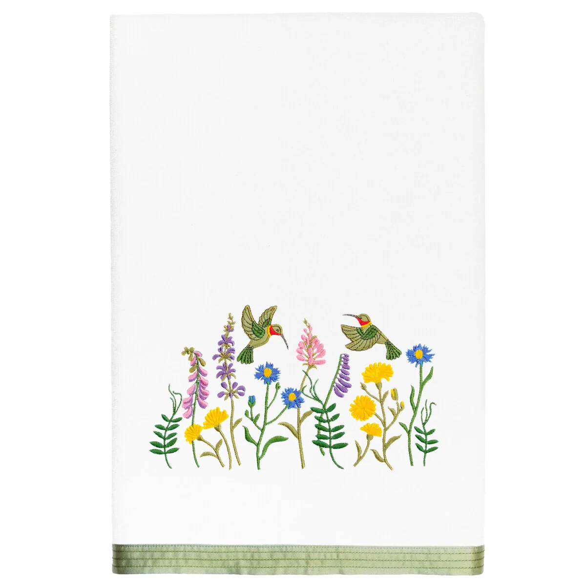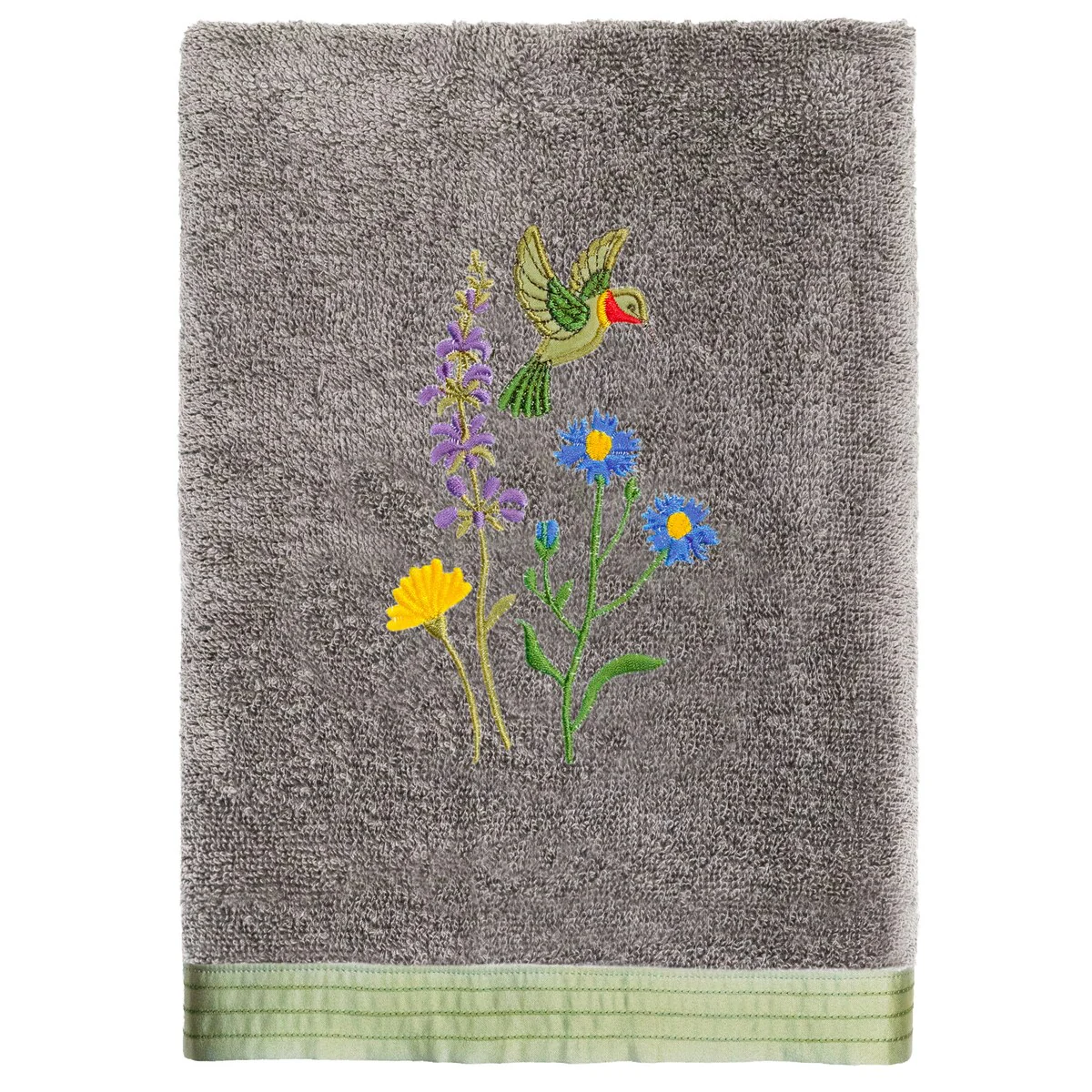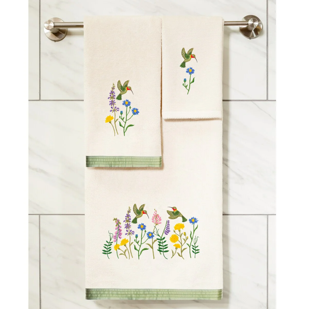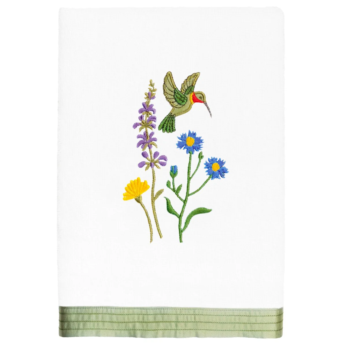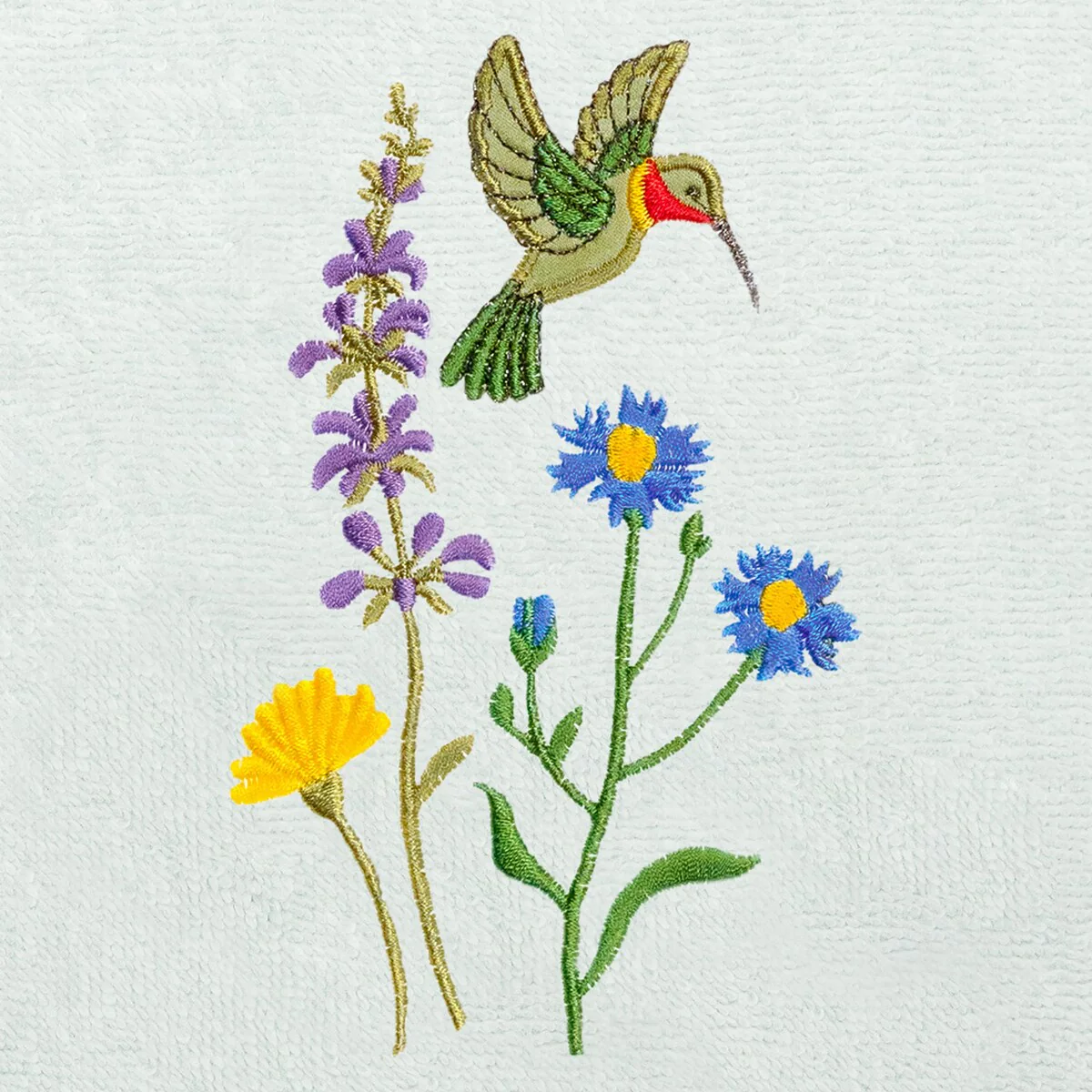Your bath decor is not complete without delightful embroidered towels by Authentic Hotel and Spa for the comfort of your family and guests. The Hada towels feature applique hummingbirds, dancing among wild flowers and are trimmed with a lustrous taffeta border. Cloud soft and super absorbent, these luxurious, durable towels keep their plush appearance after washing. This collection is available in 8 elegant colors: White, Beige, Blush, Aqua, Silver, Cocoa, Charcoal and Marine. The Hada Towel Collection brings cheerful spirit and richness to your home decor and makes a great gift.