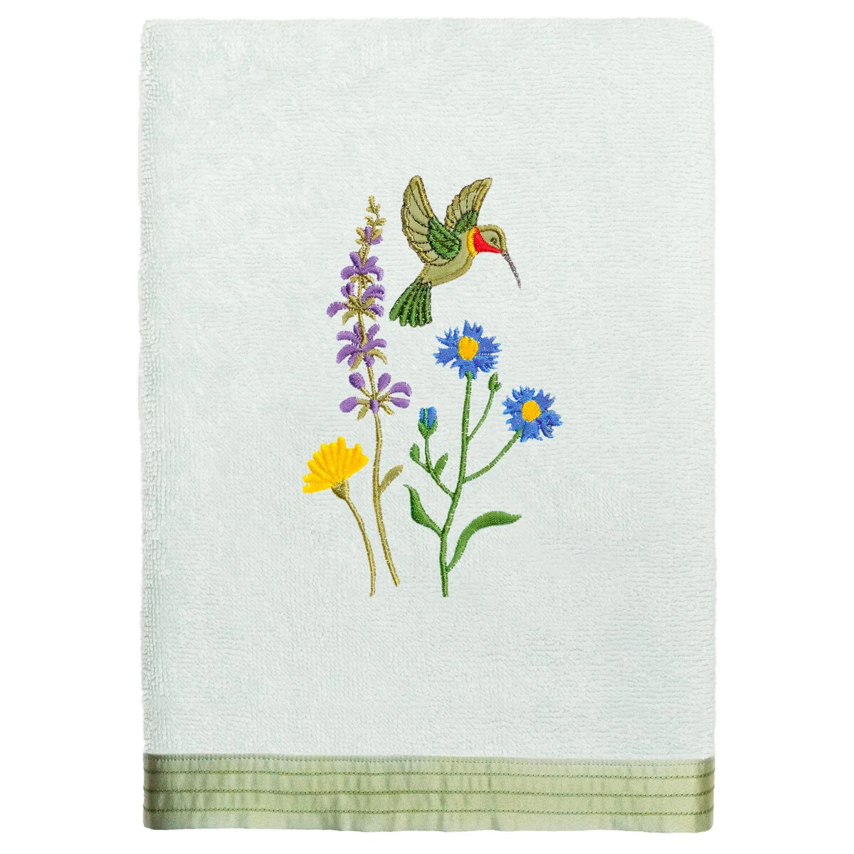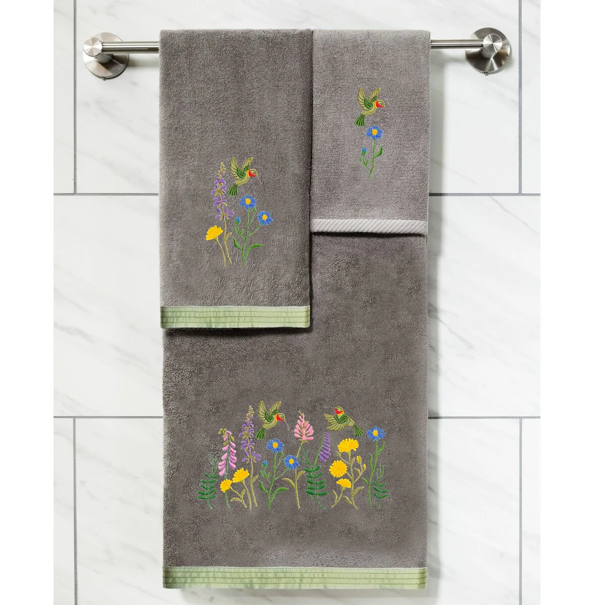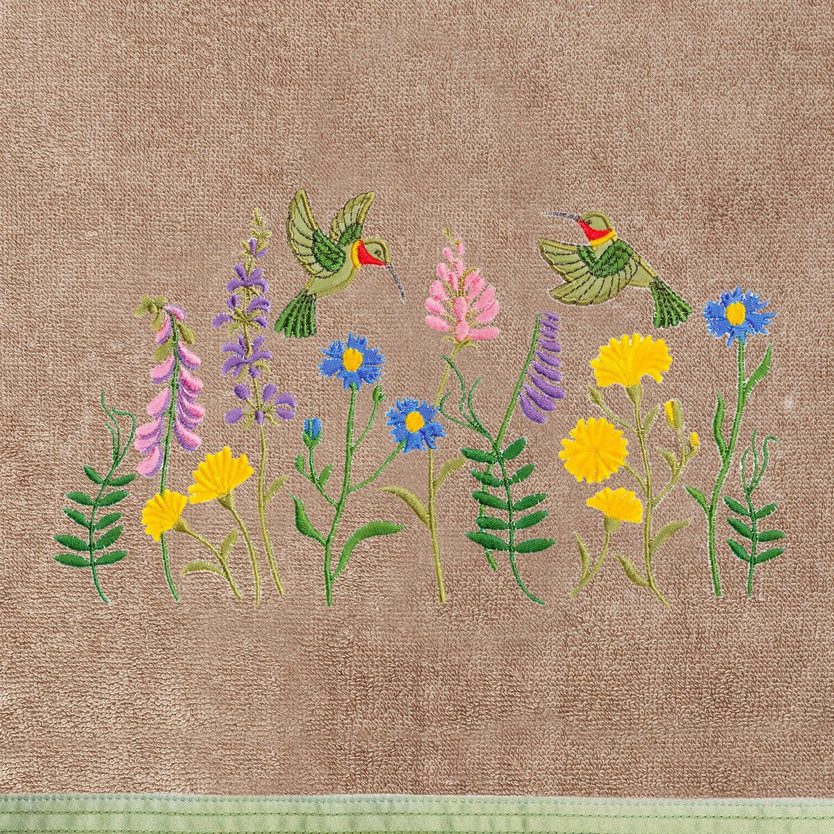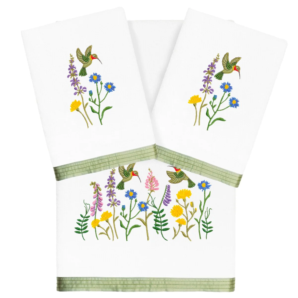 Your bath decor is not complete without delightful embroidered towels by Authentic Hotel and Spa for the comfort of your family and guests. The Hada towels feature applique hummingbirds, dancing among wild flowers and are trimmed with a lustrous taffeta border. Cloud soft and super absorbent, these luxurious, durable towels keep their plush appearance after washing. This collection is available in 8 elegant colors: White, Beige, Blush, Aqua, Silver, Cocoa, Charcoal and Marine. The Hada Towel Collection brings cheerful spirit and richness to your home decor and makes a great gift.