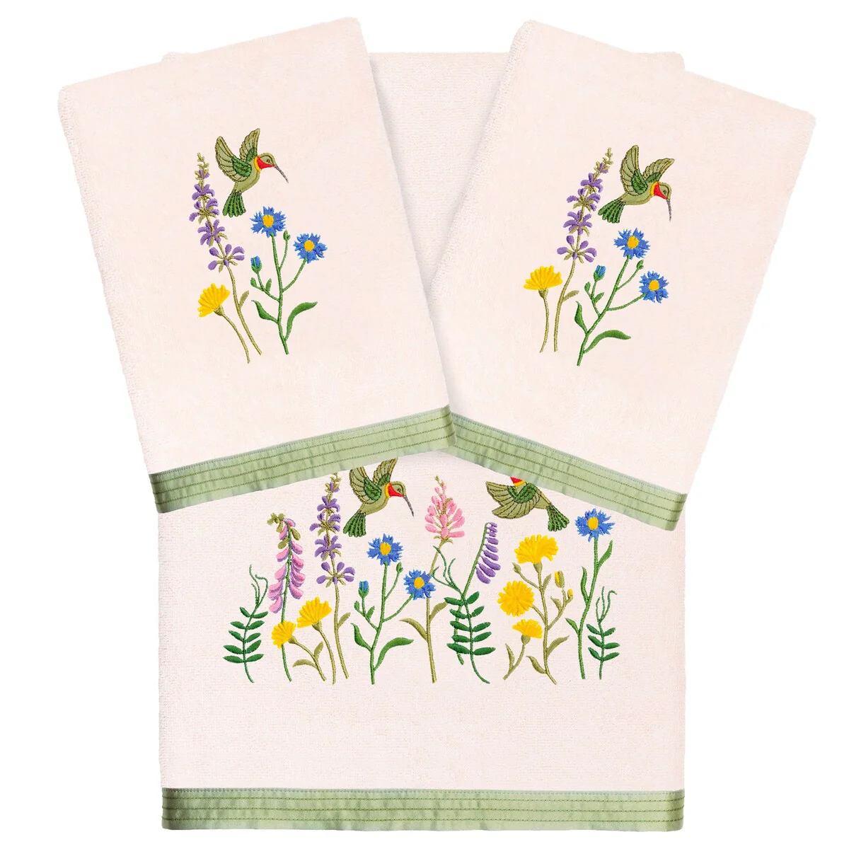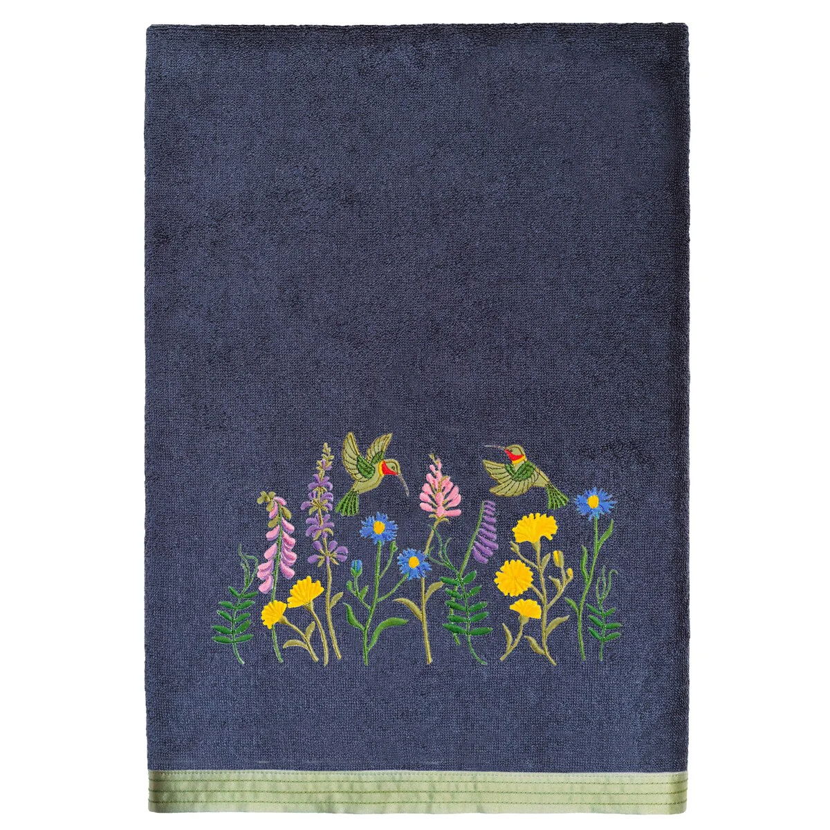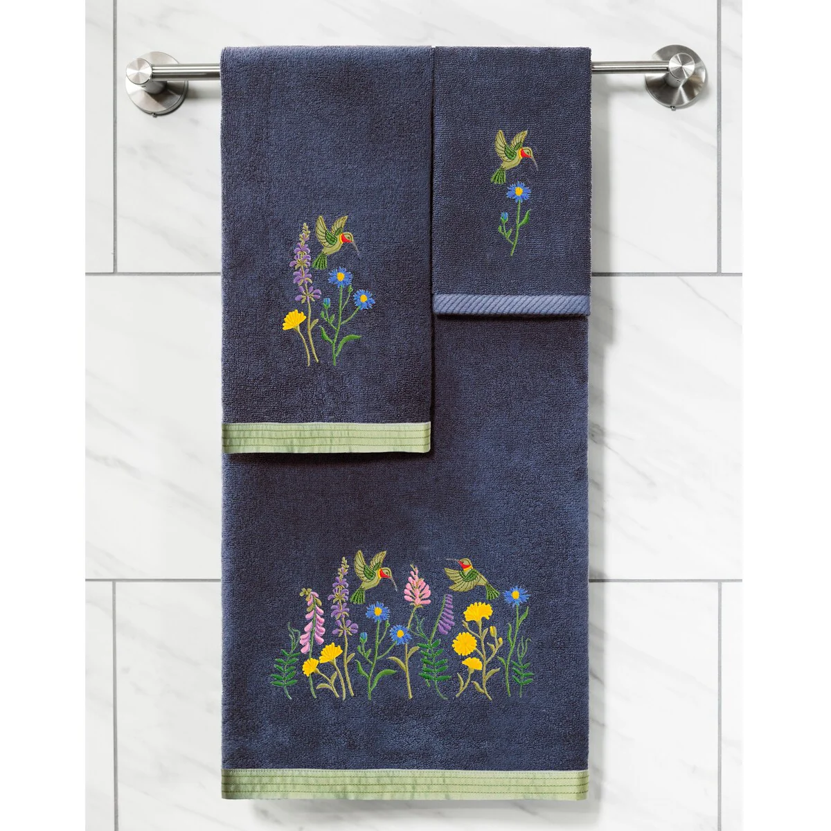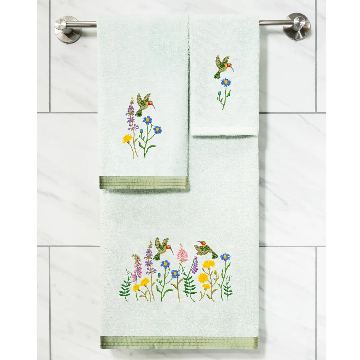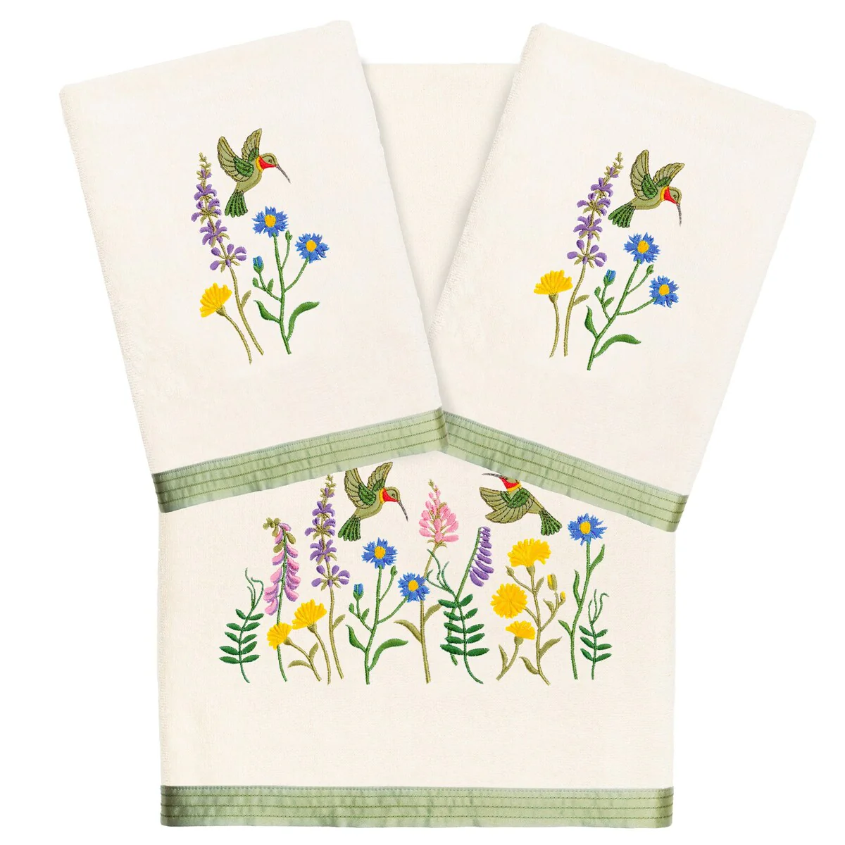 Your bath decor is not complete without delightful embroidered towels by Authentic Hotel and Spa for the comfort of your family and guests. The Hada towels feature applique hummingbirds, dancing among wild flowers and are trimmed with a lustrous taffeta border. Cloud soft and super absorbent, these luxurious, durable towels keep their plush appearance after washing. This collection is available in 8 elegant colors: White, Beige, Blush, Aqua, Silver, Cocoa, Charcoal and Marine. The Hada Towel Collection brings cheerful spirit and richness to your home decor and makes a great gift.