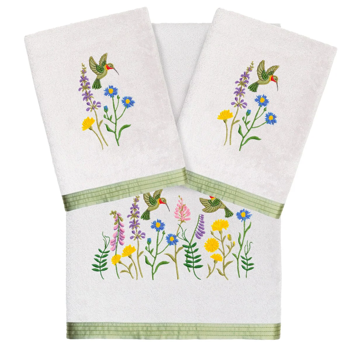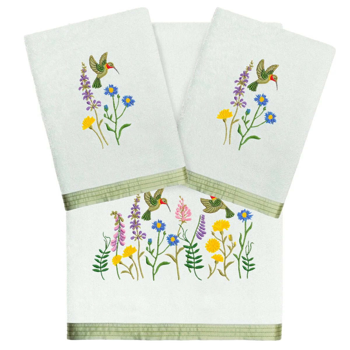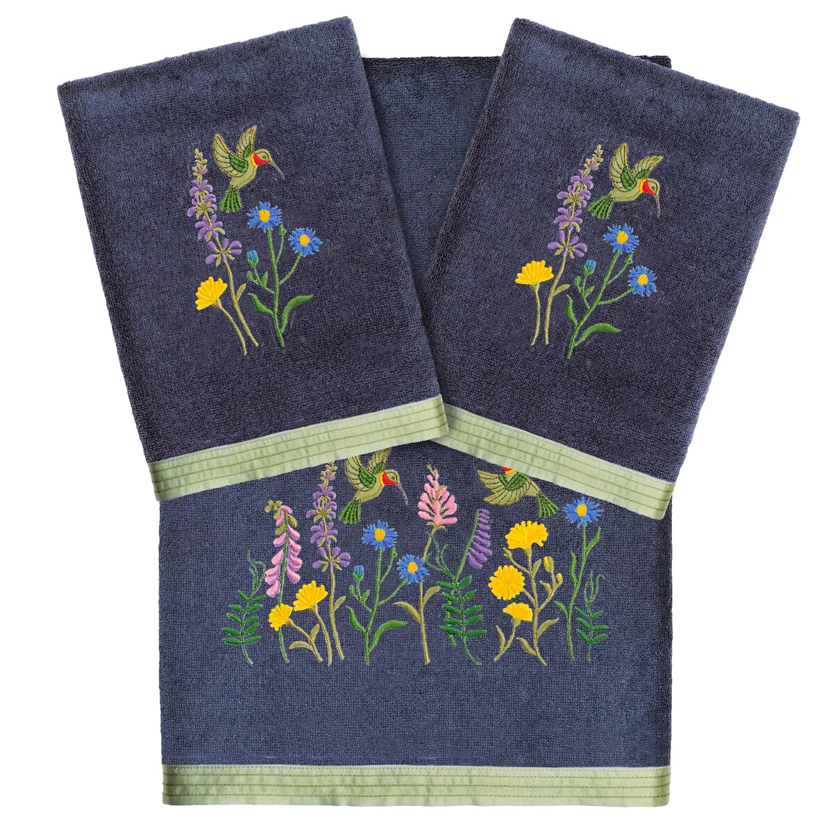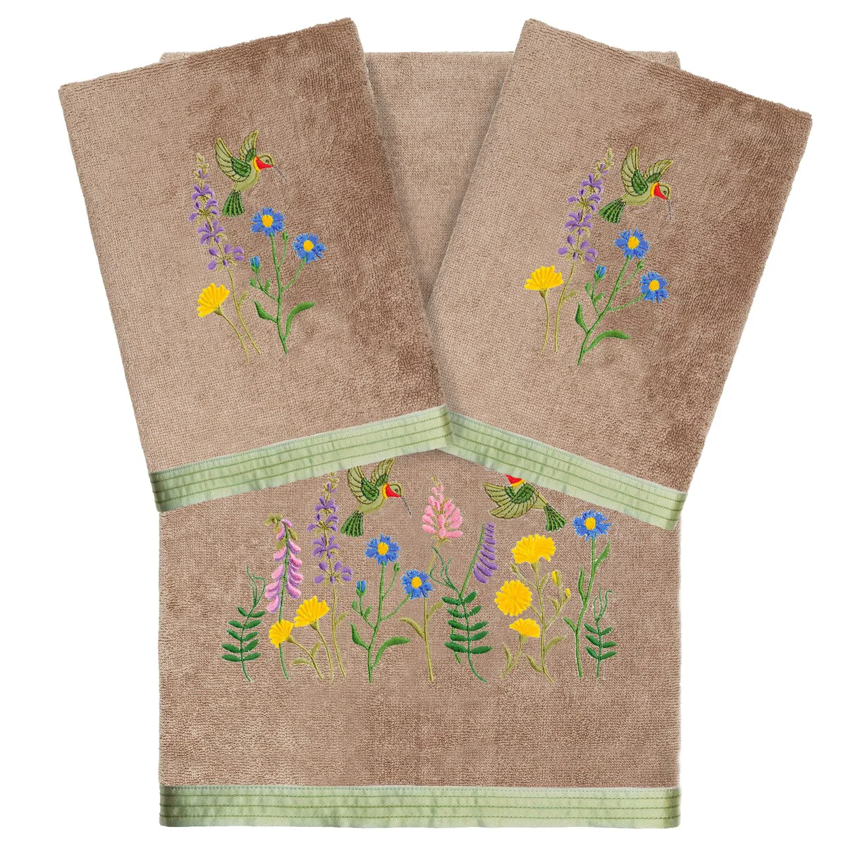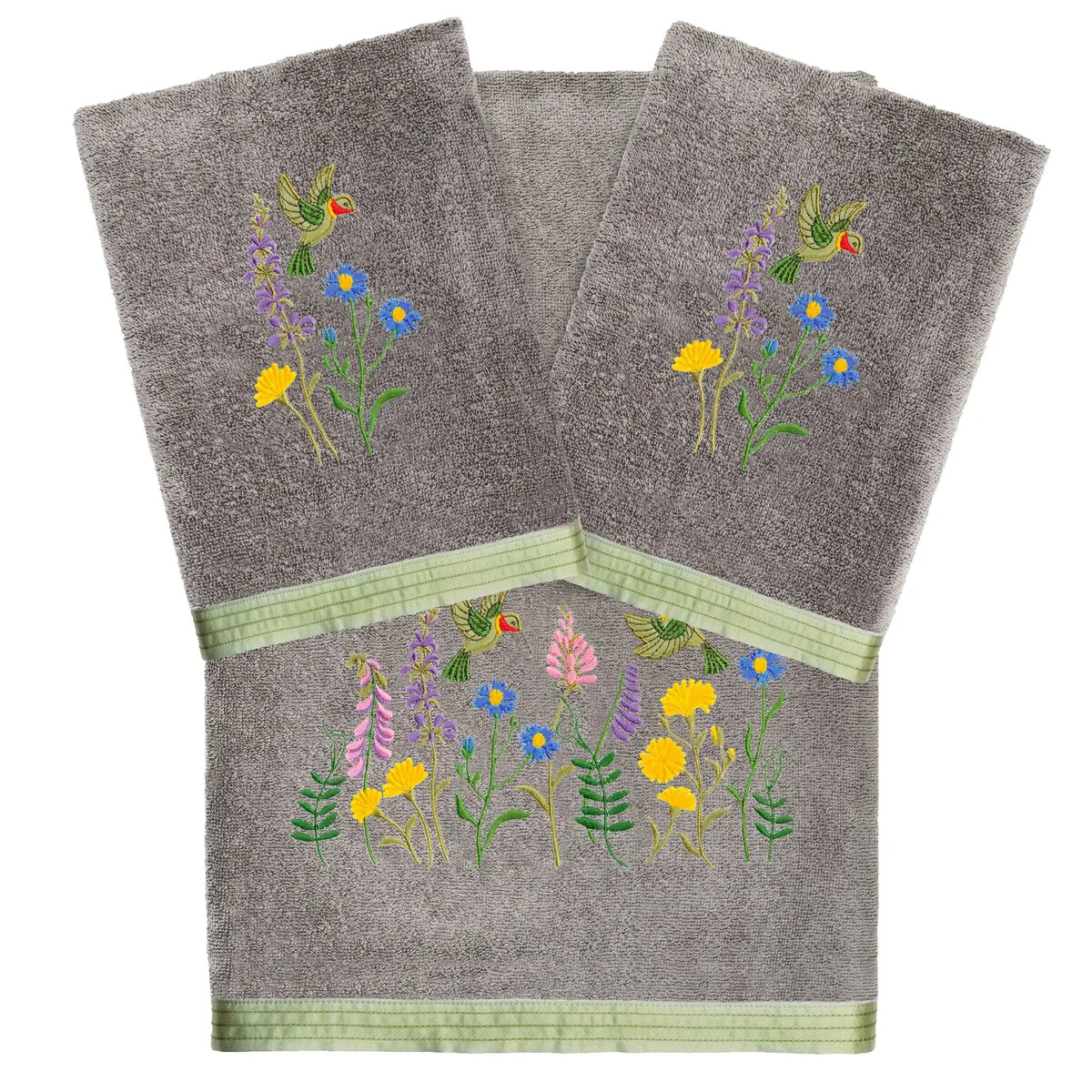 Your bath decor is not complete without delightful embroidered towels by Authentic Hotel and Spa for the comfort of your family and guests. The Hada towels feature applique hummingbirds, dancing among wild flowers and are trimmed with a lustrous taffeta border. Cloud soft and super absorbent, these luxurious, durable towels keep their plush appearance after washing. This collection is available in 8 elegant colors: White, Beige, Blush, Aqua, Silver, Cocoa, Charcoal and Marine. The Hada Towel Collection brings cheerful spirit and richness to your home decor and makes a great gift.
