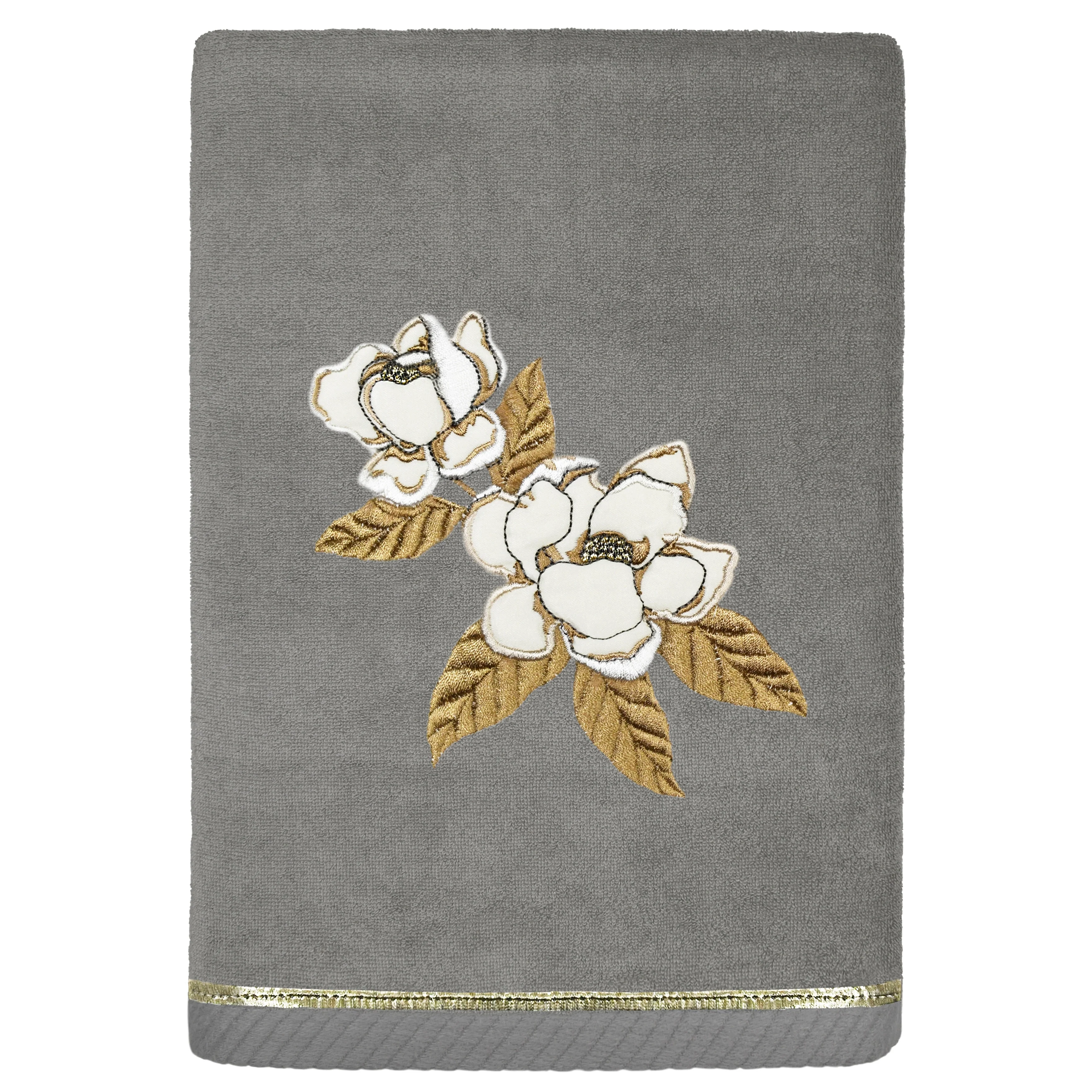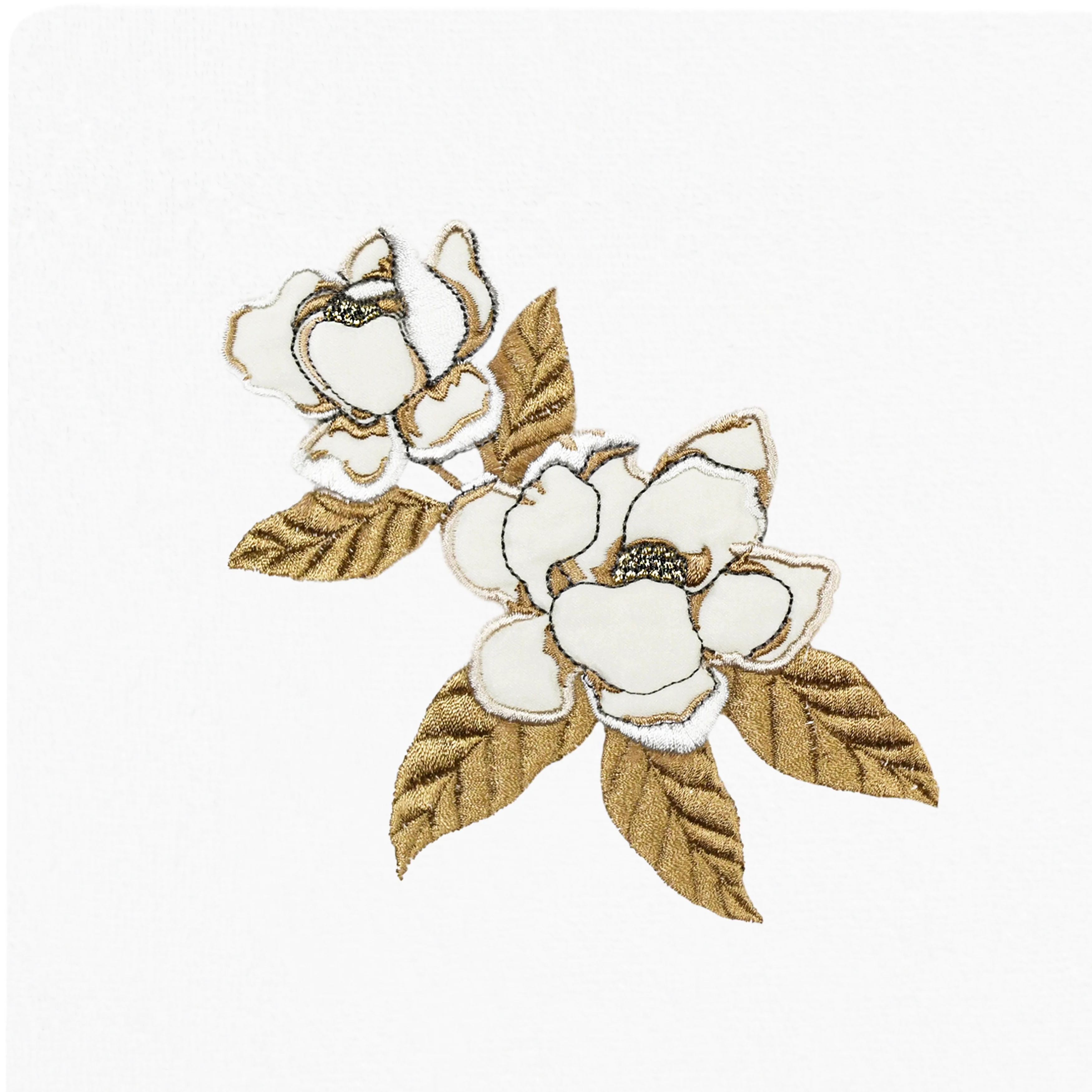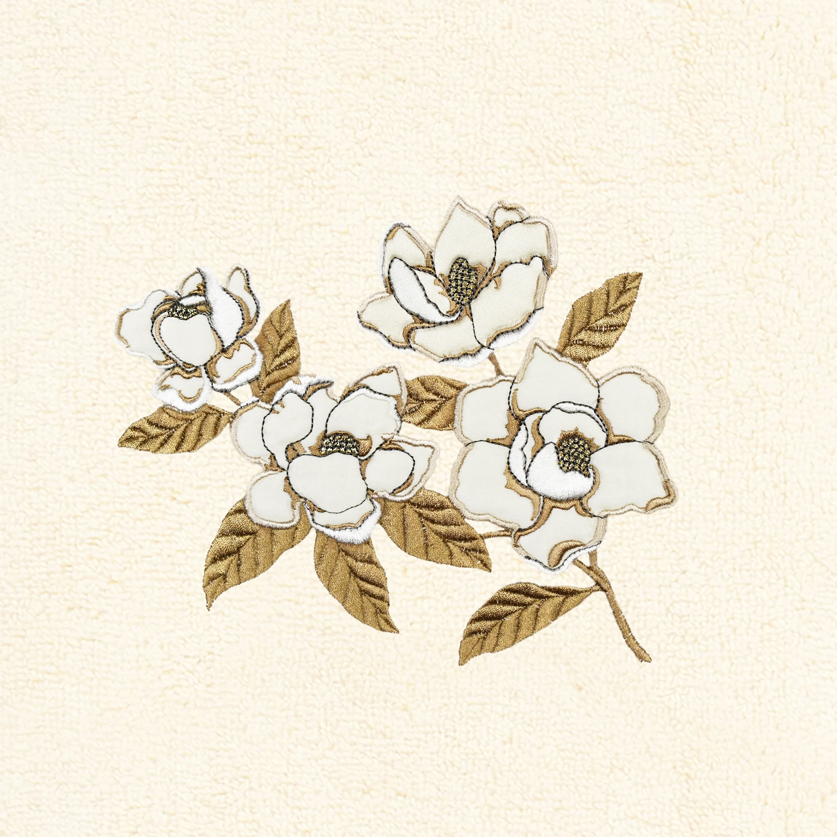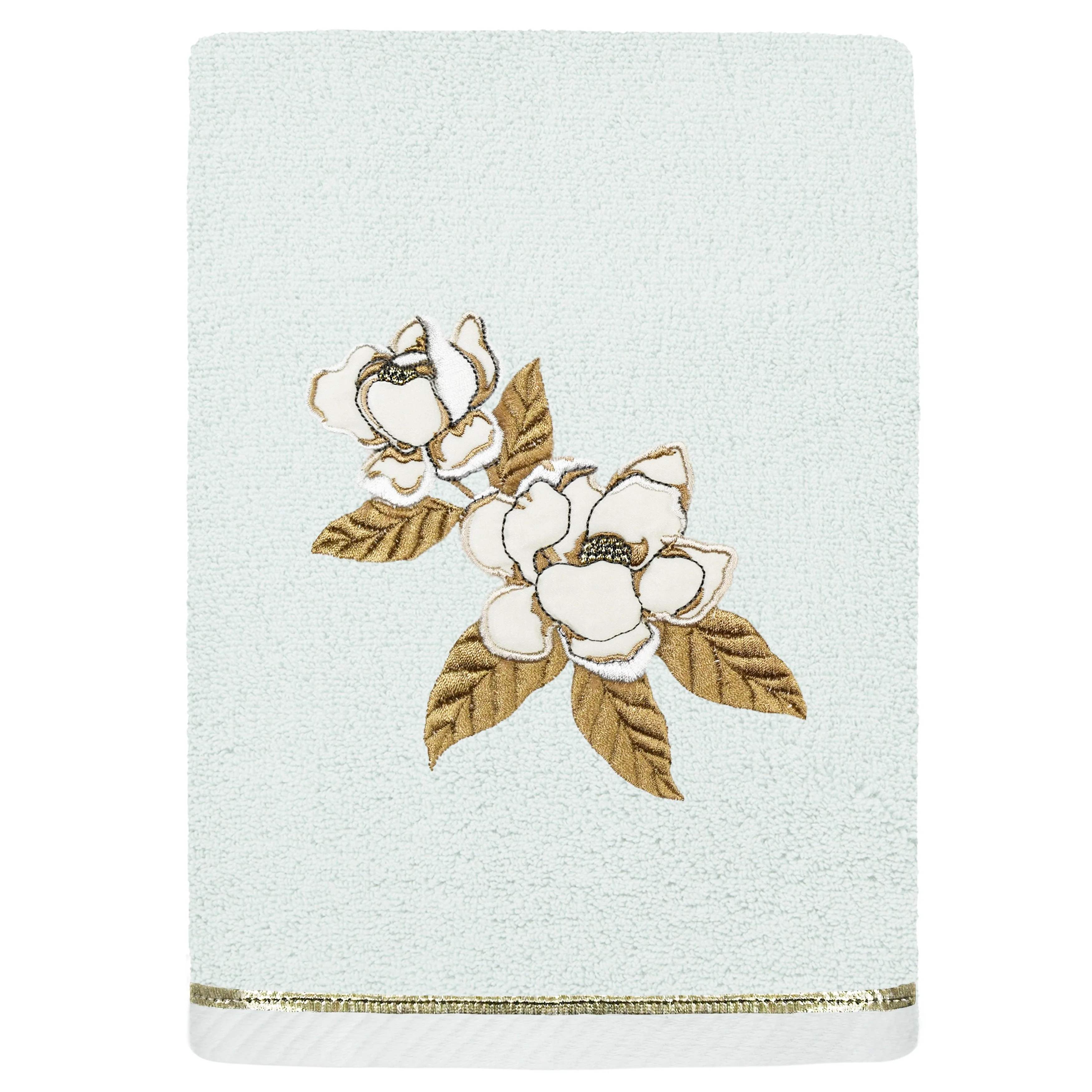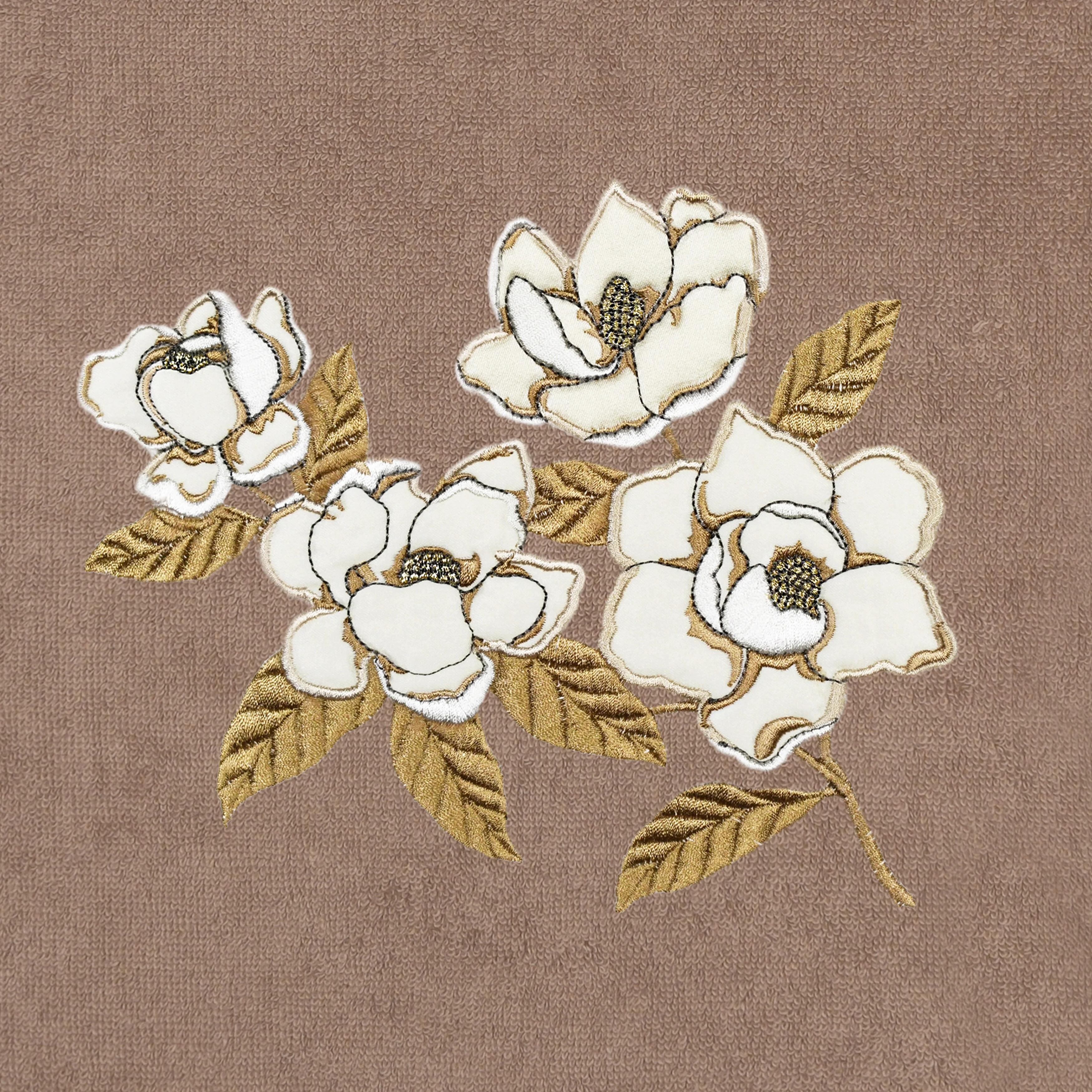 Your decorations are not complete without exquisite embroidered towels for the comfort of your family and guests. The MAGGIE towels feature a branch of lustrous applique magnolia blossoms and are trimmed with a metallic lame cord. Cloud soft and super absorbent, these luxurious, durable towels keep their plush appearance after washing. This collection is available in 8 elegant colors: White, Beige, Blush, Aqua, Silver, Cocoa, Charcoal and Marine. The MAGGIE Towel Collection brings classic spirit and richness to your home decor and makes a great gift!