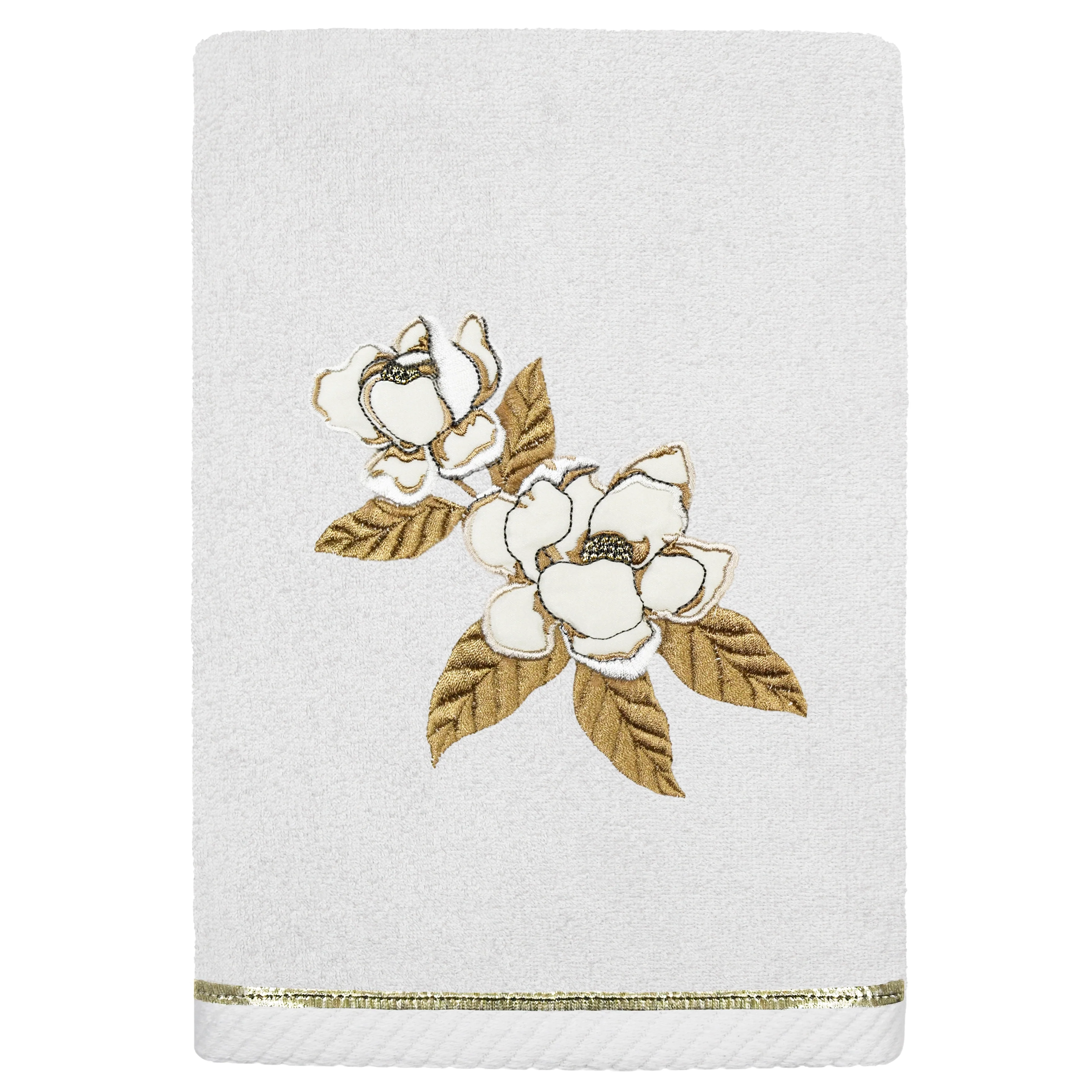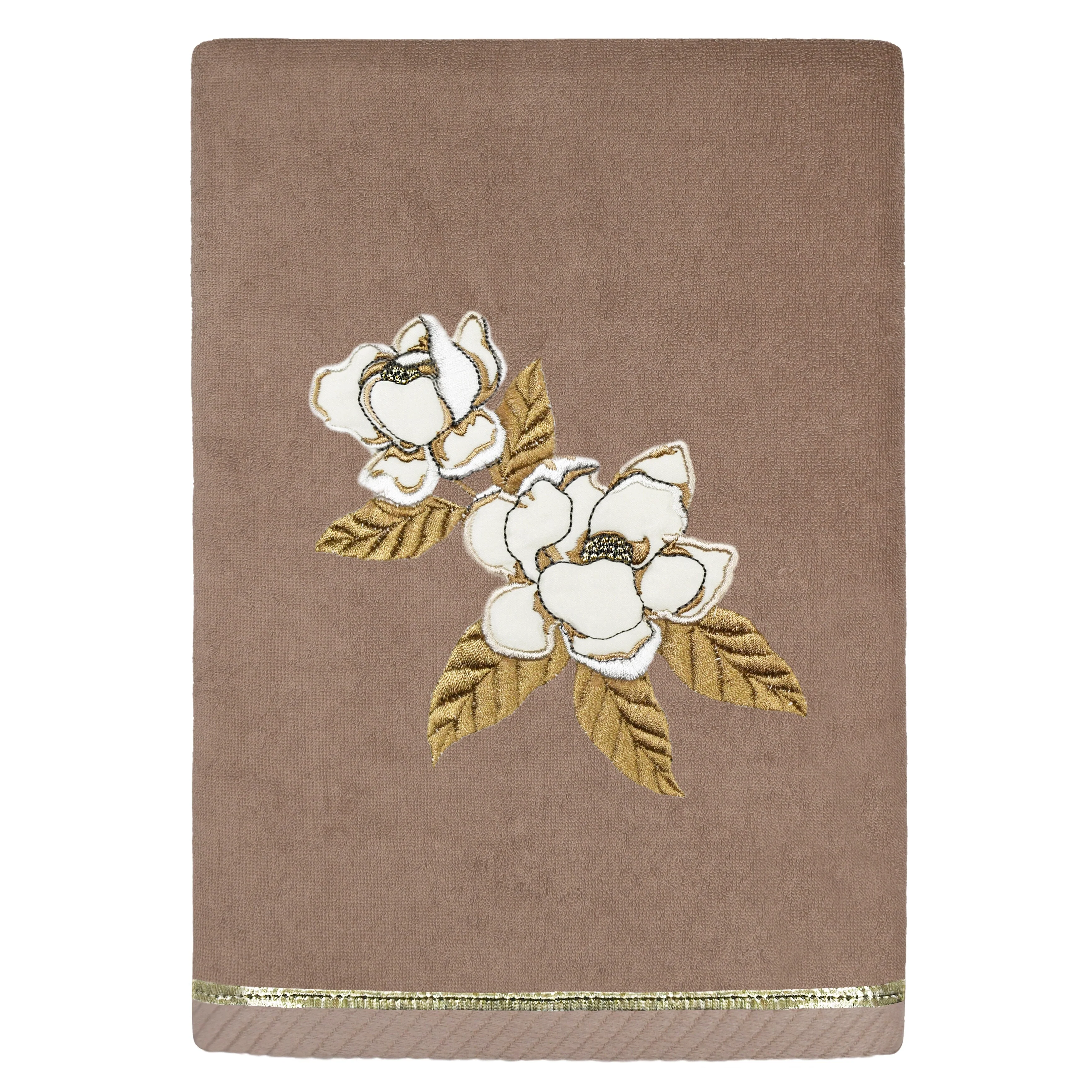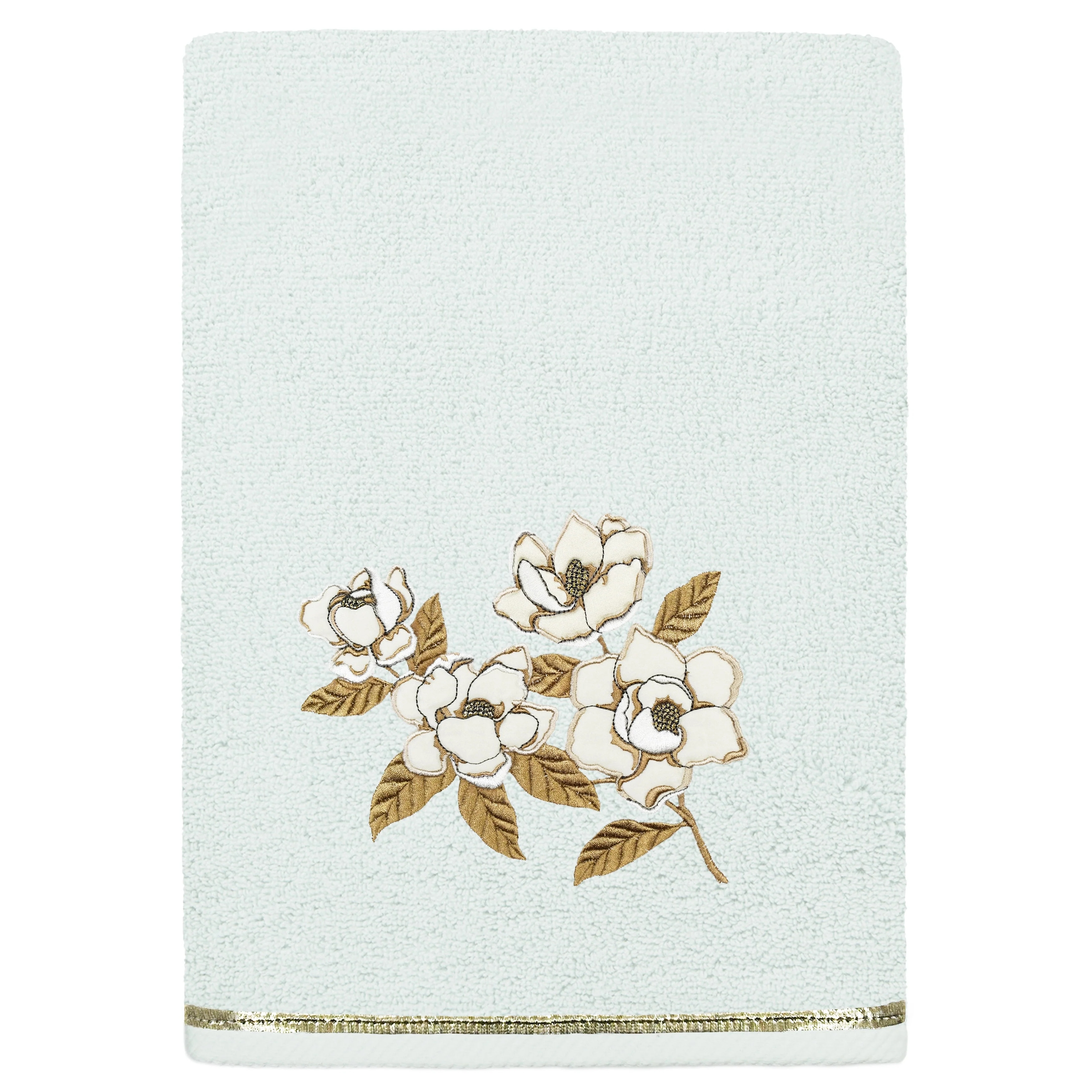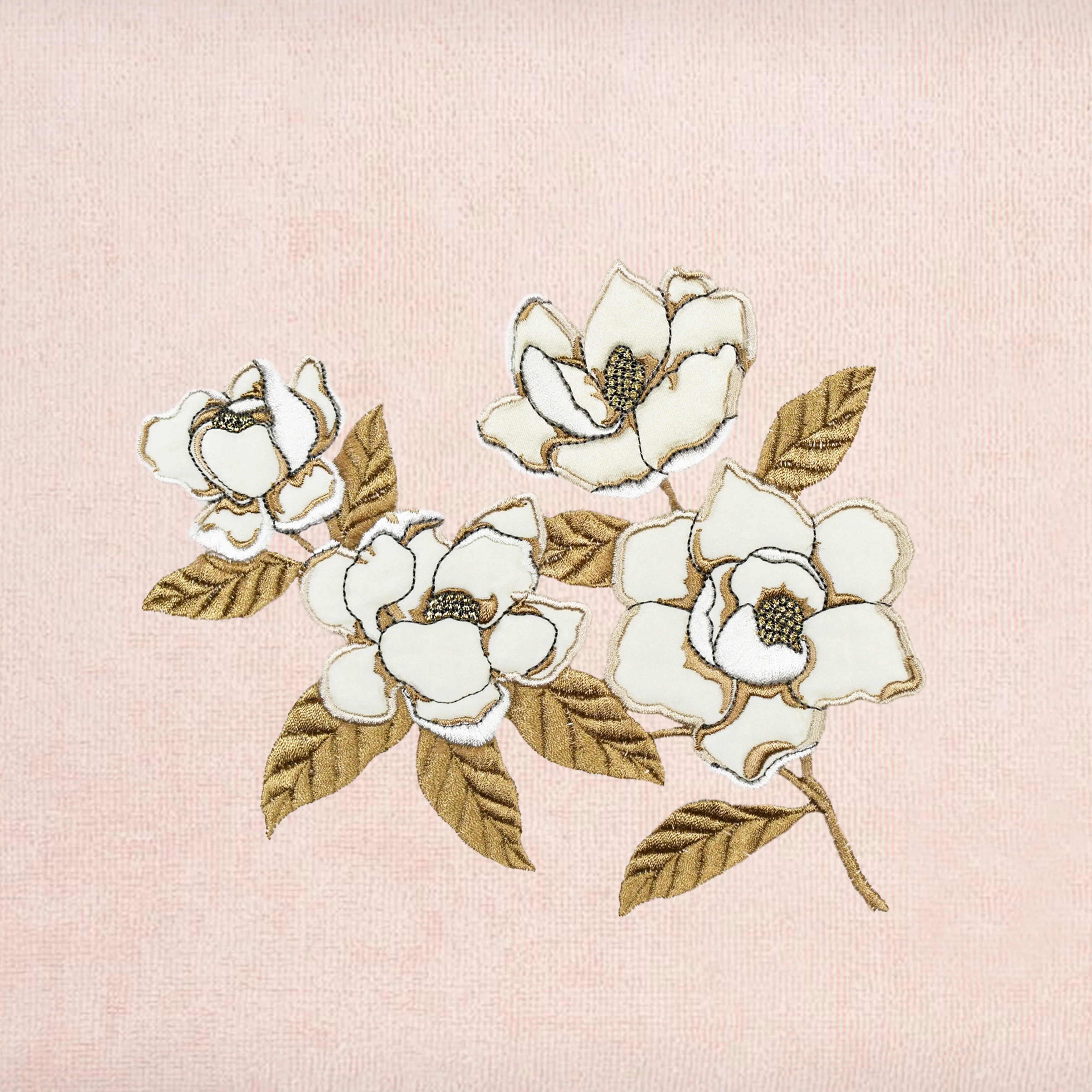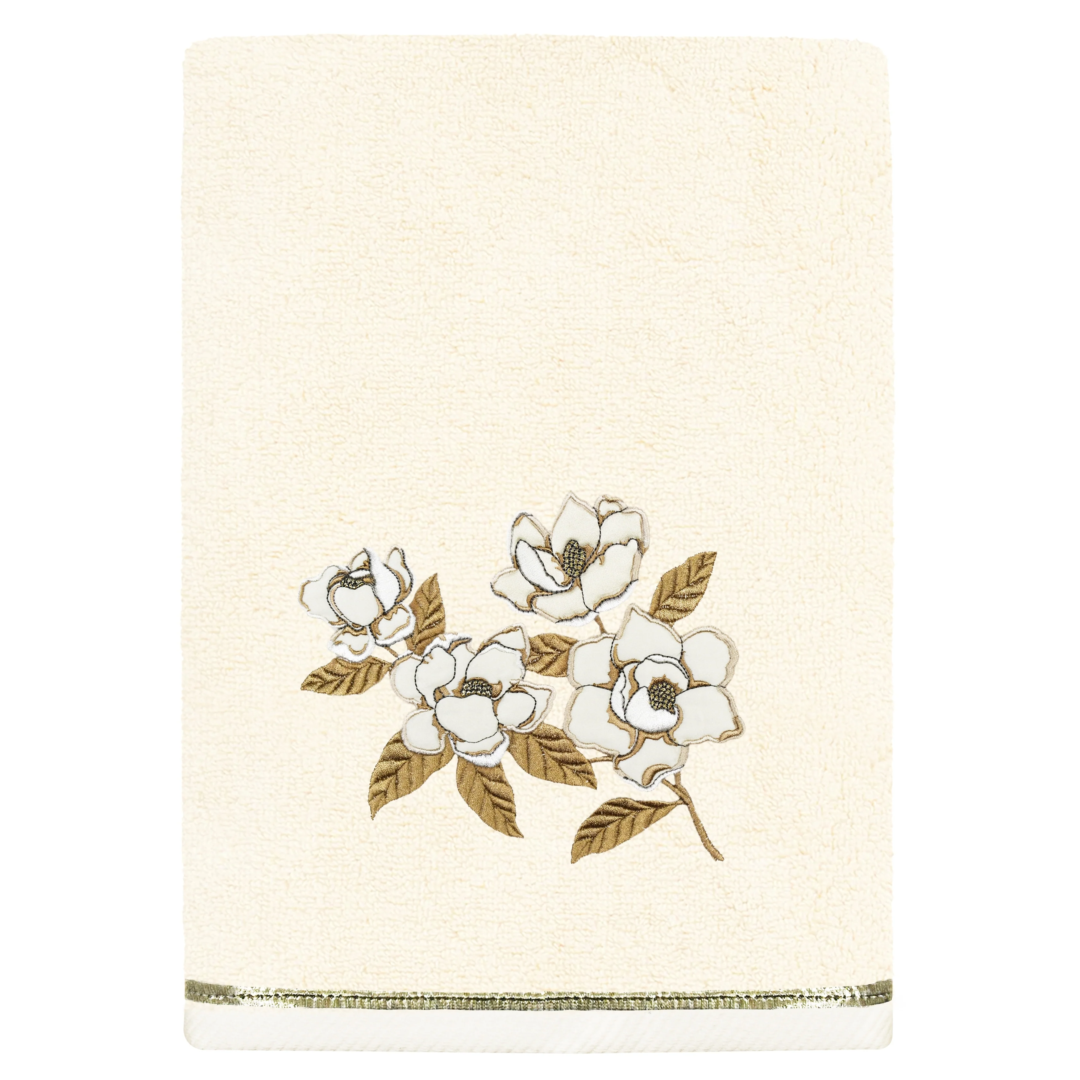 Your decorations are not complete without exquisite embroidered towels for the comfort of your family and guests. The MAGGIE towels feature a branch of lustrous applique magnolia blossoms and are trimmed with a metallic lame cord. Cloud soft and super absorbent, these luxurious, durable towels keep their plush appearance after washing. This collection is available in 8 elegant colors: White, Beige, Blush, Aqua, Silver, Cocoa, Charcoal and Marine. The MAGGIE Towel Collection brings classic spirit and richness to your home decor and makes a great gift!