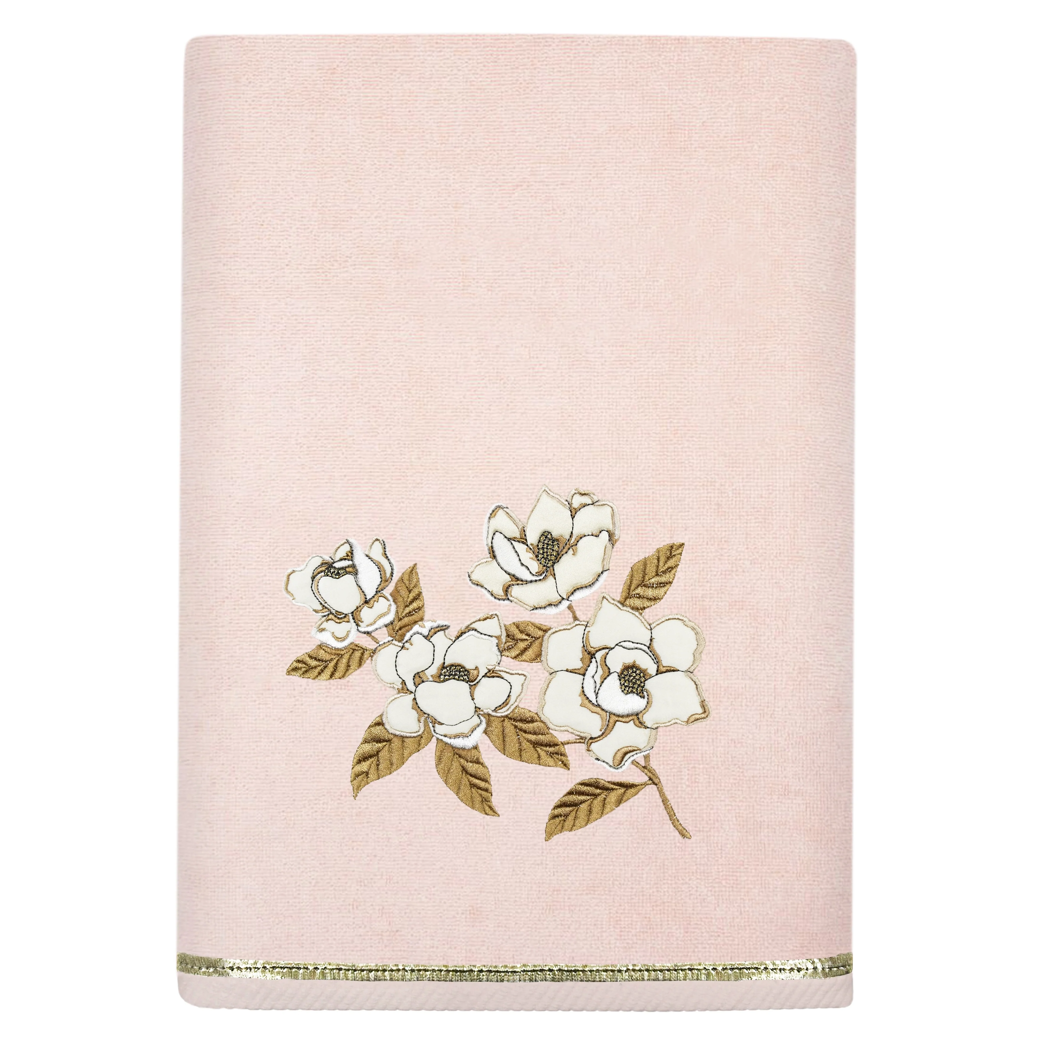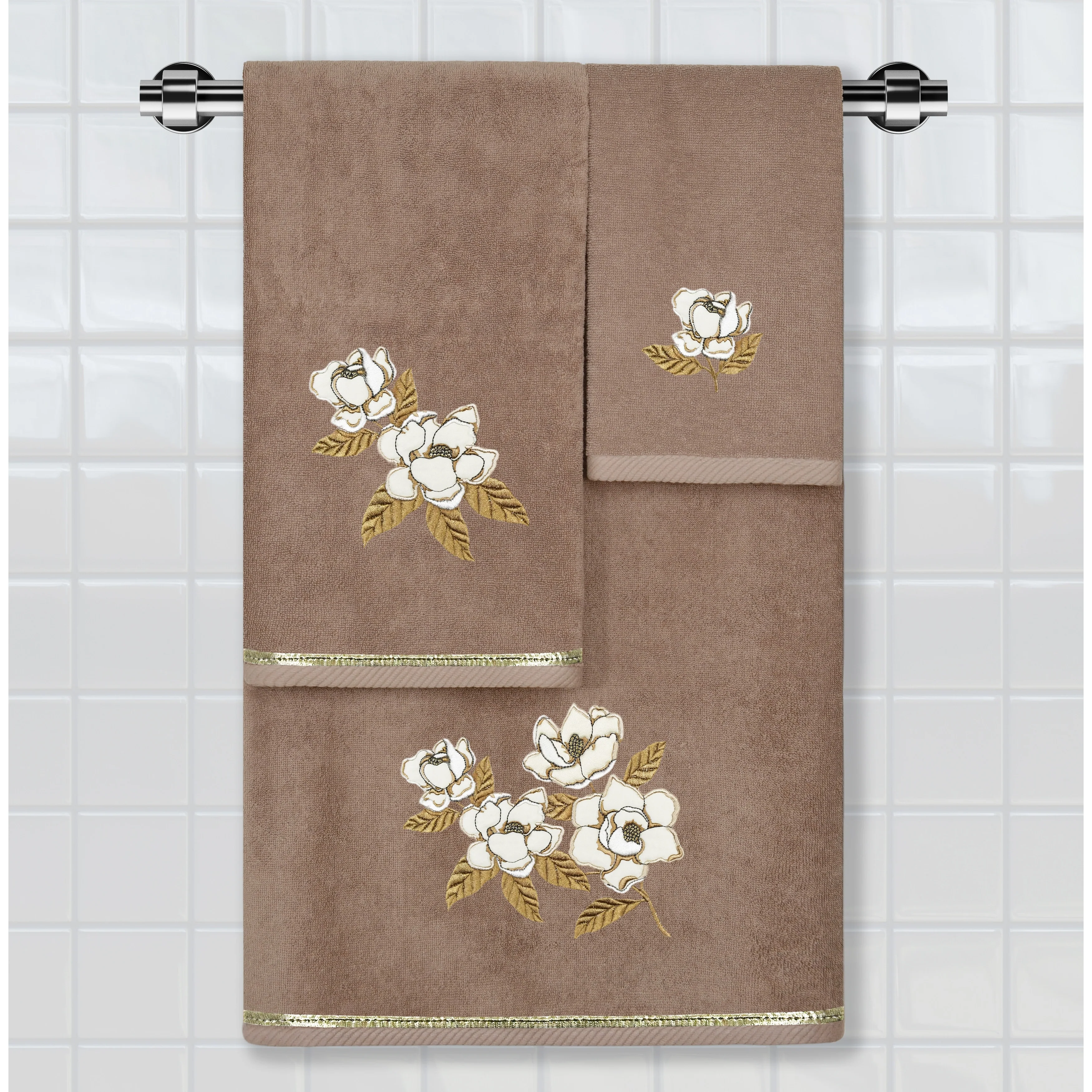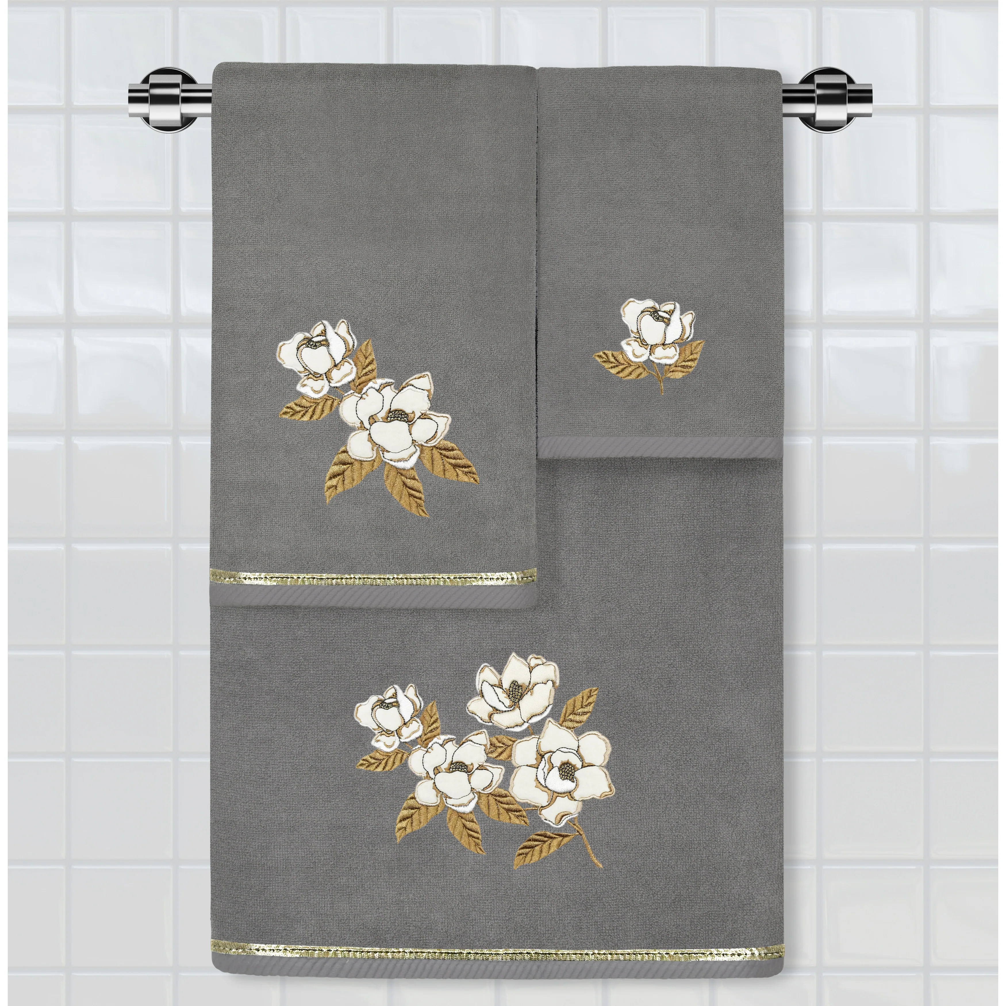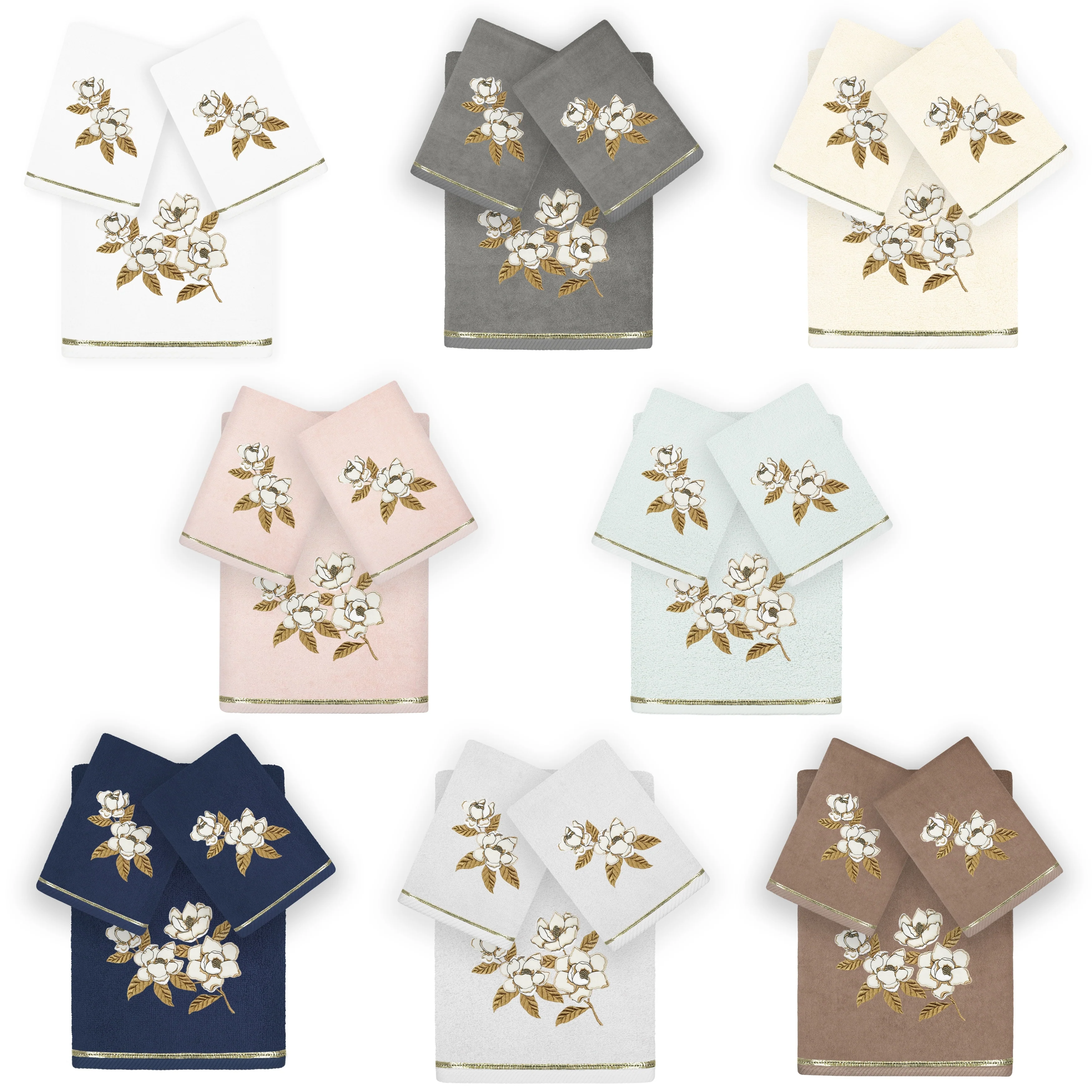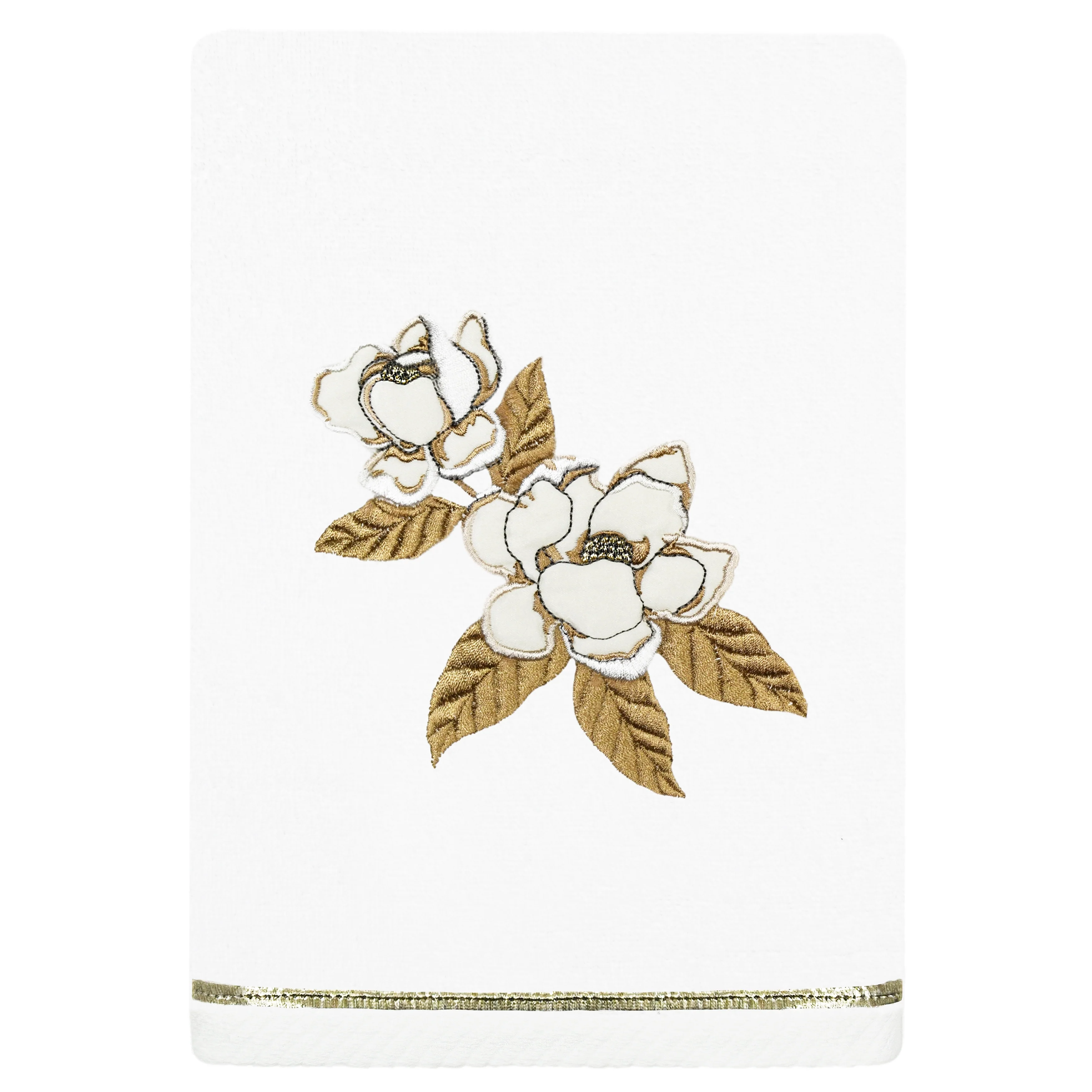 Your decorations are not complete without exquisite embroidered towels for the comfort of your family and guests. The MAGGIE towels feature a branch of lustrous applique magnolia blossoms and are trimmed with a metallic lame cord. Cloud soft and super absorbent, these luxurious, durable towels keep their plush appearance after washing. This collection is available in 8 elegant colors: White, Beige, Blush, Aqua, Silver, Cocoa, Charcoal and Marine. The MAGGIE Towel Collection brings classic spirit and richness to your home decor and makes a great gift!