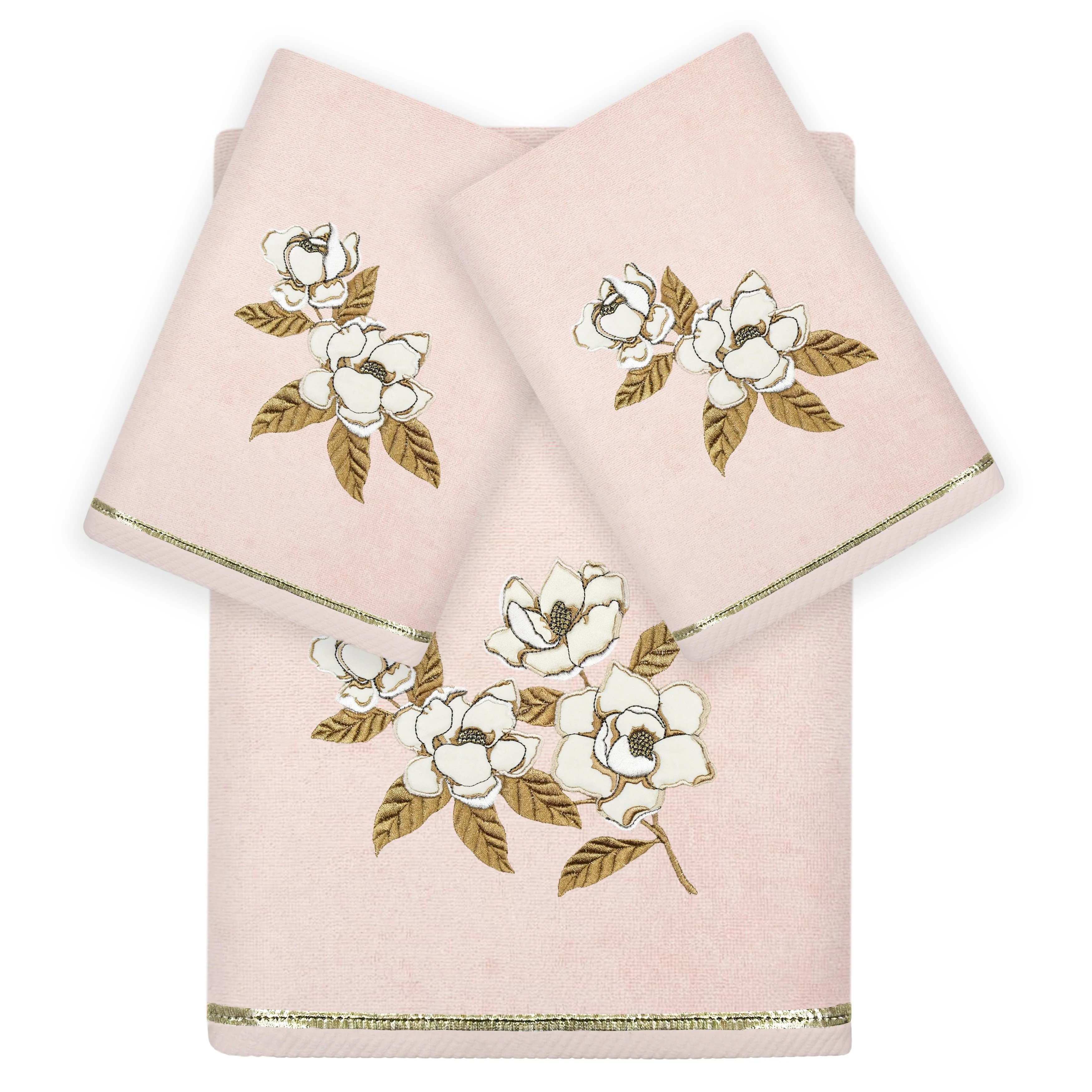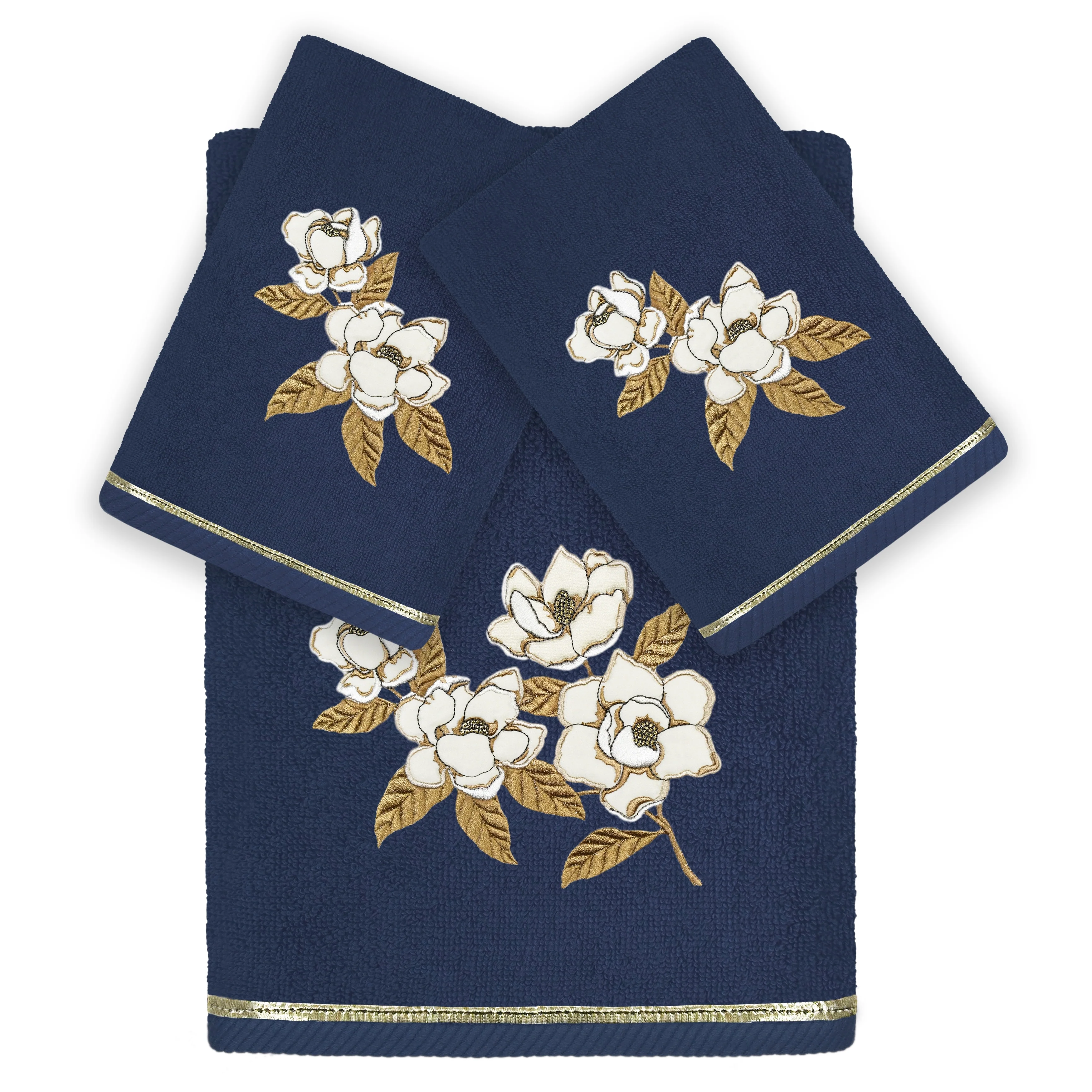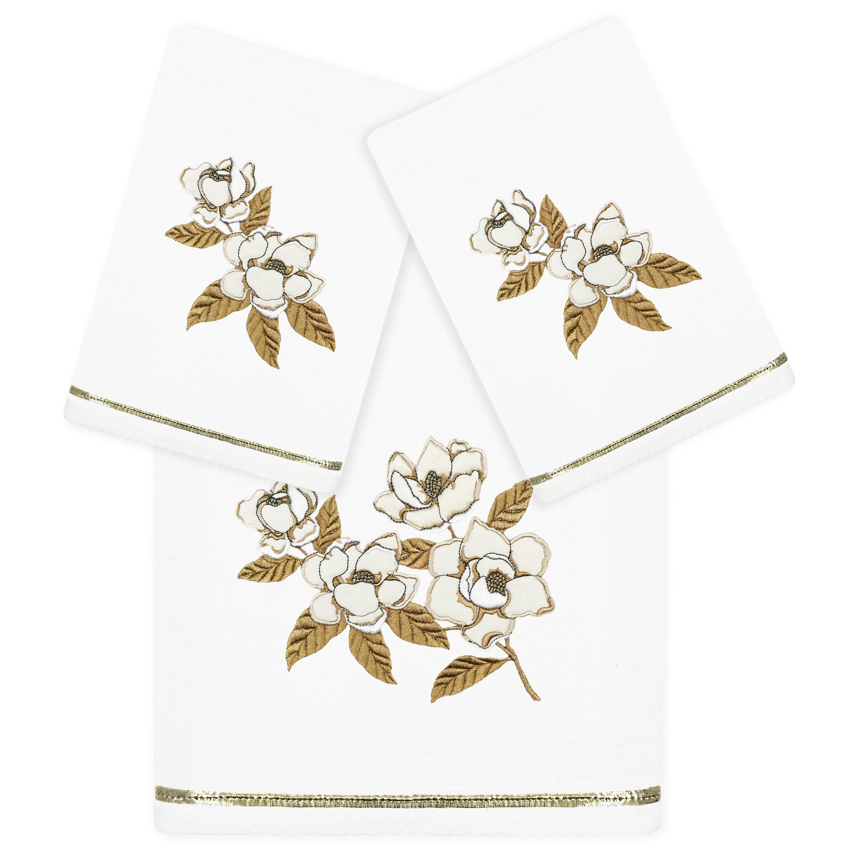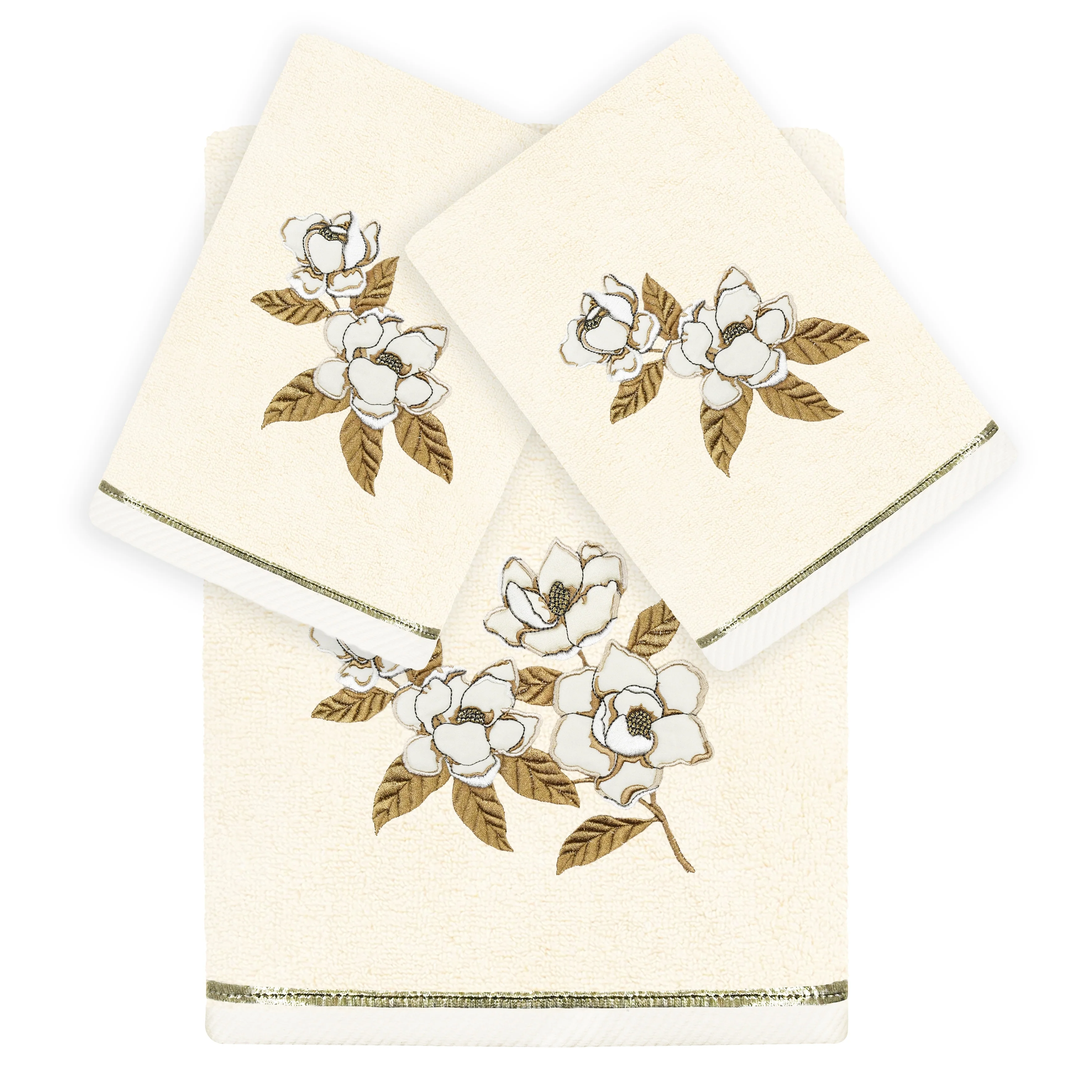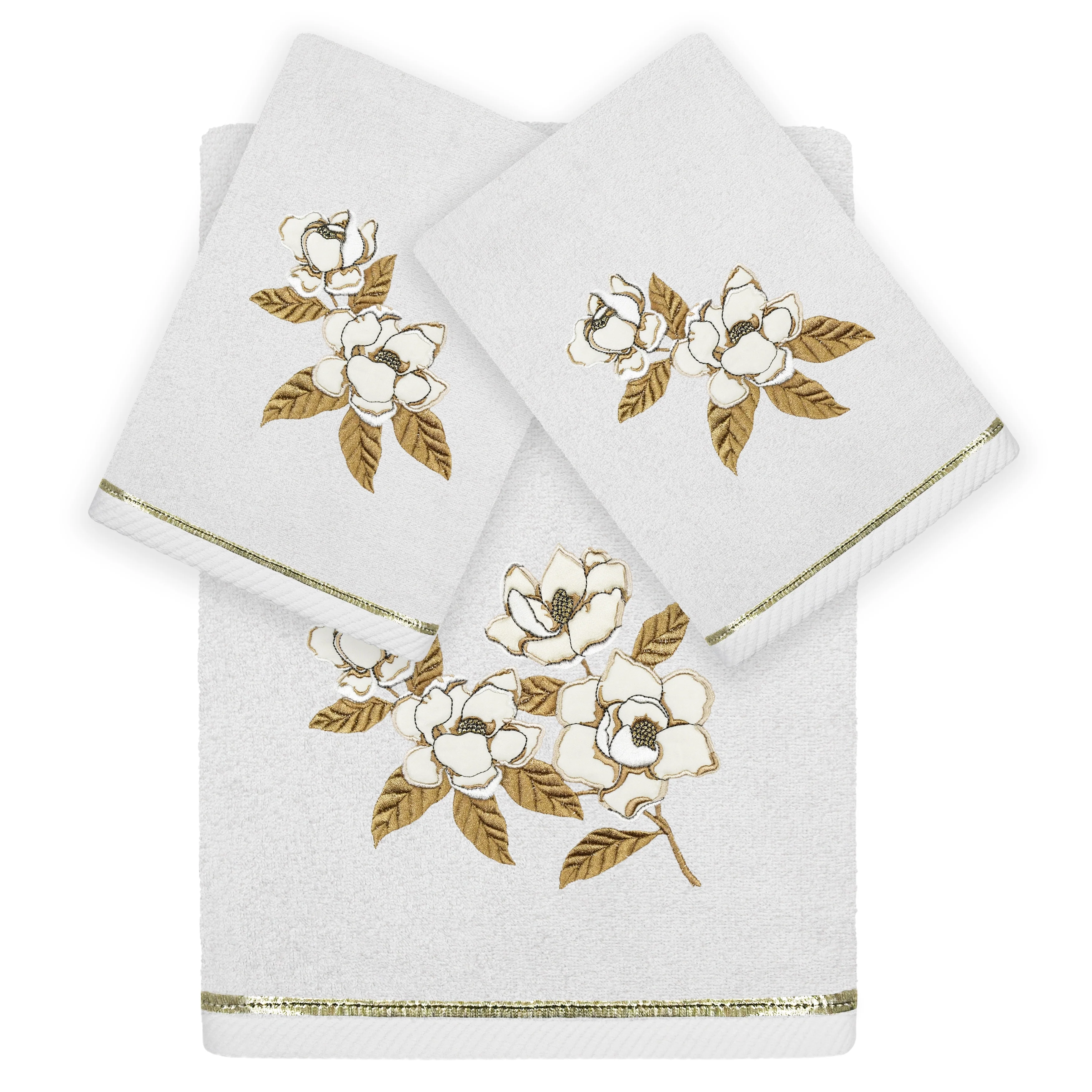Your decorations are not complete without exquisite embroidered towels for the comfort of your family and guests. The MAGGIE towels feature a branch of lustrous applique magnolia blossoms and are trimmed with a metallic lame cord. Cloud soft and super absorbent, these luxurious, durable towels keep their plush appearance after washing. This collection is available in 8 elegant colors: White, Beige, Blush, Aqua, Silver, Cocoa, Charcoal and Marine. The MAGGIE Towel Collection brings classic spirit and richness to your home decor and makes a great gift!