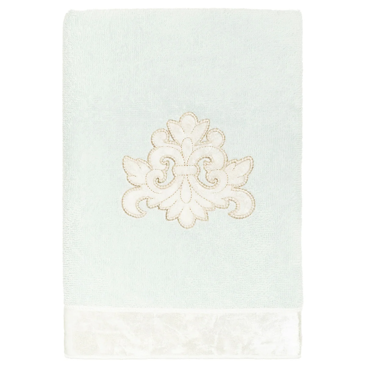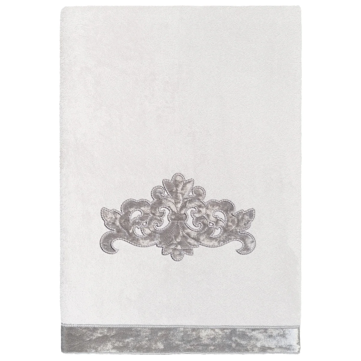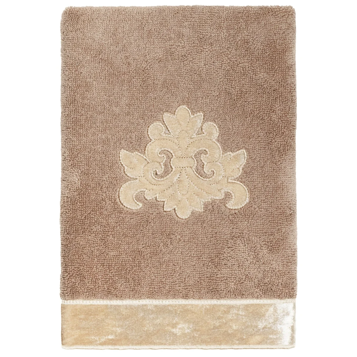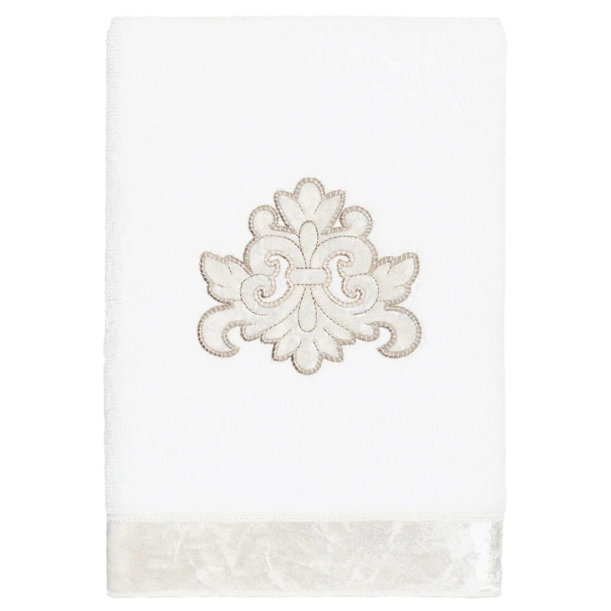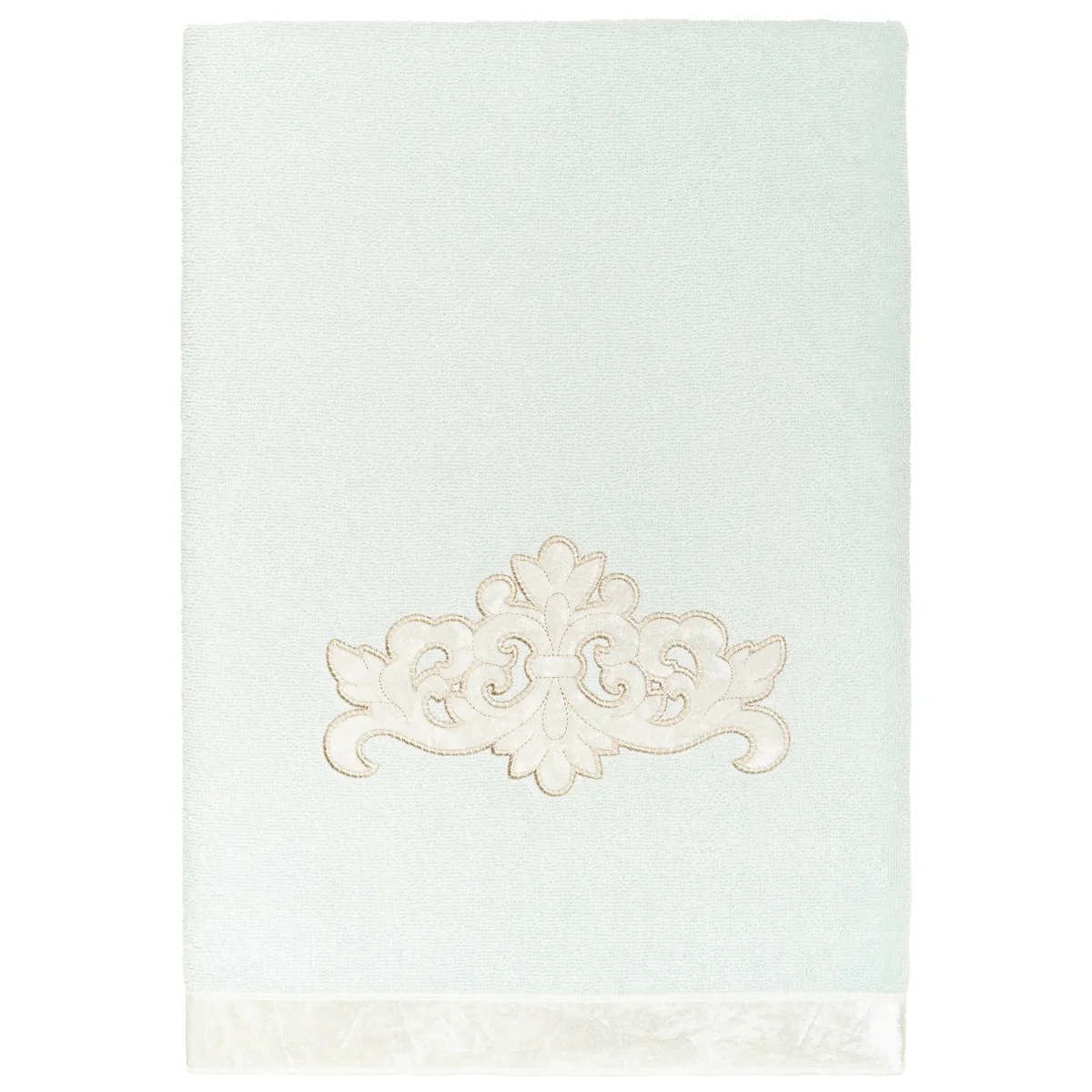 Your decorations are not complete without elegant embroidered towels by Authentic Hotel and Spa for the comfort of your family and guests. The May towels feature a classic velvet crest applique and are trimmed with the same lustrous velvet border. Cloud soft and super absorbent, these luxurious, durable towels keep their plush appearance after washing. This collection is available in 8 elegant colors: White, Beige, Blush, Aqua, Silver, Cocoa, Charcoal and Marine. The May Towel Collection brings a refined spirit and richness to your home decor and makes a great gift.