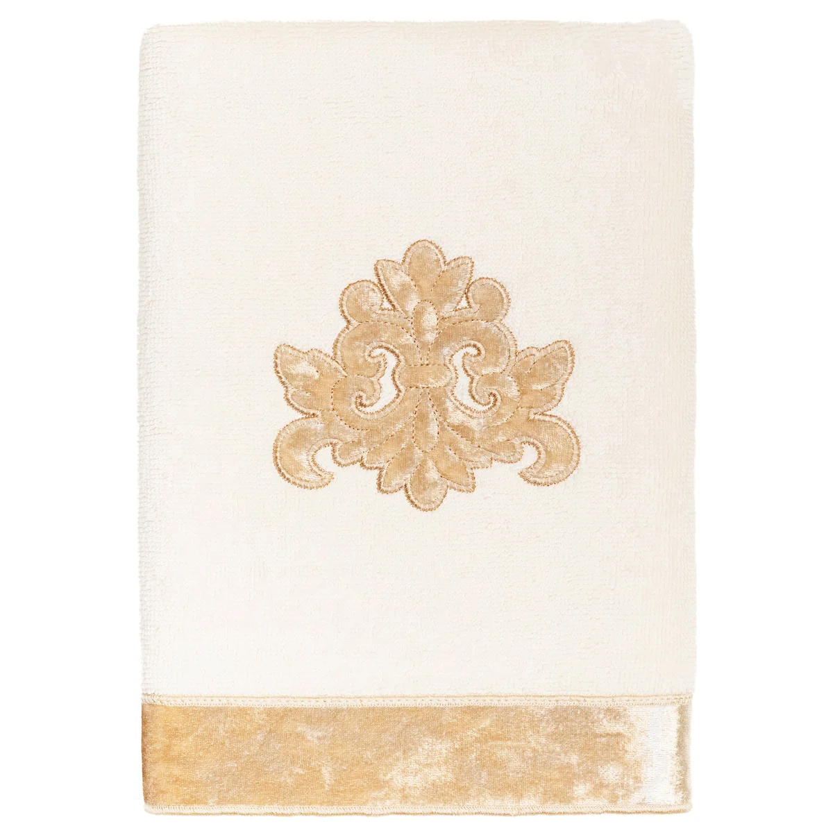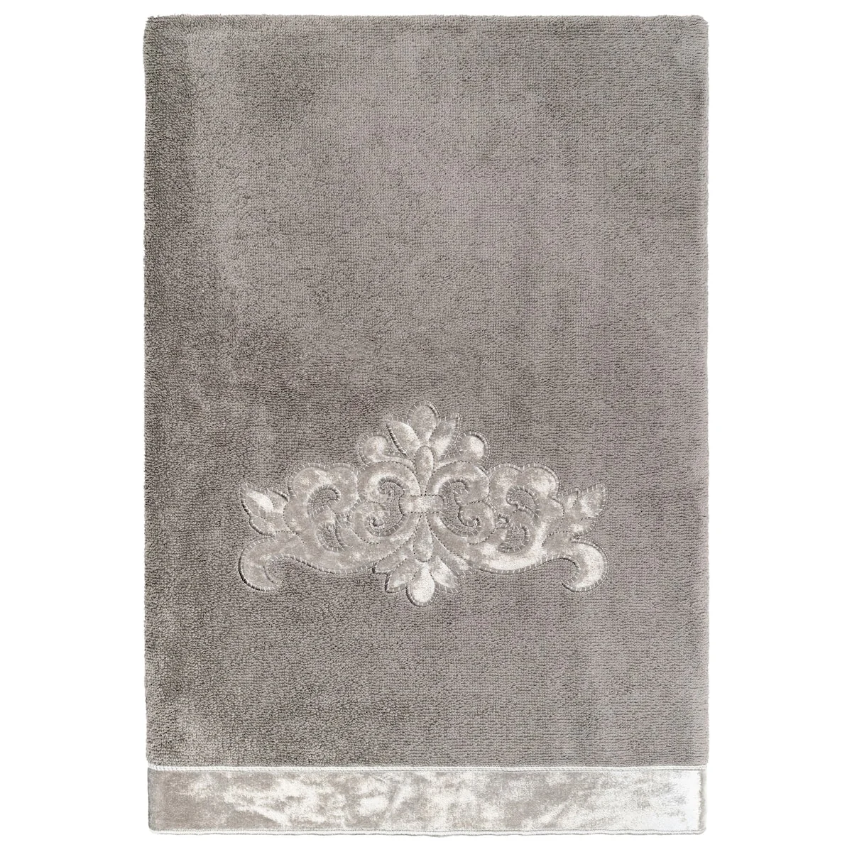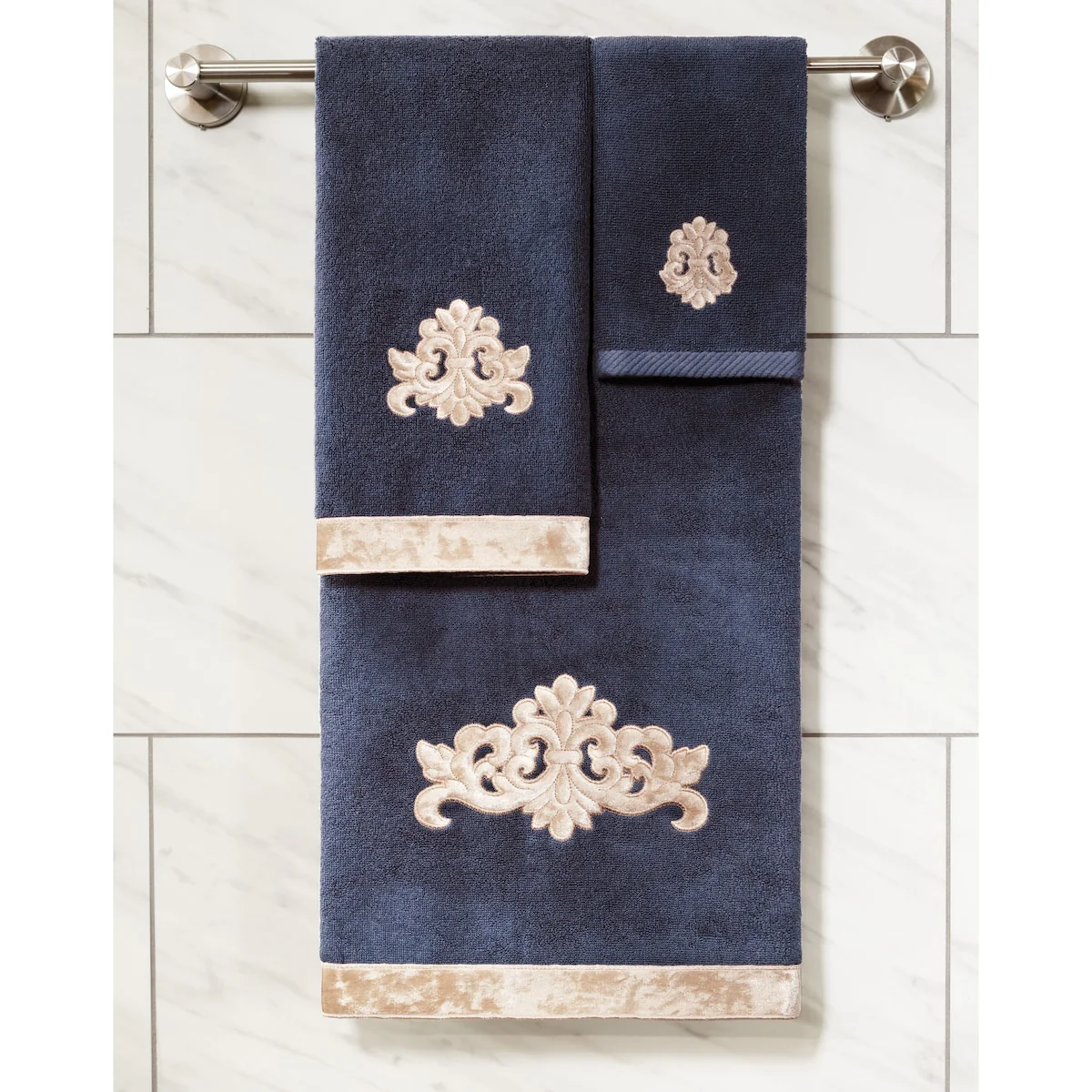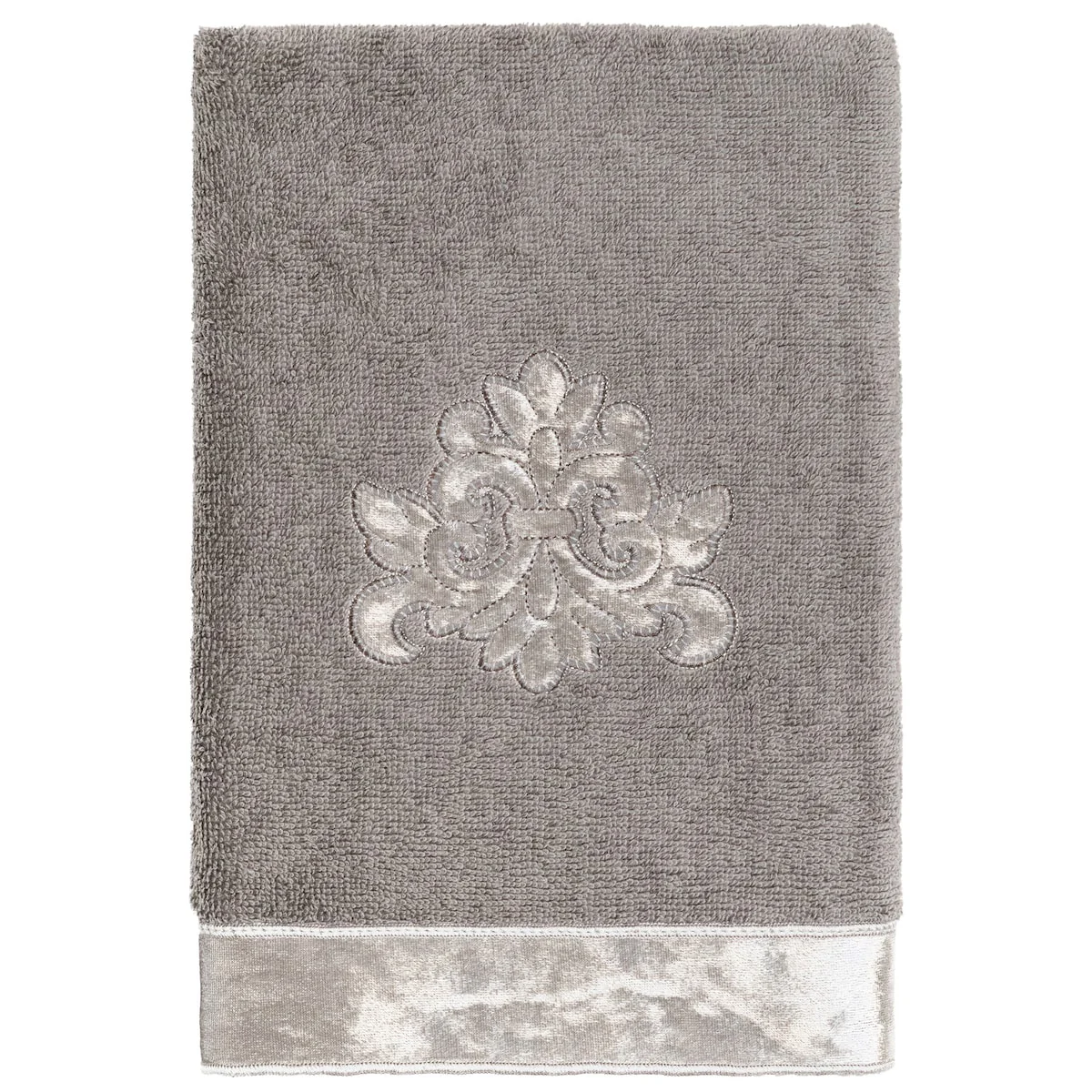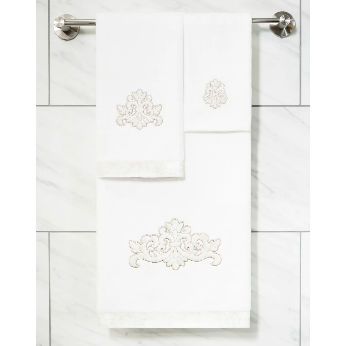 Your decorations are not complete without elegant embroidered towels by Authentic Hotel and Spa for the comfort of your family and guests. The May towels feature a classic velvet crest applique and are trimmed with the same lustrous velvet border. Cloud soft and super absorbent, these luxurious, durable towels keep their plush appearance after washing. This collection is available in 8 elegant colors: White, Beige, Blush, Aqua, Silver, Cocoa, Charcoal and Marine. The May Towel Collection brings a refined spirit and richness to your home decor and makes a great gift.
