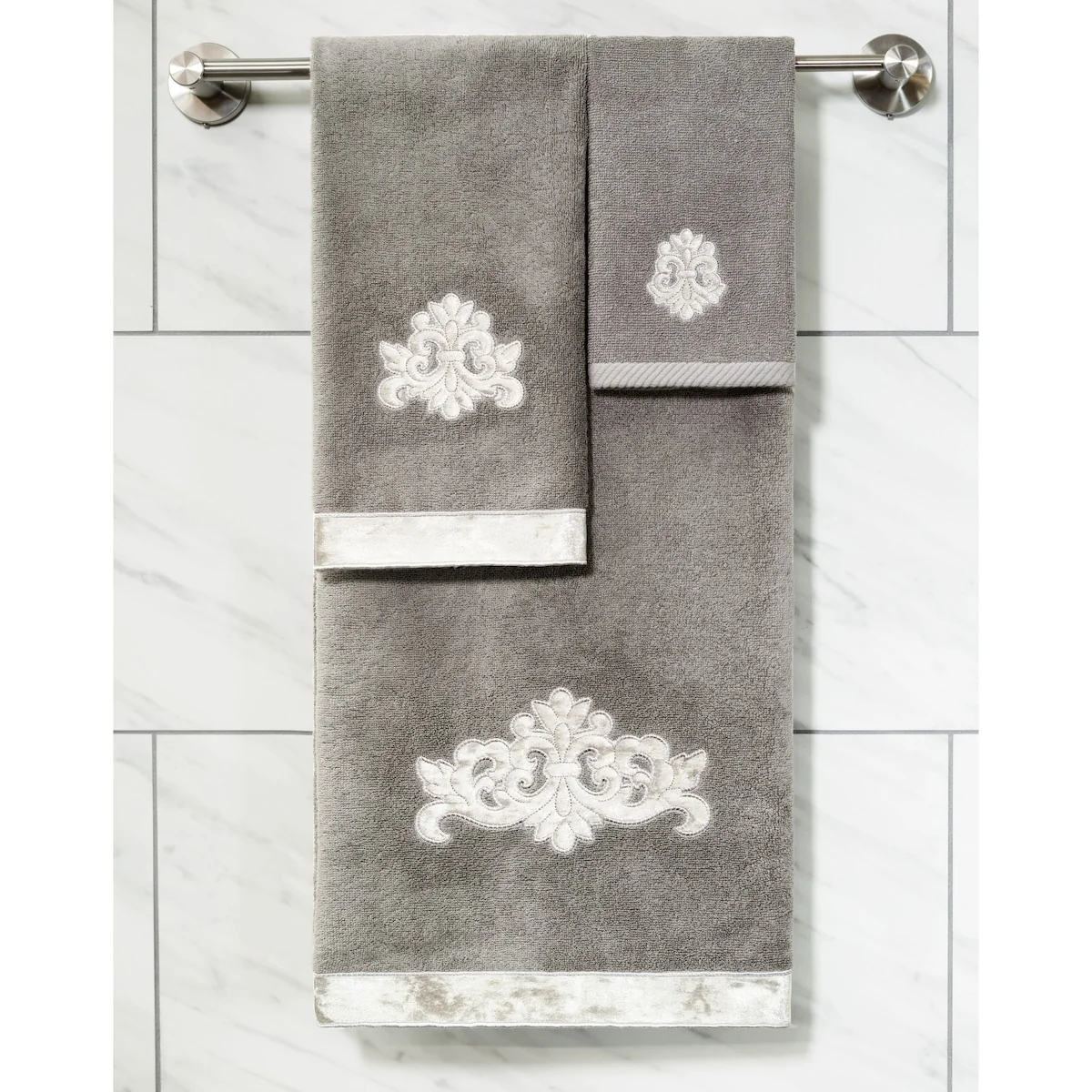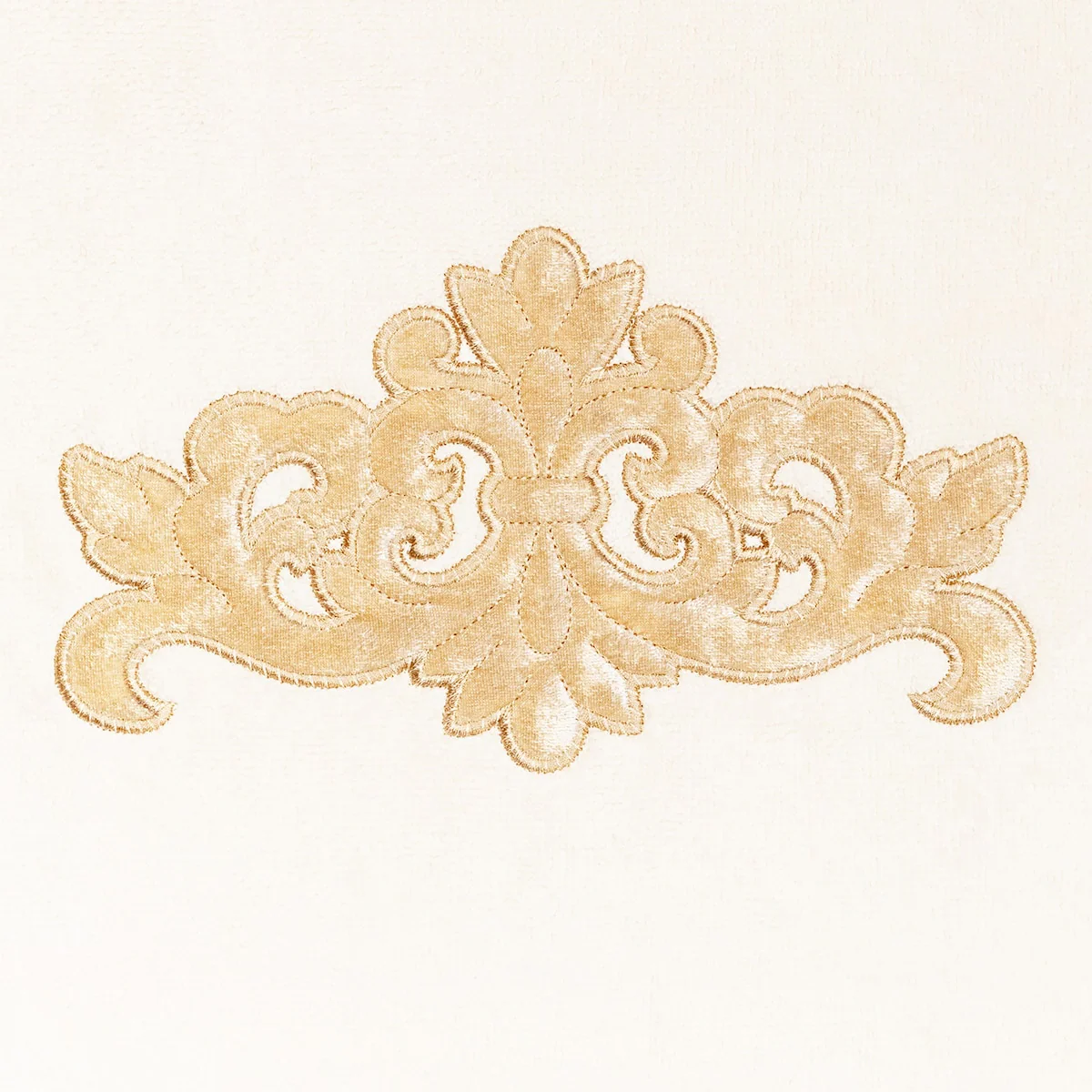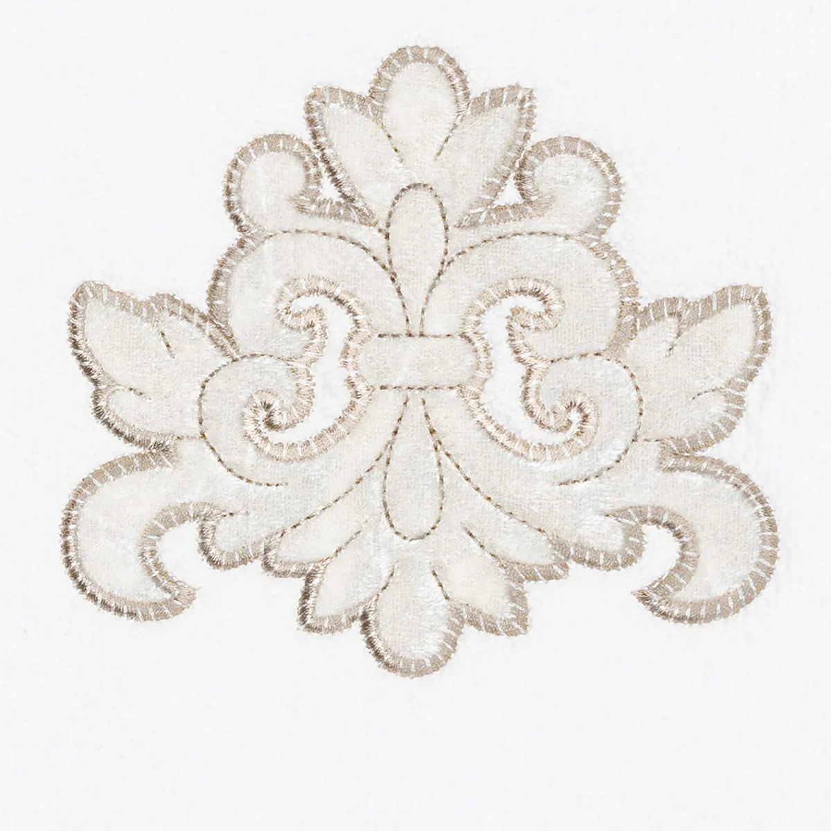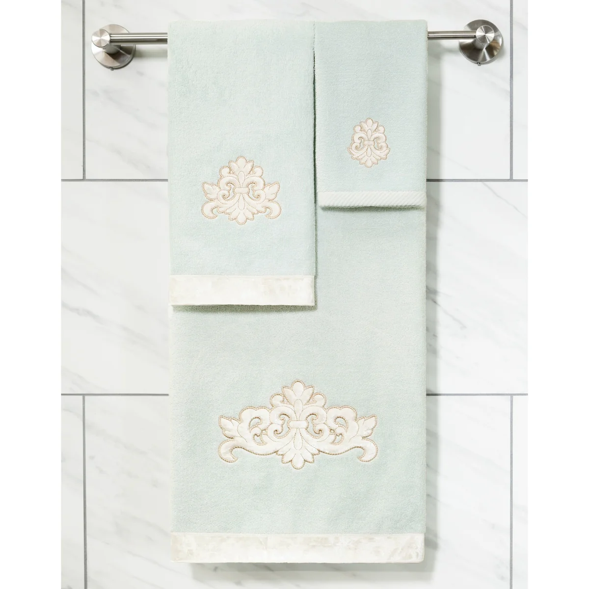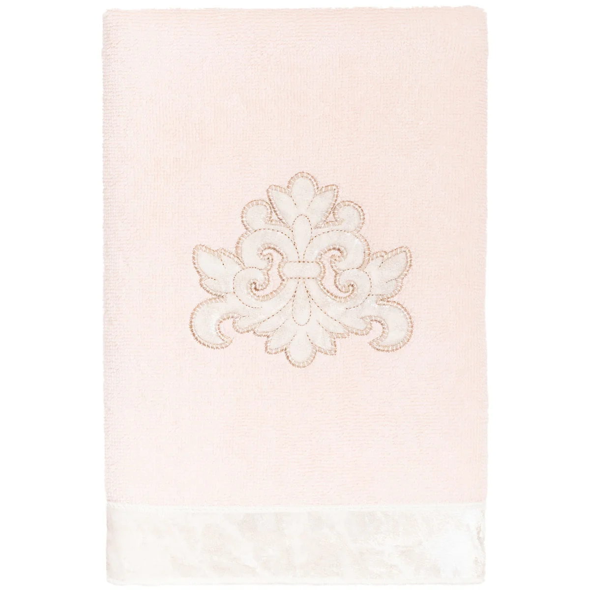 Your decorations are not complete without elegant embroidered towels by Authentic Hotel and Spa for the comfort of your family and guests. The May towels feature a classic velvet crest applique and are trimmed with the same lustrous velvet border. Cloud soft and super absorbent, these luxurious, durable towels keep their plush appearance after washing. This collection is available in 8 elegant colors: White, Beige, Blush, Aqua, Silver, Cocoa, Charcoal and Marine. The May Towel Collection brings a refined spirit and richness to your home decor and makes a great gift.