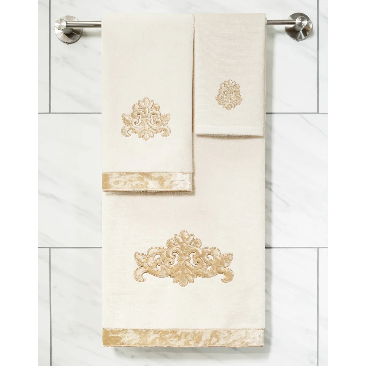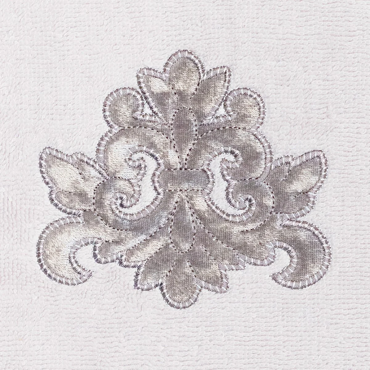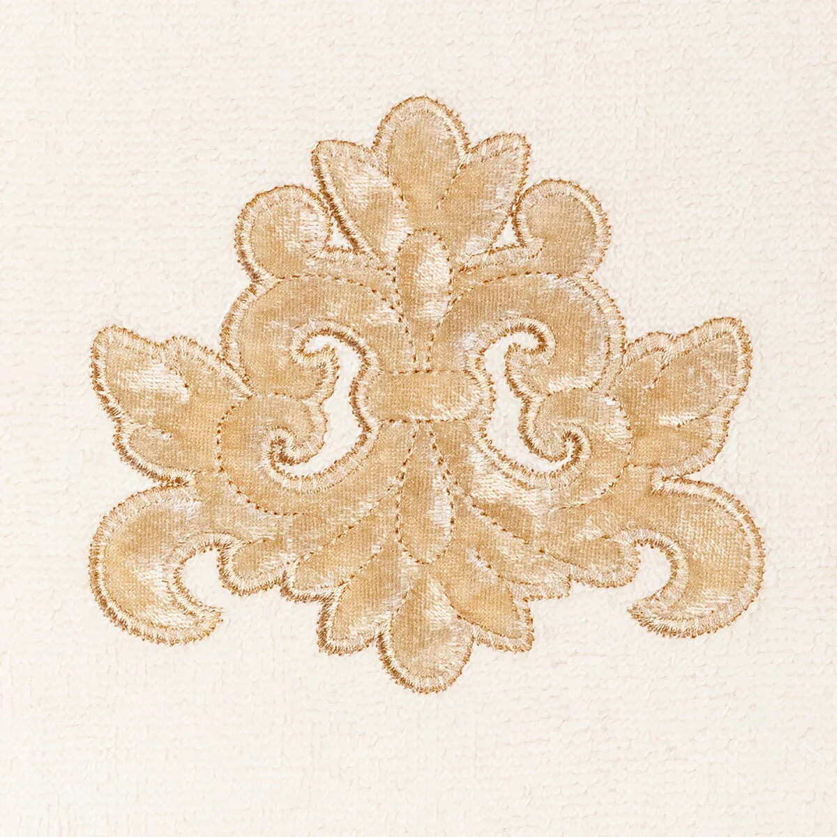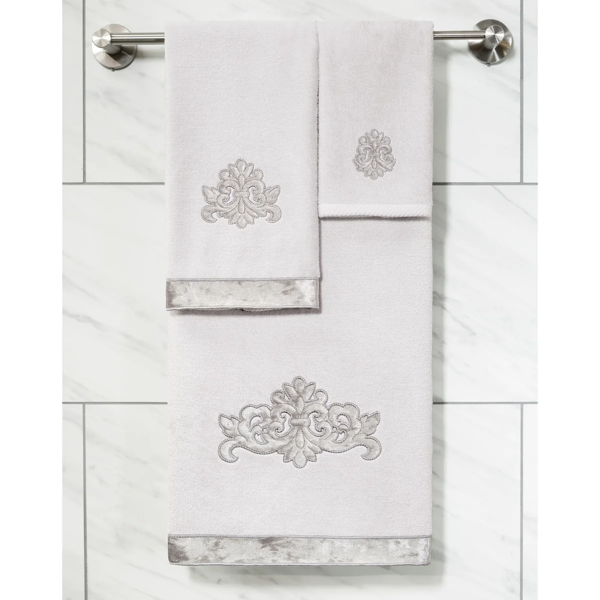 Your decorations are not complete without elegant embroidered towels by Authentic Hotel and Spa for the comfort of your family and guests. The May towels feature a classic velvet crest applique and are trimmed with the same lustrous velvet border. Cloud soft and super absorbent, these luxurious, durable towels keep their plush appearance after washing. This collection is available in 8 elegant colors: White, Beige, Blush, Aqua, Silver, Cocoa, Charcoal and Marine. The May Towel Collection brings a refined spirit and richness to your home decor and makes a great gift.