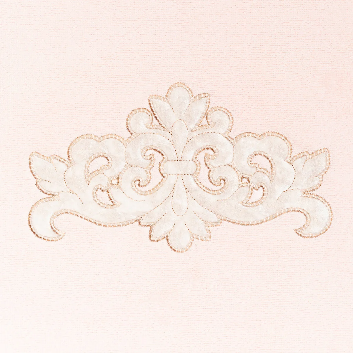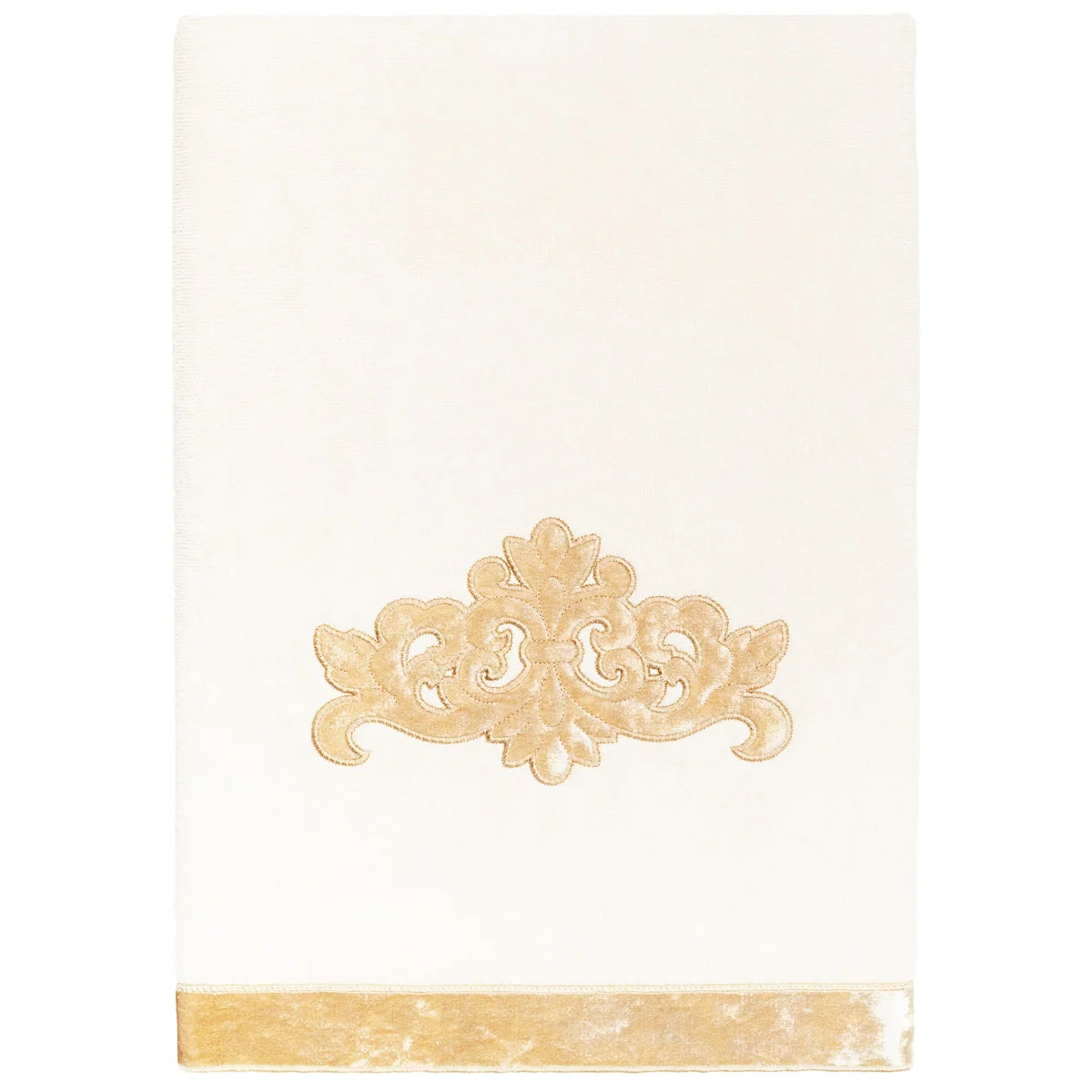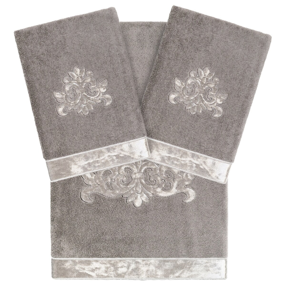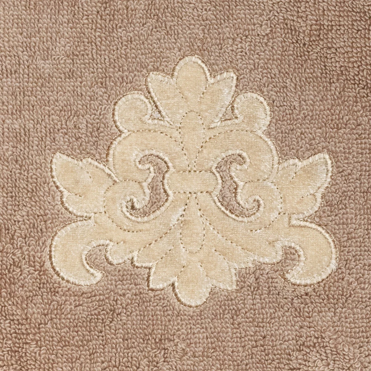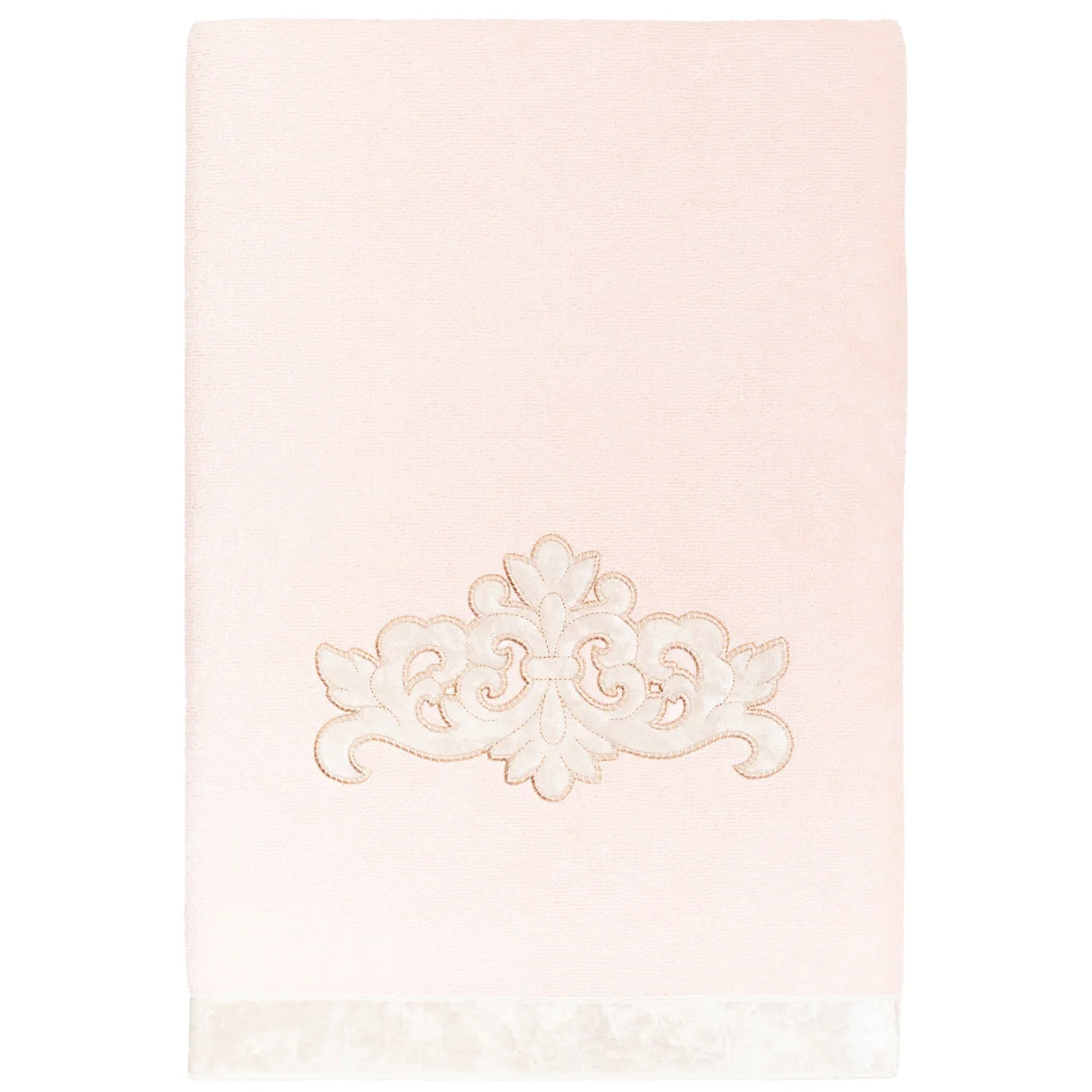 Your decorations are not complete without elegant embroidered towels by Authentic Hotel and Spa for the comfort of your family and guests. The May towels feature a classic velvet crest applique and are trimmed with the same lustrous velvet border. Cloud soft and super absorbent, these luxurious, durable towels keep their plush appearance after washing. This collection is available in 8 elegant colors: White, Beige, Blush, Aqua, Silver, Cocoa, Charcoal and Marine. The May Towel Collection brings a refined spirit and richness to your home decor and makes a great gift.