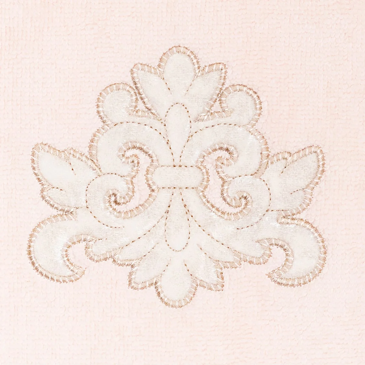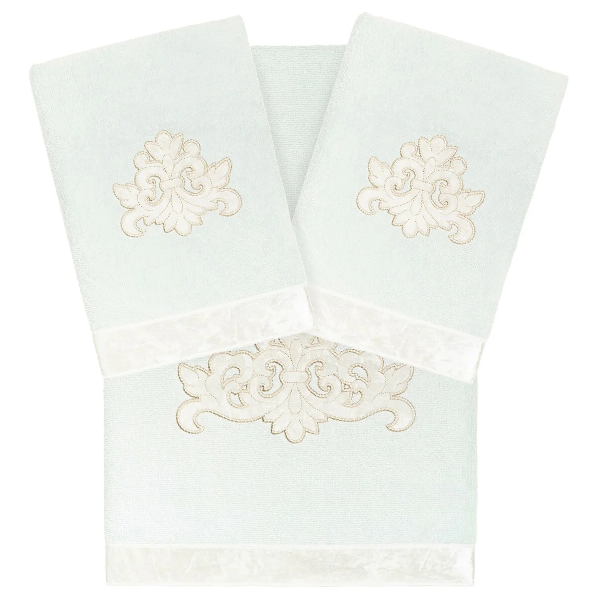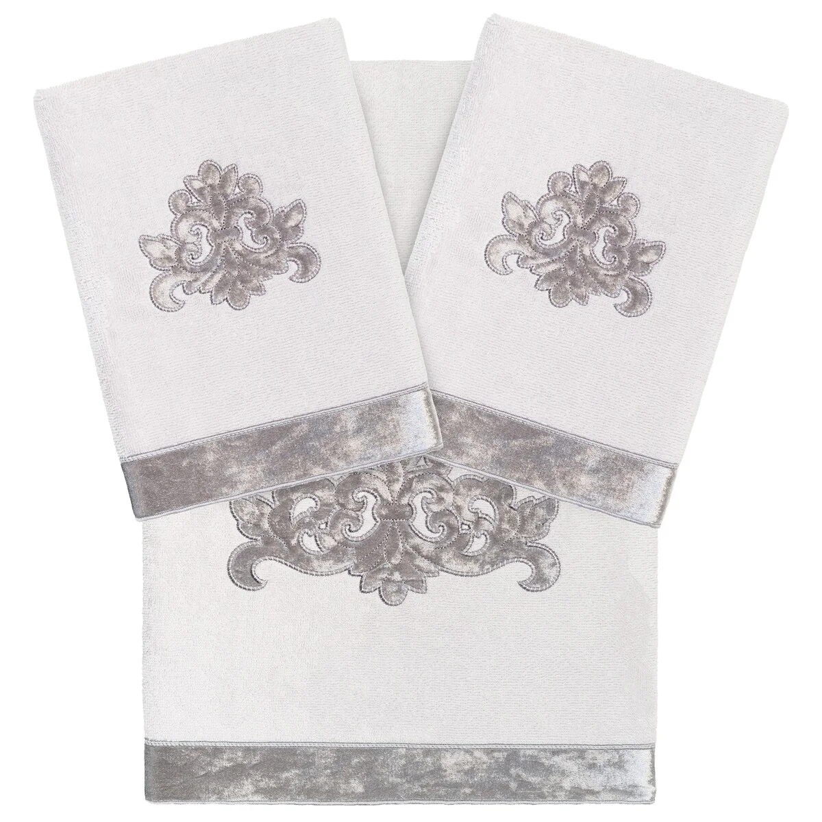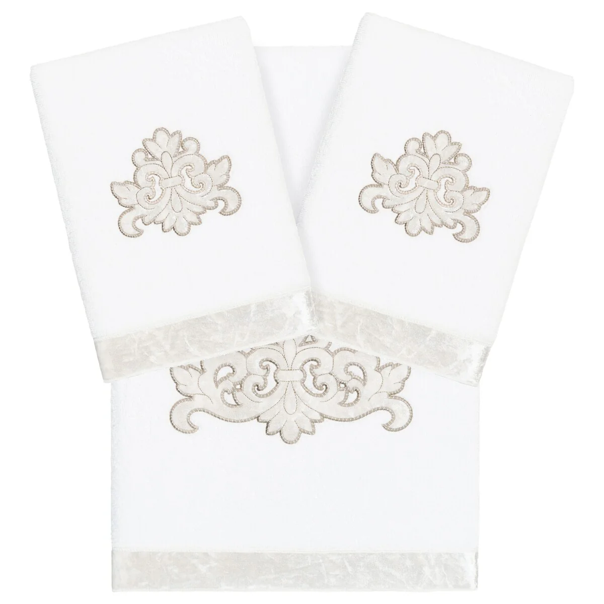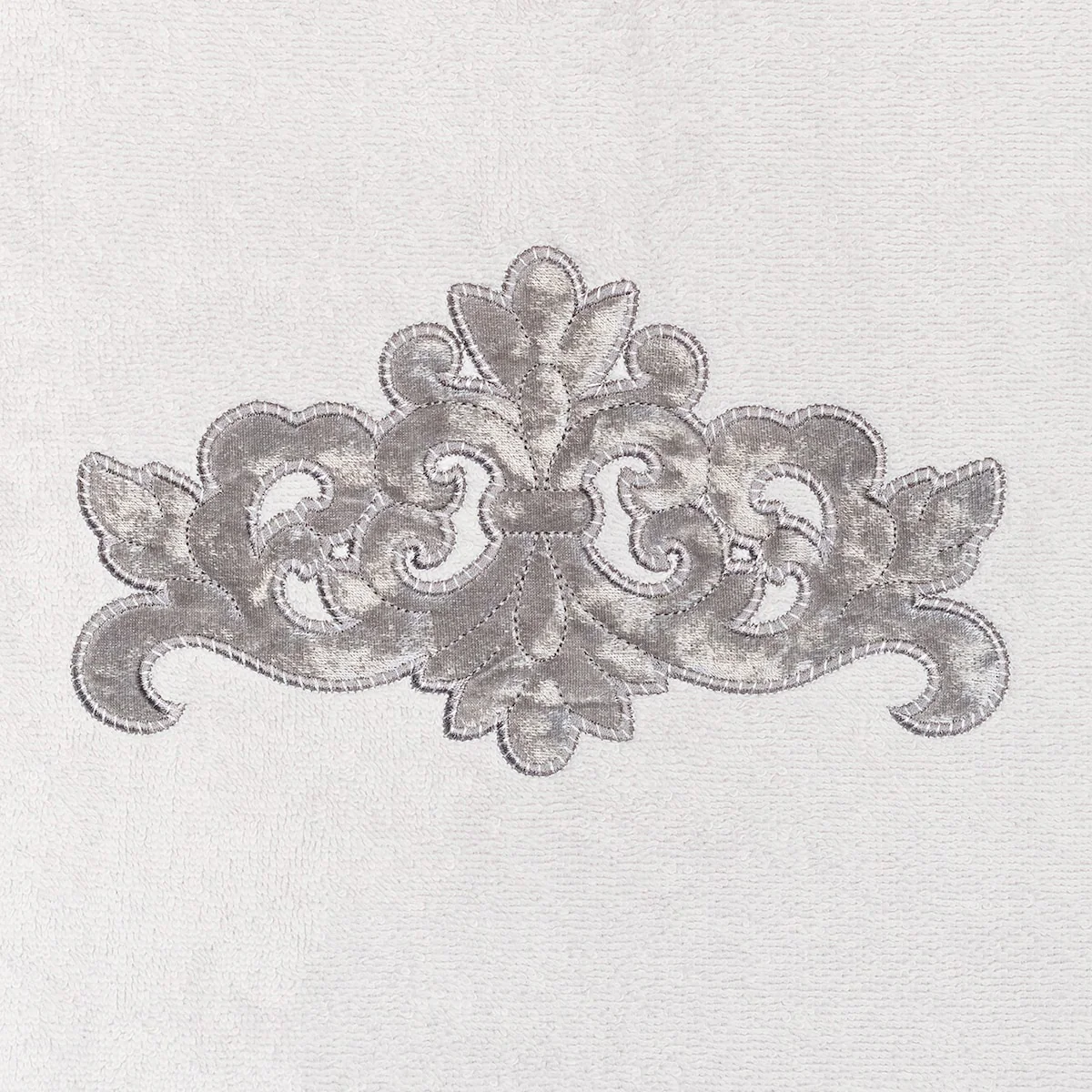 Your decorations are not complete without elegant embroidered towels by Authentic Hotel and Spa for the comfort of your family and guests. The May towels feature a classic velvet crest applique and are trimmed with the same lustrous velvet border. Cloud soft and super absorbent, these luxurious, durable towels keep their plush appearance after washing. This collection is available in 8 elegant colors: White, Beige, Blush, Aqua, Silver, Cocoa, Charcoal and Marine. The May Towel Collection brings a refined spirit and richness to your home decor and makes a great gift.