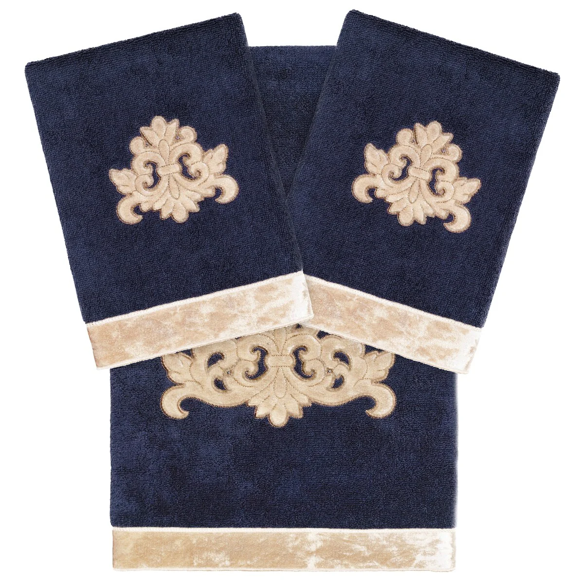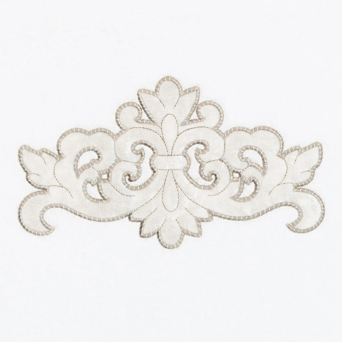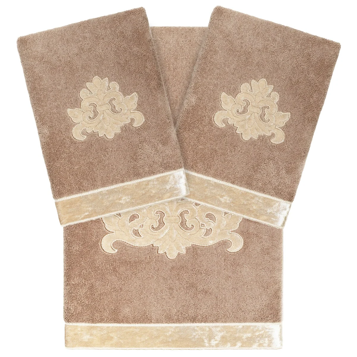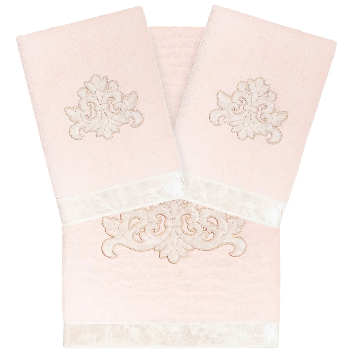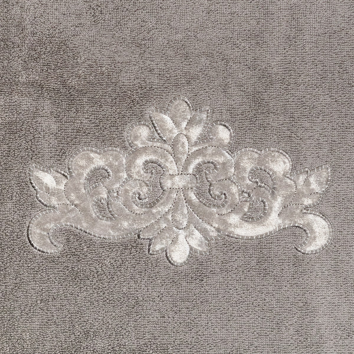 Your decorations are not complete without elegant embroidered towels by Authentic Hotel and Spa for the comfort of your family and guests. The May towels feature a classic velvet crest applique and are trimmed with the same lustrous velvet border. Cloud soft and super absorbent, these luxurious, durable towels keep their plush appearance after washing. This collection is available in 8 elegant colors: White, Beige, Blush, Aqua, Silver, Cocoa, Charcoal and Marine. The May Towel Collection brings a refined spirit and richness to your home decor and makes a great gift.