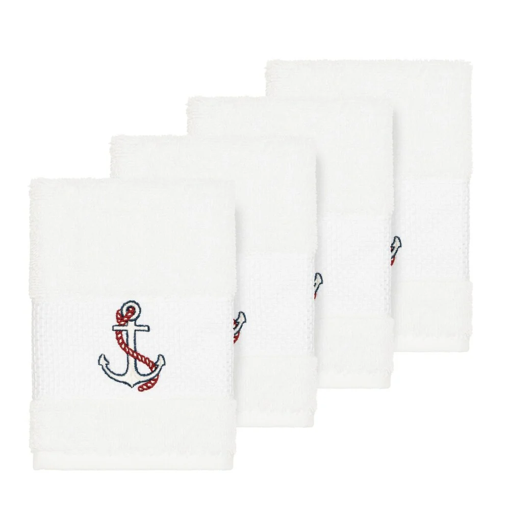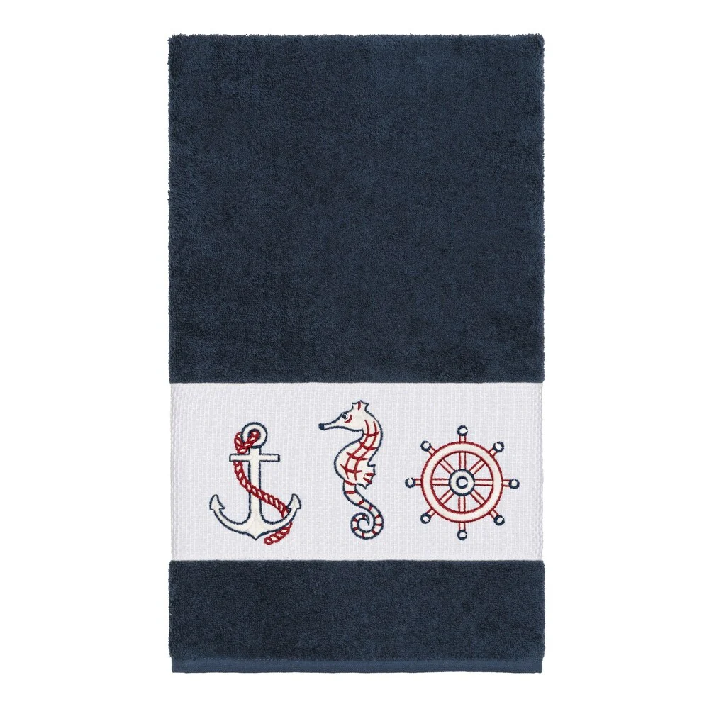 This authentic hotel and spa 4-piece towel set is made from plush, high end Turkish cotton for supreme absorbency and durability. The beautiful midnight blue towels are embellished with a nautical embroidery design to add that special touch to your bathroom.