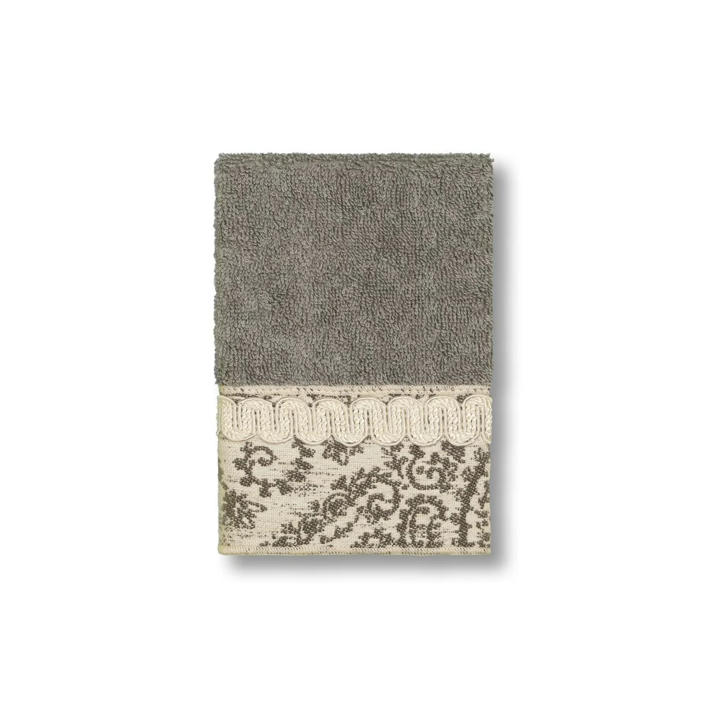This authentic hotel and spa washcloths are made from plush, high end Turkish cotton for supreme absorbency and durability. These beautiful dark grey washcloths are embellished with a grey and ivory paisley jacquard woven patterned border accented by an ivory woven textured gimp trim to add that special touch to your bathroom.