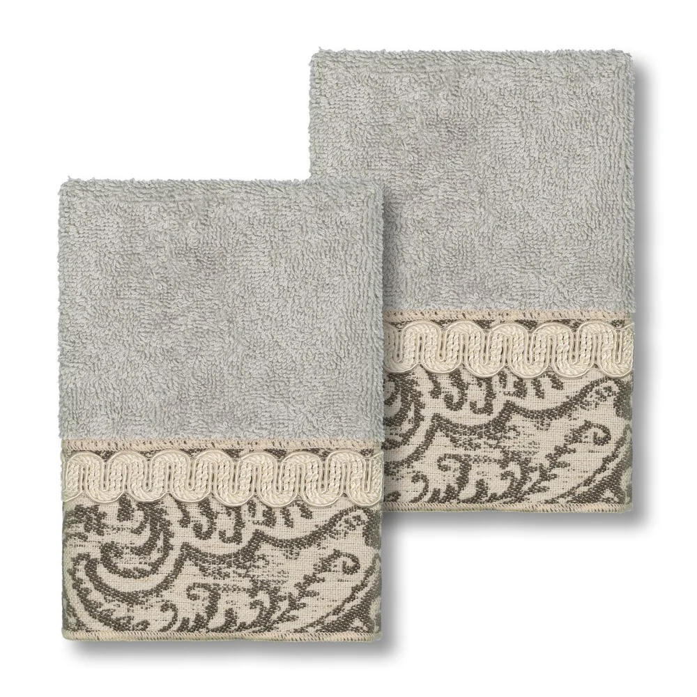 This authentic hotel and spa washcloth is made from plush, high end Turkish cotton for supreme absorbency and durability. This beautiful dark grey washcloth is embellished with a grey and ivory paisley jacquard woven patterned border accented by an ivory woven textured gimp trim to add that special touch to your bathroom.