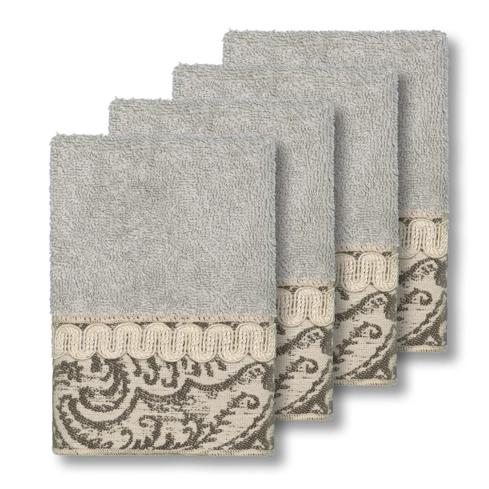 This authentic hotel and spa washcloths are made from plush, high end Turkish cotton for supreme absorbency and durability. These beautiful light grey washcloths are embellished with a grey and ivory paisley jacquard woven patterned border accented by an ivory woven textured gimp trim to add that special touch to your bathroom.