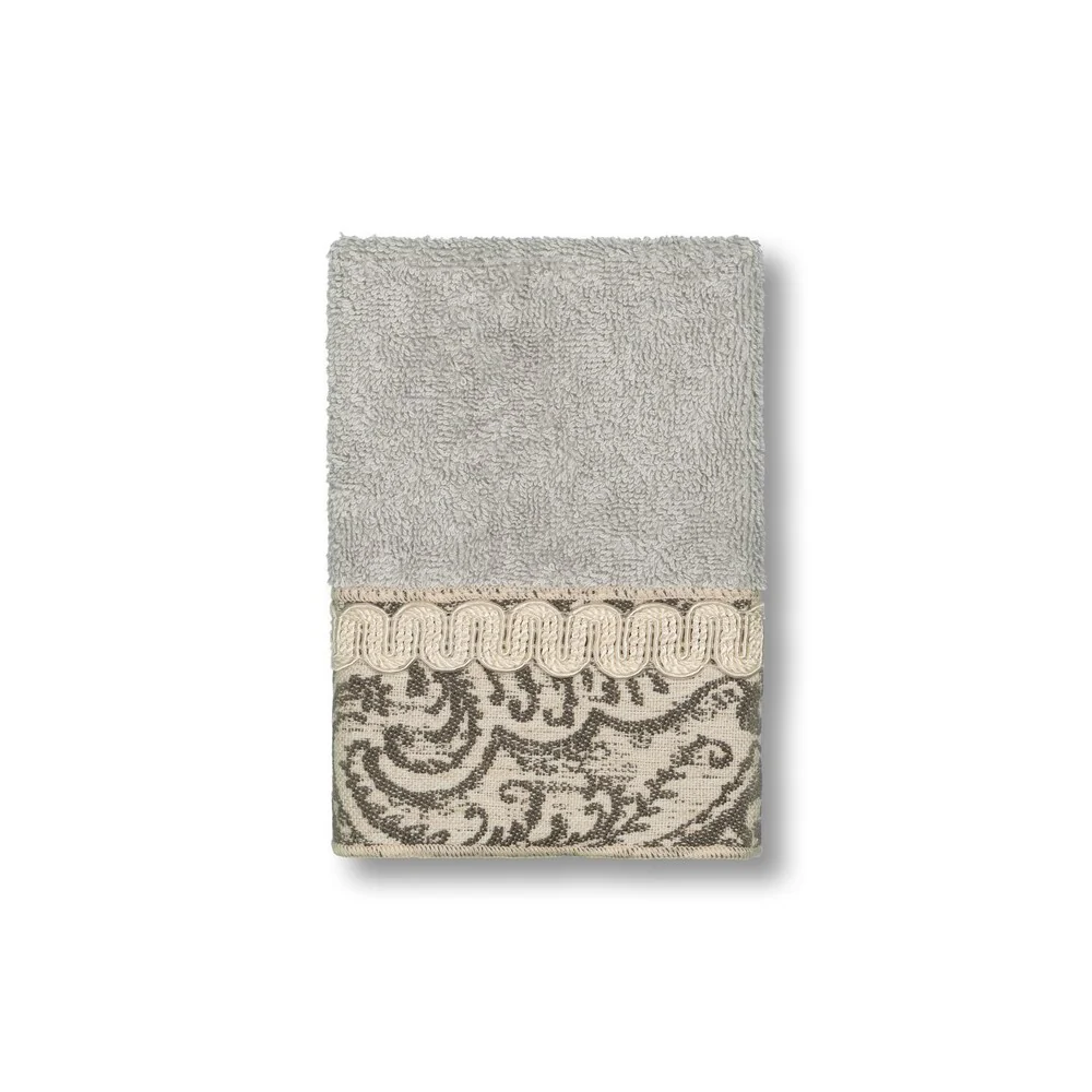 This authentic hotel and spa washcloths are made from plush, high end Turkish cotton for supreme absorbency and durability. These beautiful light grey washcloths are embellished with a grey and ivory paisley jacquard woven patterned border accented by an ivory woven textured gimp trim to add that special touch to your bathroom.