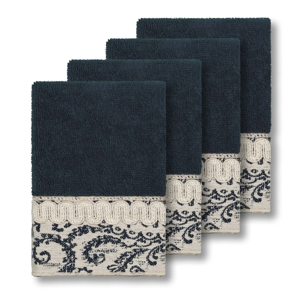 This authentic hotel and spa washcloths are made from plush, high end Turkish cotton for supreme absorbency and durability. These beautiful midnight blue washcloths are embellished with a navy blue and ivory paisley jacquard woven patterned border accented by an ivory woven textured gimp trim to add that special touch to your bathroom.
